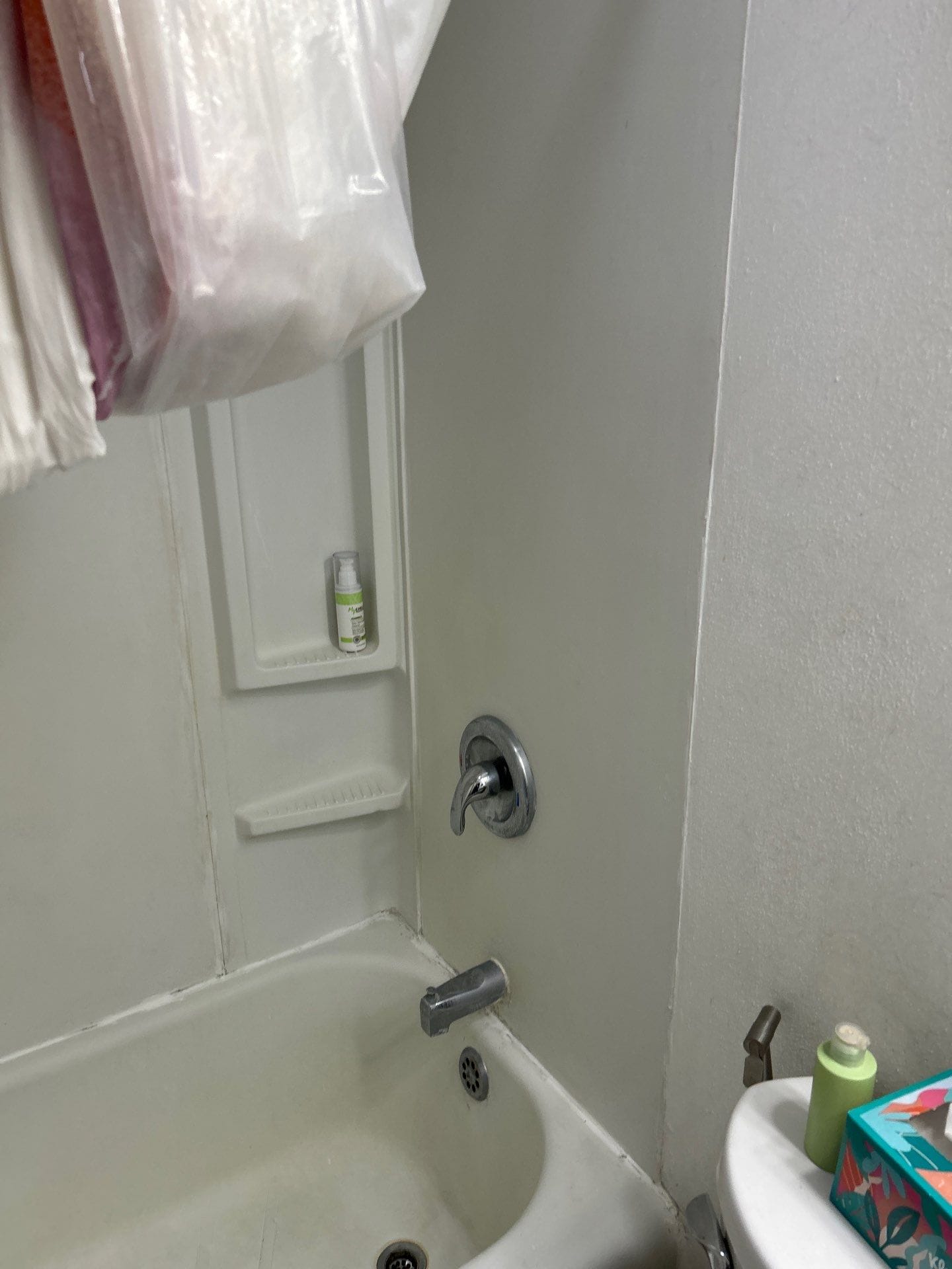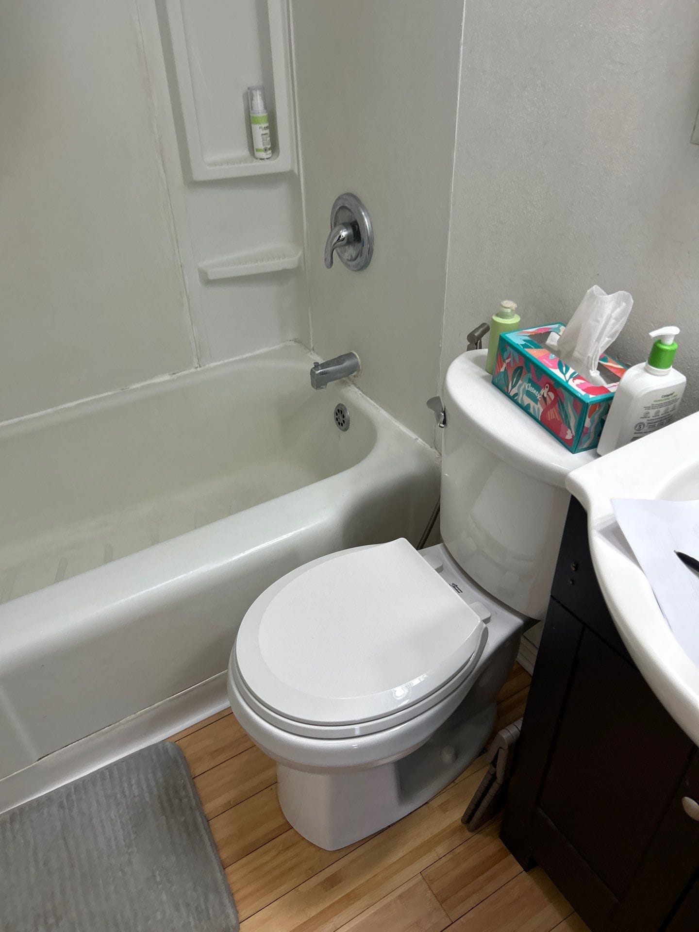 Installation required full removal of the existing tub and wall surround down to the structural framing. The installation team protected surrounding flooring and fixtures before completing demolition and preparing the area for the new system. A custom low-threshold shower base with slip-resistant flooring was installed, followed by the waterproof backer system and grout-free composite wall panels. Corner shelves, grab bar, and a handheld shower system were installed to complete the shower area. The installation process was completed efficiently to restore full functionality to the bathroom.