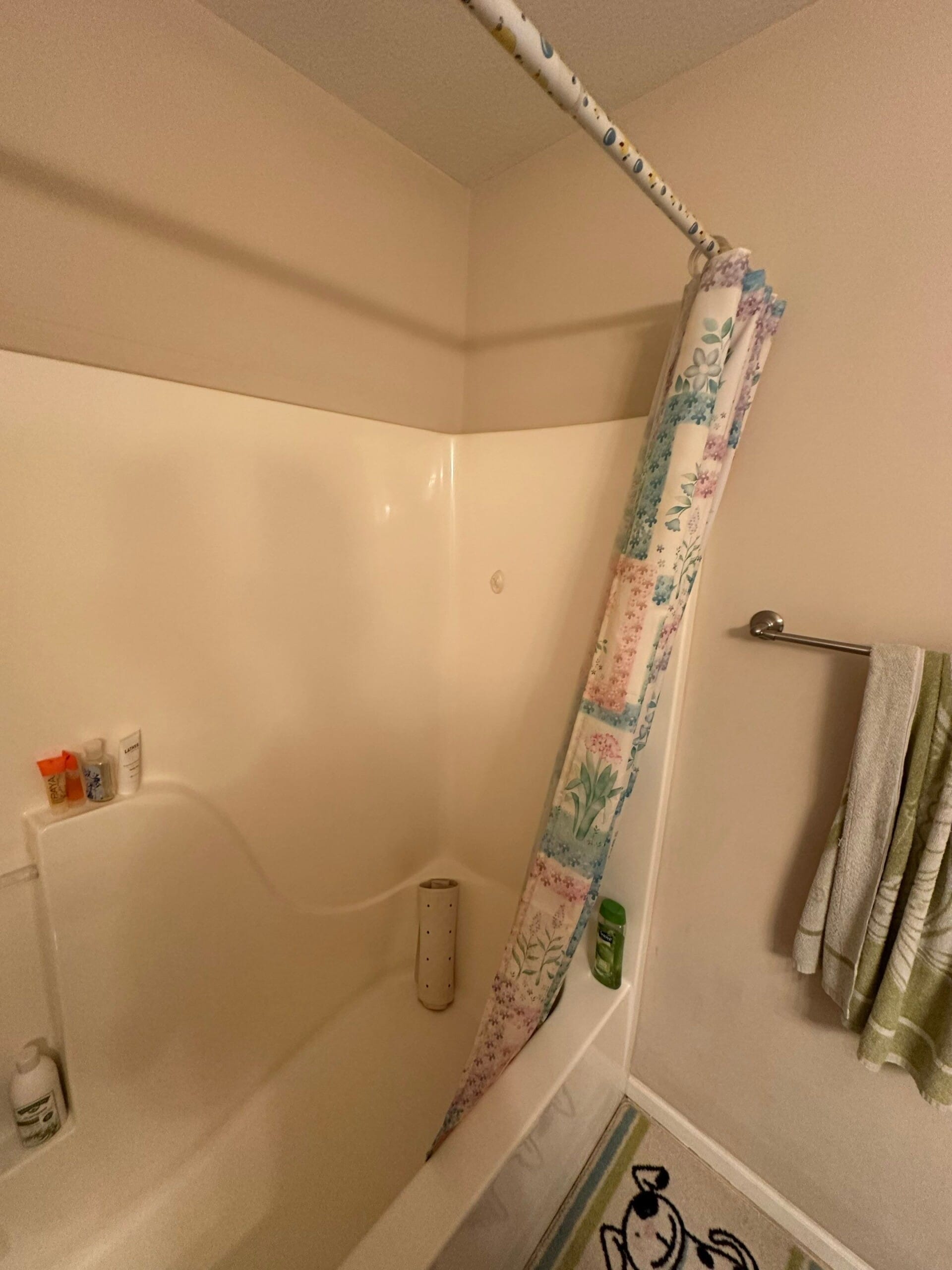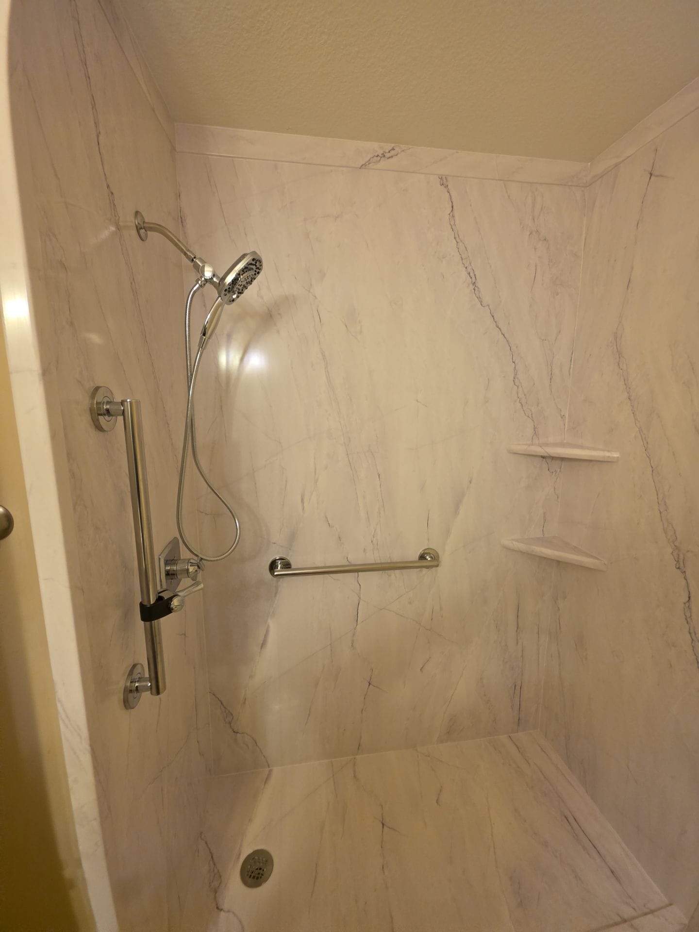 The installation involved full demo of the original tub system, inspection for mold or subfloor damage, and installation of new plumbing and a slip-resistant base. The updated walk-in shower featured a seamless white pearl wall system with marble-like veining, brushed nickel fixtures, dual grab bars, a detachable handheld showerhead, angled shelving, and a future-ready mount location for a teak bench. Despite the customer’s request for gray flooring, the final installation retained the original tan tile floor, which still complemented the clean, neutral aesthetic. All work was completed in a single day with protective measures in place for the home’s flooring and finishes.