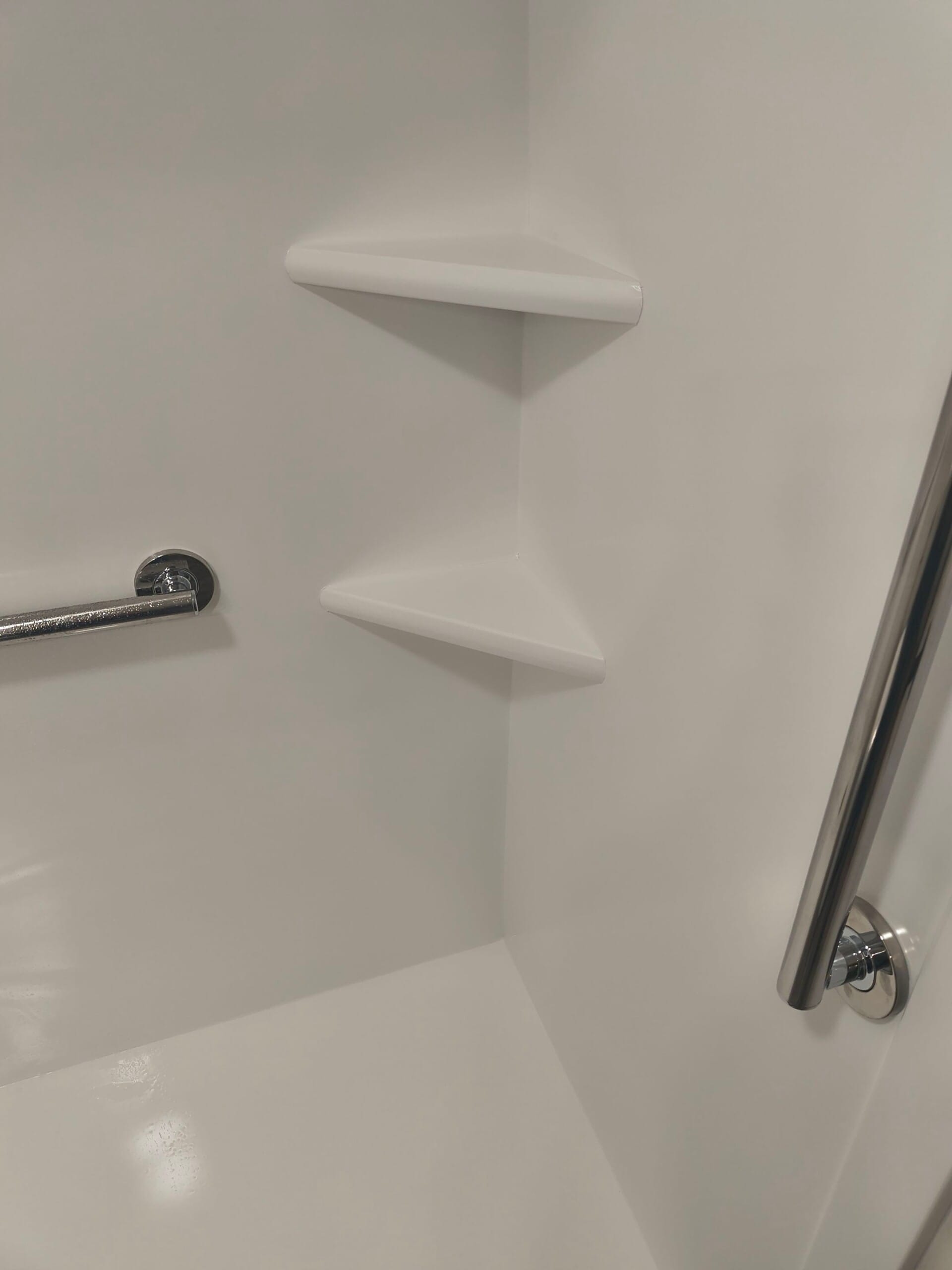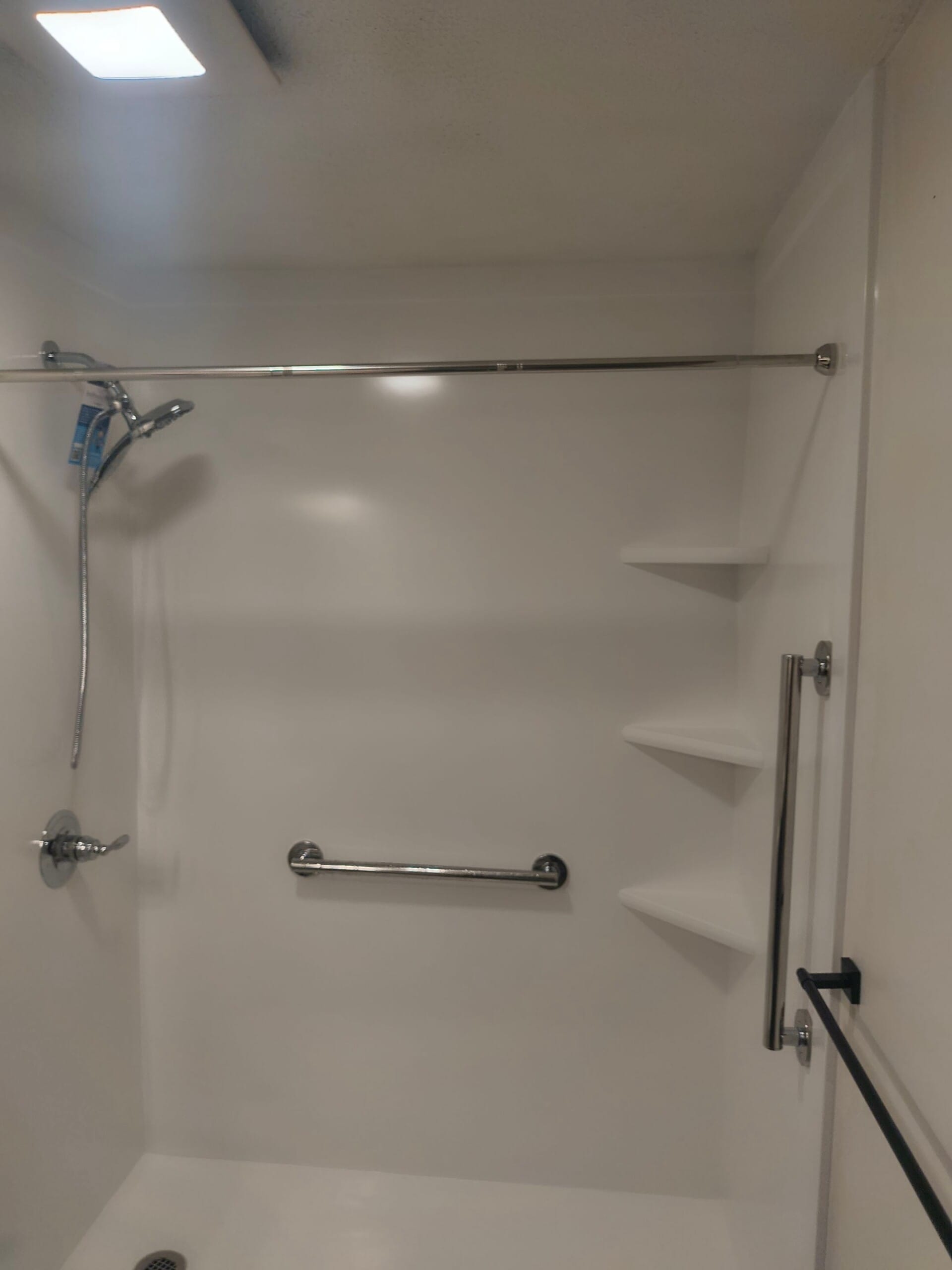 The Five Star Bath Solutions Representative presented a grout-free composite shower wall system designed for durability and easy maintenance. Smooth white wall panels were selected to create a clean, bright appearance while eliminating grout lines that collect moisture and buildup. The design incorporated integrated corner shelving for convenient storage and strategically placed safety grab bars to provide additional stability when entering or exiting the shower. A chrome handheld shower system with adjustable hose was included to support seated or standing shower use and improve overall accessibility.