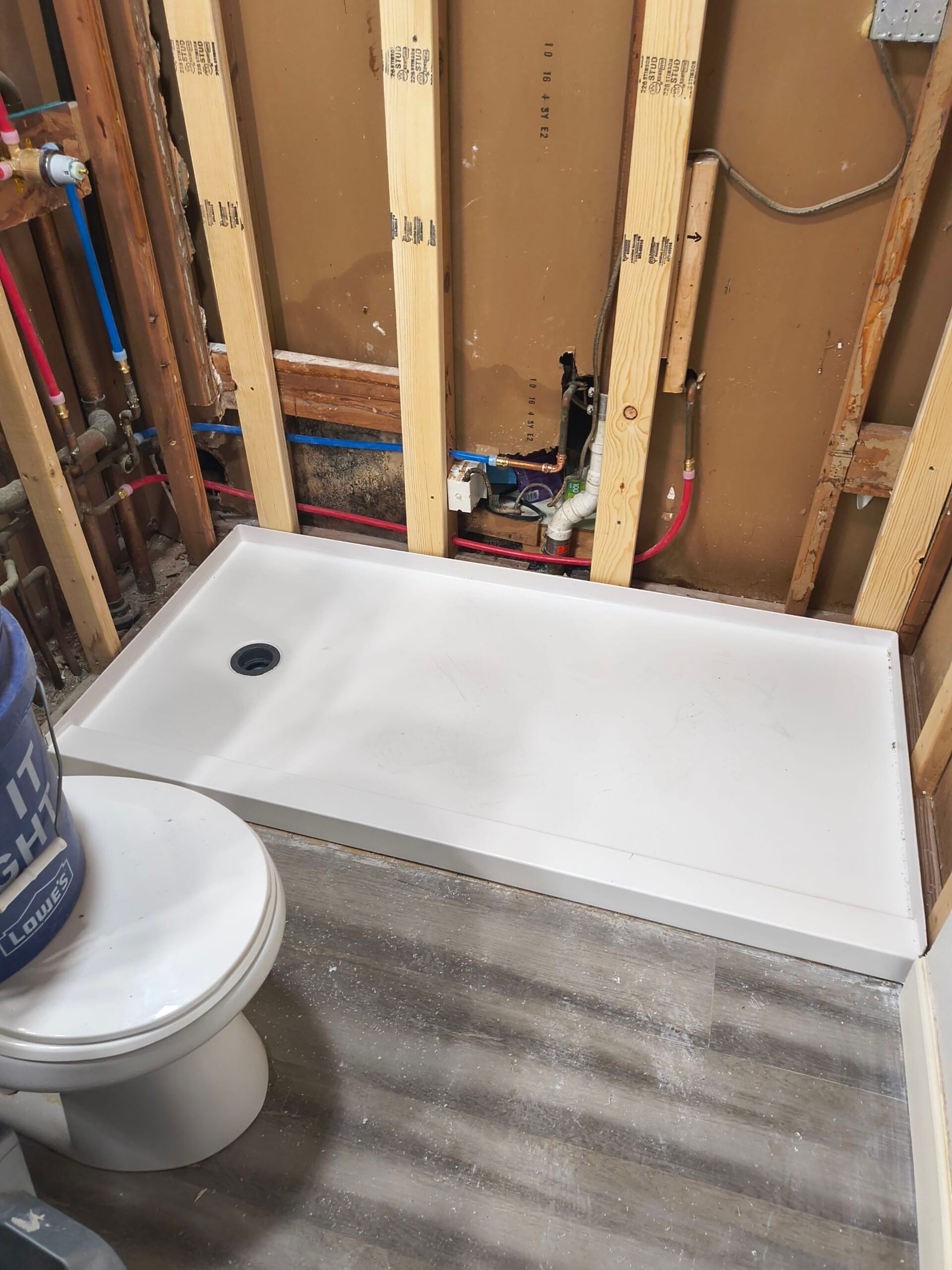 Installation involved removal of the existing bathtub and surround, preparation of the wall structure, and installation of a new low-threshold shower base with waterproof backing and composite wall panels. Plumbing connections and fixtures were updated during the process, and the shower system, safety bars, shelving, and curtain rod were installed to complete the space. The installation team maintained a protected worksite throughout demolition and construction and completed the renovation within a short installation window typical for this type of shower conversion.