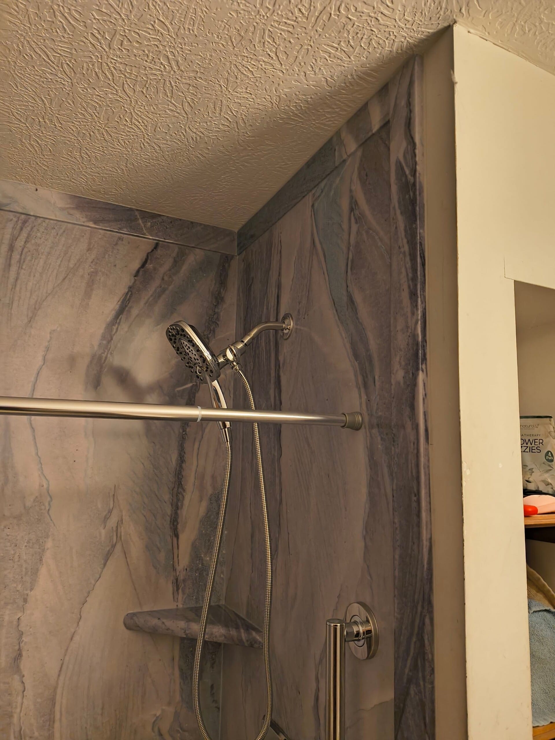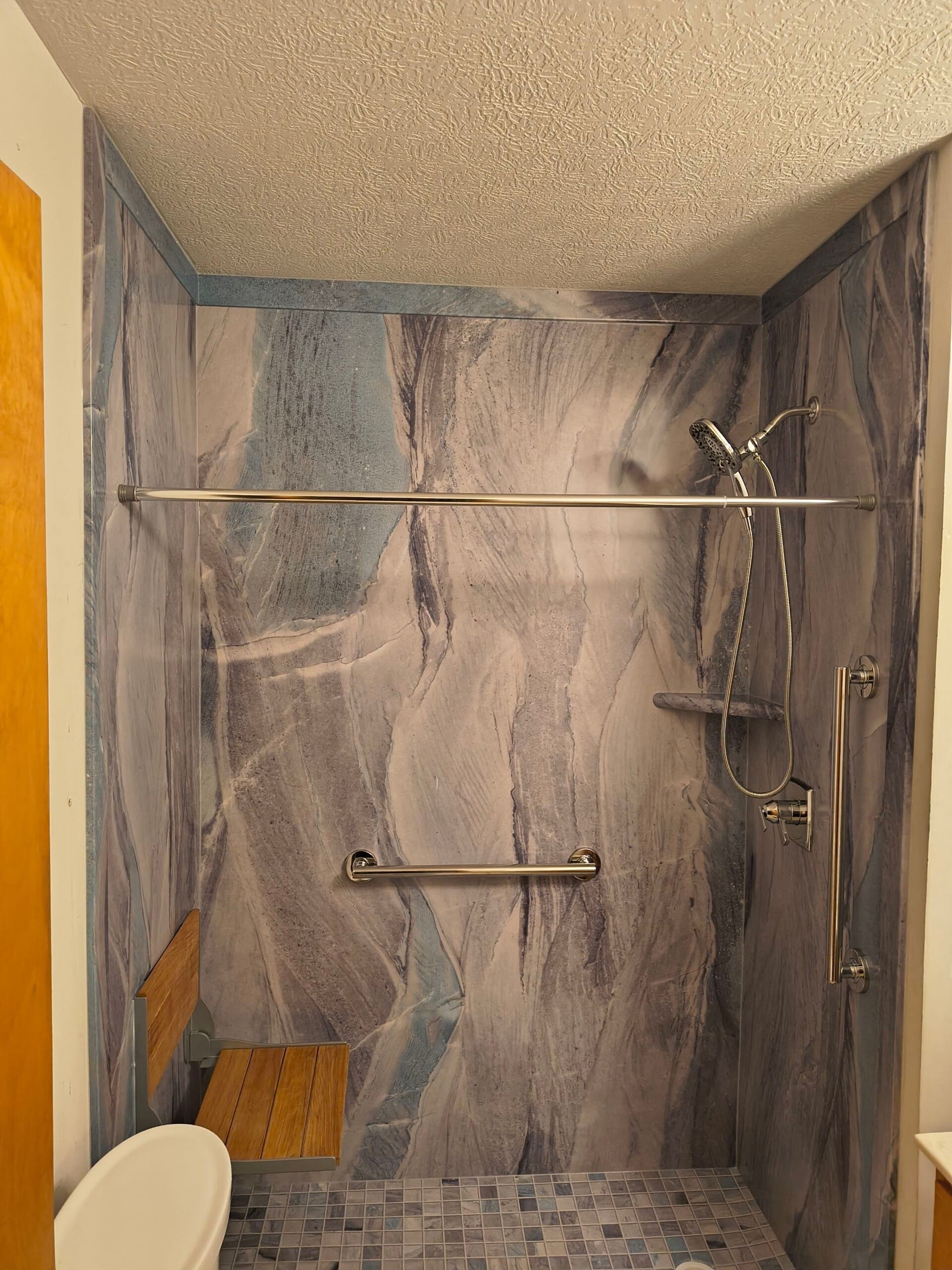 The Five Star Bath Solutions representative presented a grout-free composite wall system in a bold stone-look pattern, replacing the previous plain acrylic surround with a more modern and visually dynamic finish. The updated design includes a low-threshold shower base with a coordinated mosaic-style floor for added slip resistance, a fold-down bench seat for seated bathing, and strategically placed grab bars for stability. Chrome fixtures were selected, including a dual-function showerhead with a long handheld hose mounted on an adjustable slide bar, along with integrated corner shelving for accessible storage.