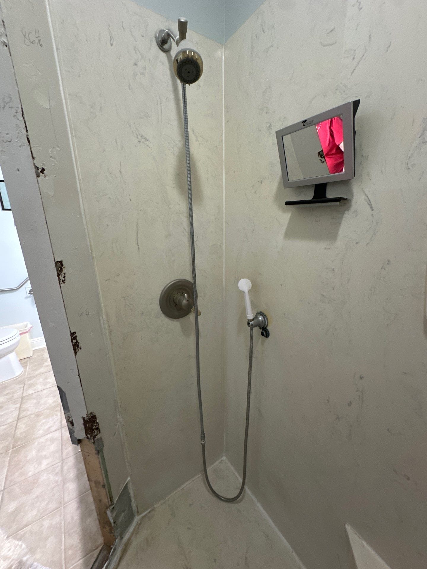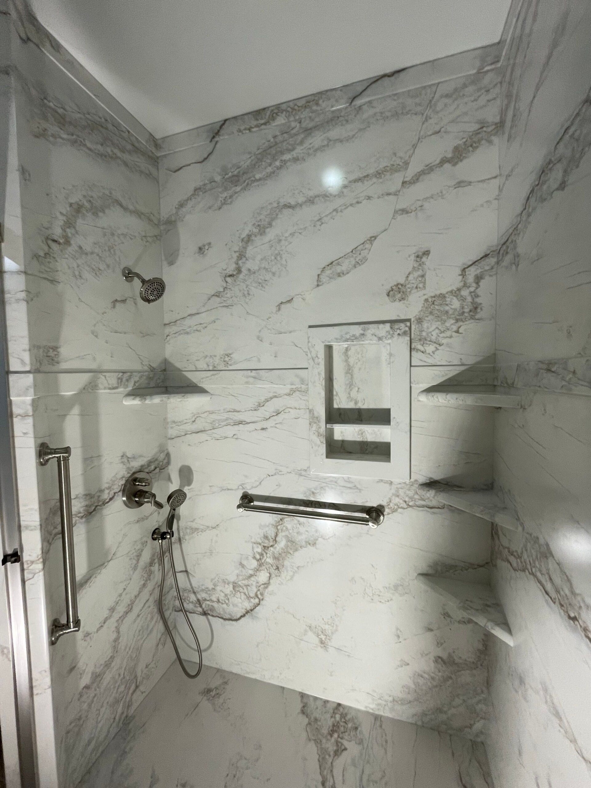 The Five Star Bath Solutions Representative presented a grout-free composite wall system designed for durability, low maintenance, and a high-end appearance. The selected Calacatta-style wall panels feature a bold marble pattern that extends to the ceiling, creating a seamless and cohesive look. The system includes a non-porous, antimicrobial surface that eliminates grout lines and reduces the risk of mold buildup. Brushed nickel fixtures were installed, including a handheld shower system, along with multiple integrated corner shelves and a recessed niche for organized storage. A horizontal grab bar was added for safety, and a clear glass sliding enclosure with matching hardware completed the updated design.