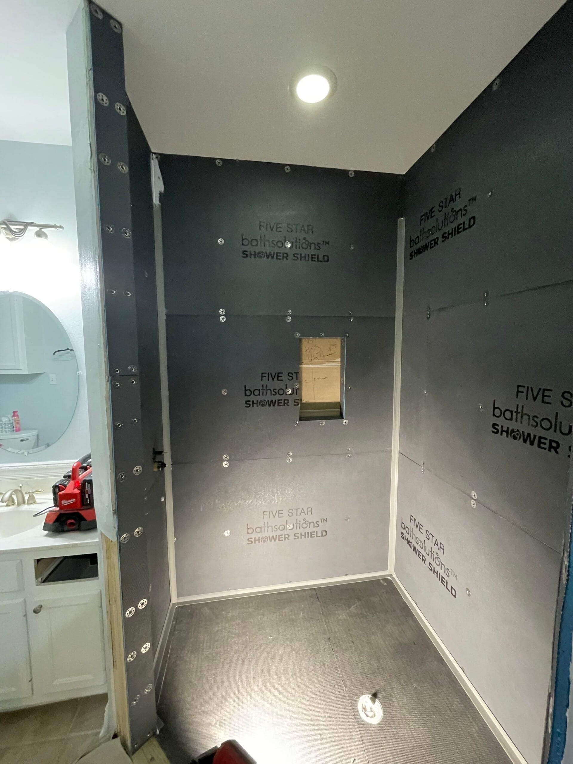 The installation process included removal of the existing shower materials down to the framing, followed by preparation of the space with waterproof backer systems and updated plumbing components. The new custom shower base, full-height wall panels, fixtures, and enclosure were installed with precision. Structural reinforcement was added behind the walls to support safety features and accessories. The project was scheduled several weeks after approval, with the on-site installation completed within one to two days.