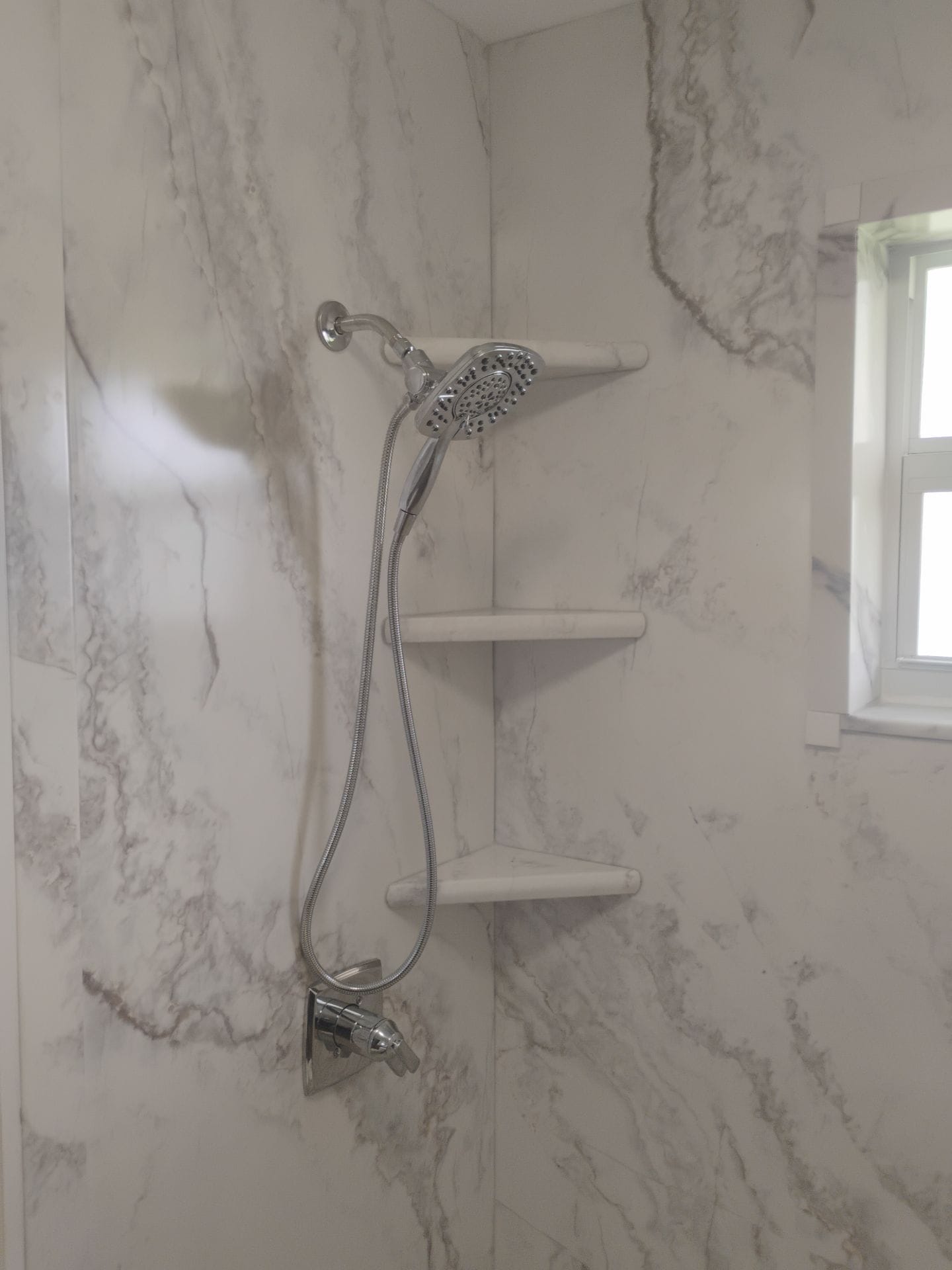 The Five Star Bath Solutions representative introduced a grout-free wall system made from proprietary composite material designed to resist mold and staining while maintaining long-term performance. The selected design featured a full-height marble-look surround in neutral white tones, paired with a handheld chrome fixture. To enhance usability and reduce clutter, corner shelving was built directly into the wall panels. Emphasis was placed on material durability and seamless finishes to prevent water infiltration over time.