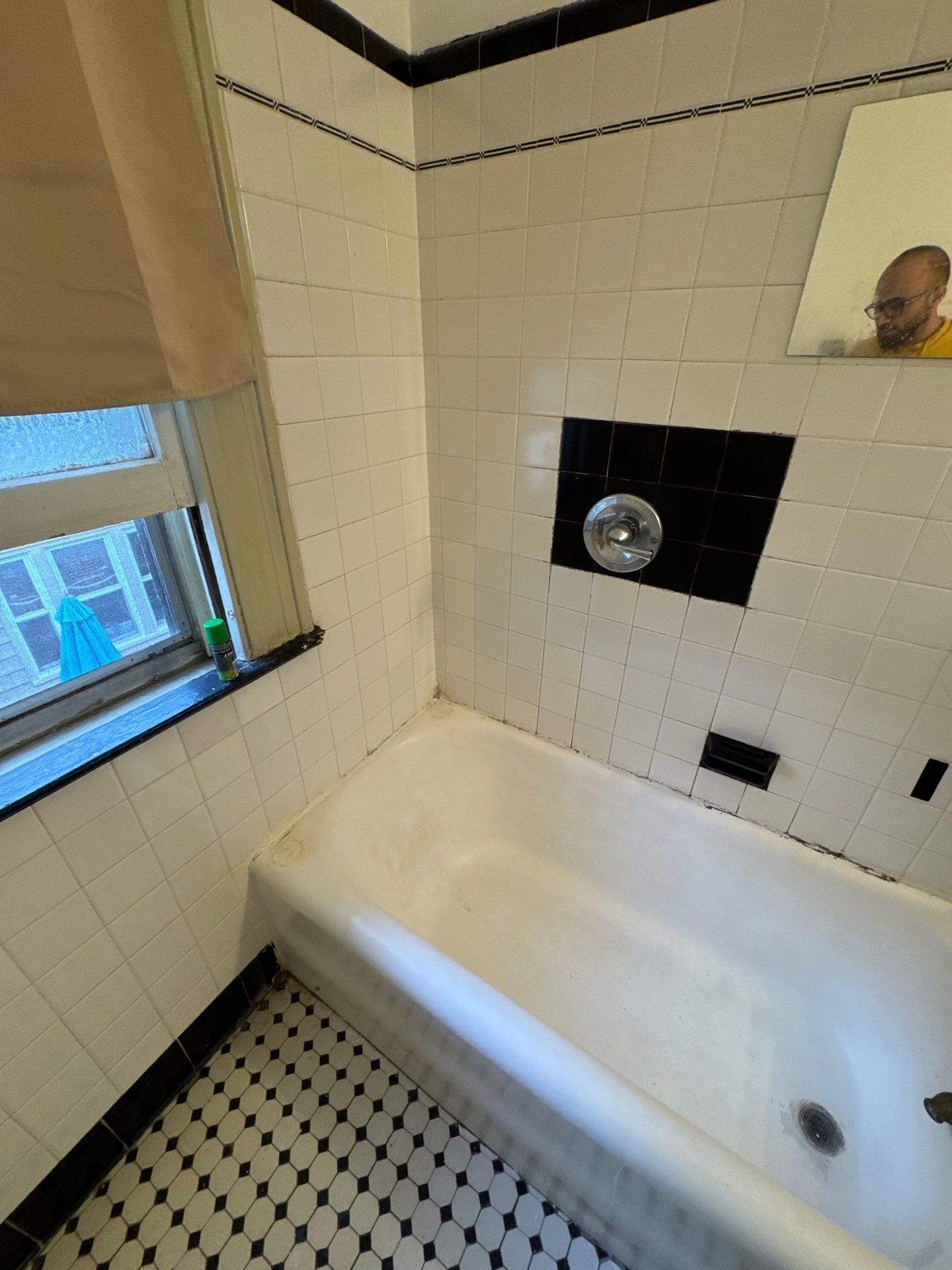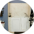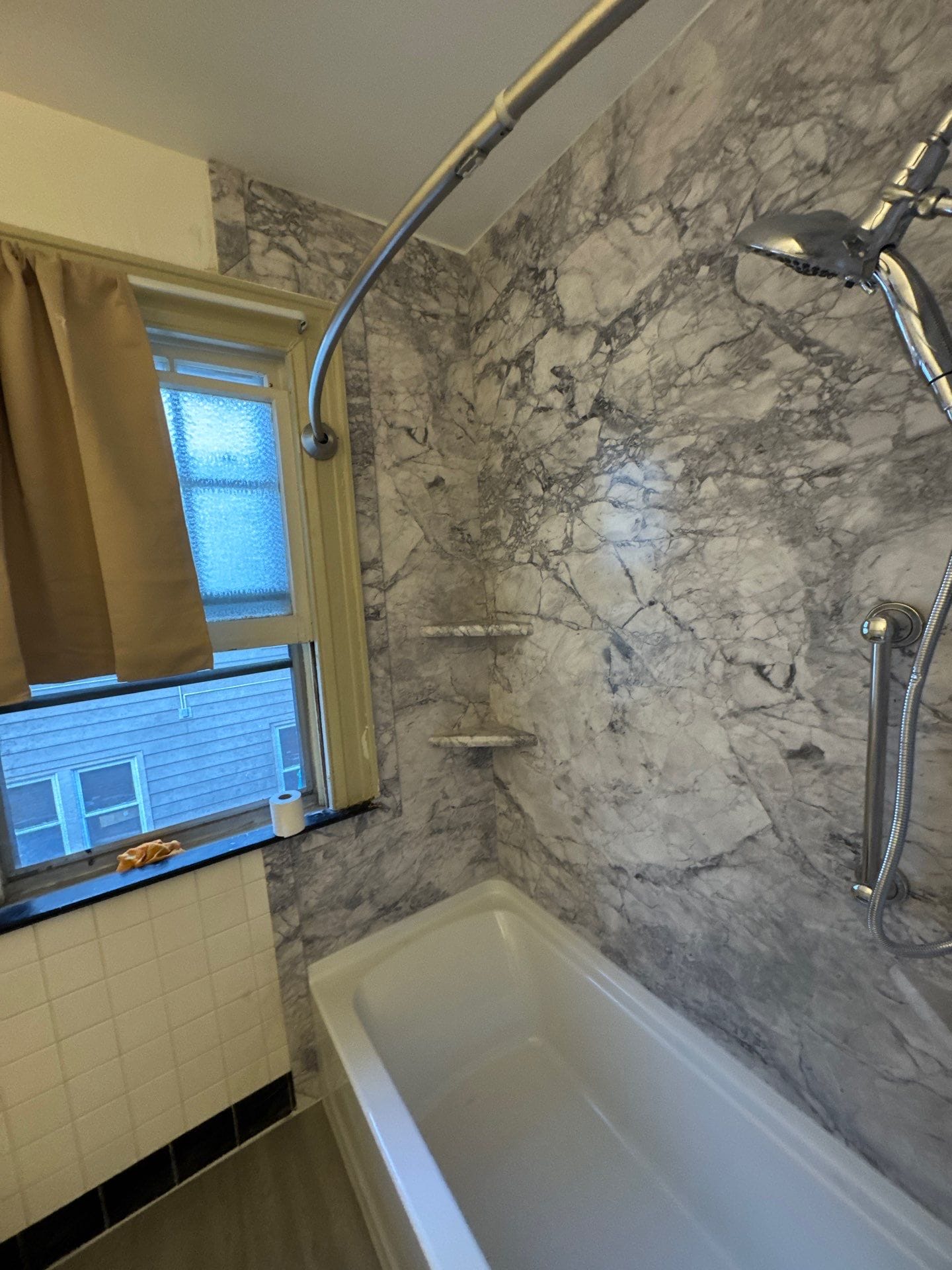 Installation involved full demolition of the old tile walls and fixture trim, inspection of the subfloor and framing, and installation of all new plumbing fittings. The tub basin itself was replaced with a modern acrylic unit featuring a molded interior and updated overflow configuration. A veined marble-look composite wall panel system was selected to brighten the enclosure without heavy contrast. Grab bars were securely anchored into the studs, and a wall-mounted folding seat was added for occasional seated use. The installation process was completed within two days, with custom fabrication and scheduling built into a standard four-to-six week lead time.