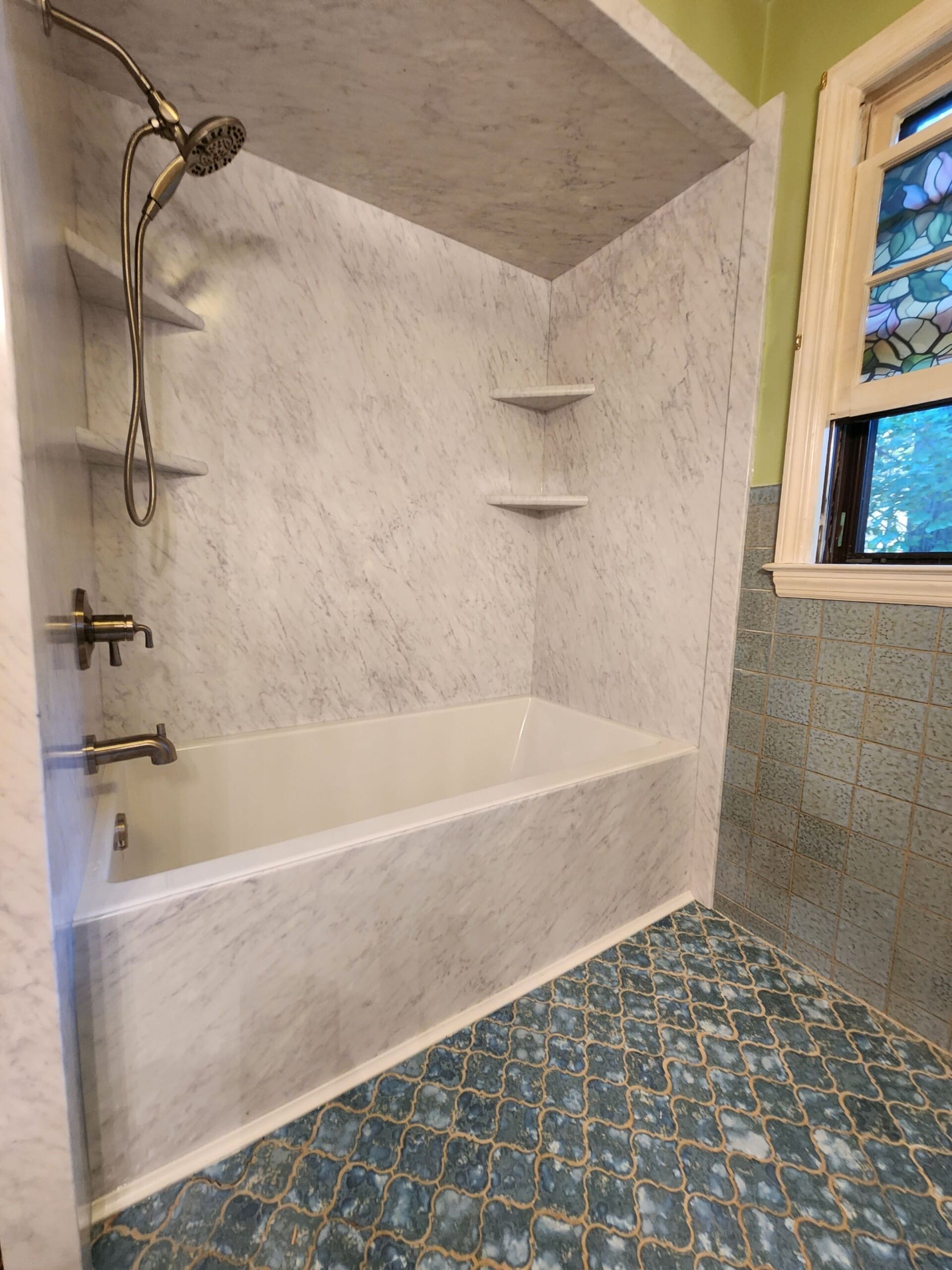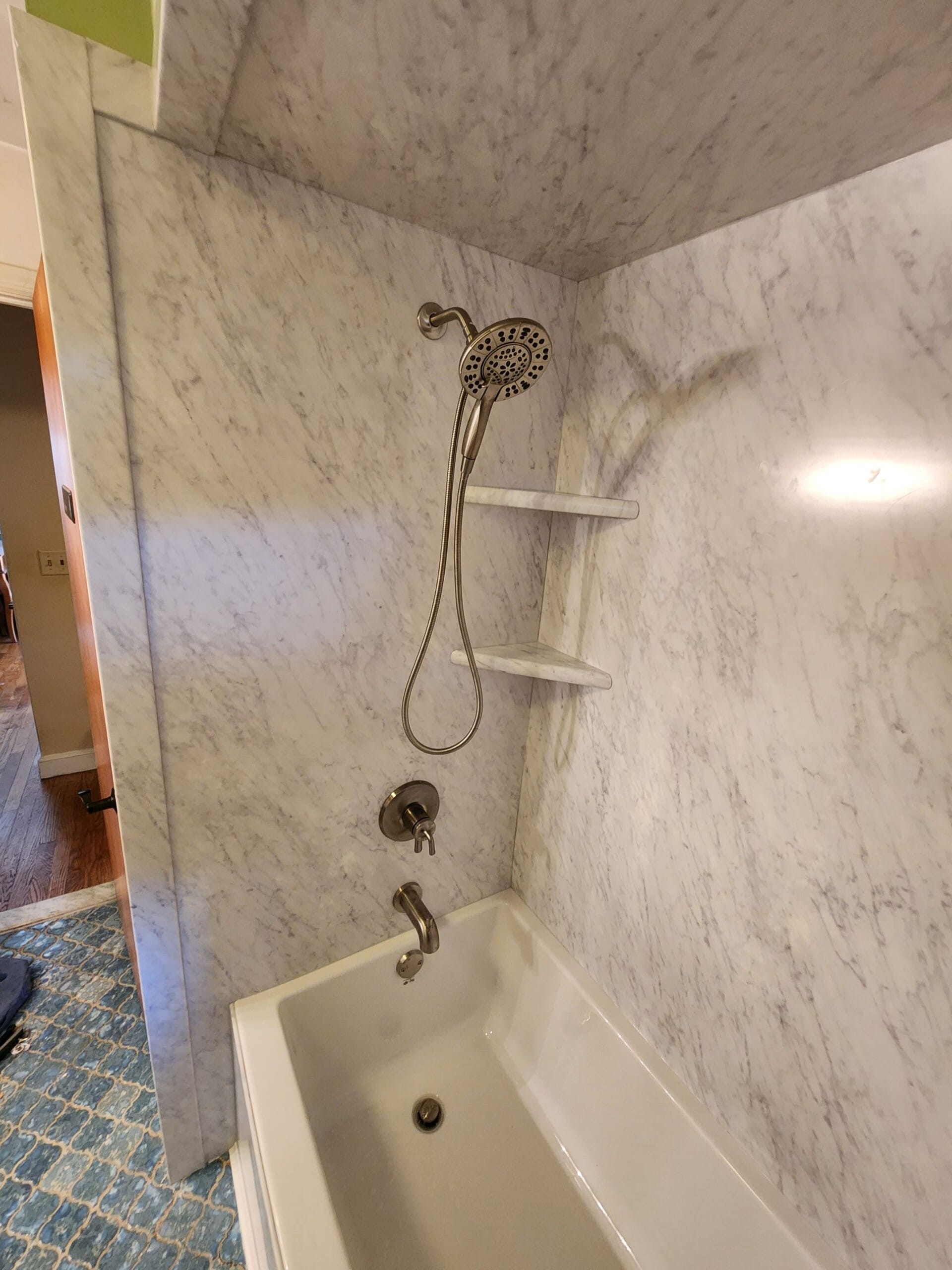 Ahmed Elcott from Five Star Bath Solutions met with the family to assess the project and explained that the company would remove the old cast iron tub, all wall tiles, and flooring down to the studs, inspect for water damage or mold, and replace the plumbing and drain lines before building a new walk-in shower system. He used a moisture meter to show that the wall around the tub had readings as high as 75%, indicating trapped moisture and possible mold. Ahmed recommended replacing the materials with Five Star’s Smart Choice wall system, a six-layer composite that looks like stone, is completely waterproof, non-porous, antimicrobial, and resistant to mold and mildew. He also explained that the system includes non-slip shower pans, corner shelves, and folding or fixed seats, depending on preference. The customer selected a fixed soaking tub with Smart Choice walls and added corner shelves for convenience. Ahmed shared that Five Star Bath Solutions began in 1996, operates 108 locations across the U.S. and Canada, and has a local franchise based in New Britain with a warehouse in North Haven, emphasizing that the company is fully licensed, insured for $2 million, and certified with an A+ BBB rating.