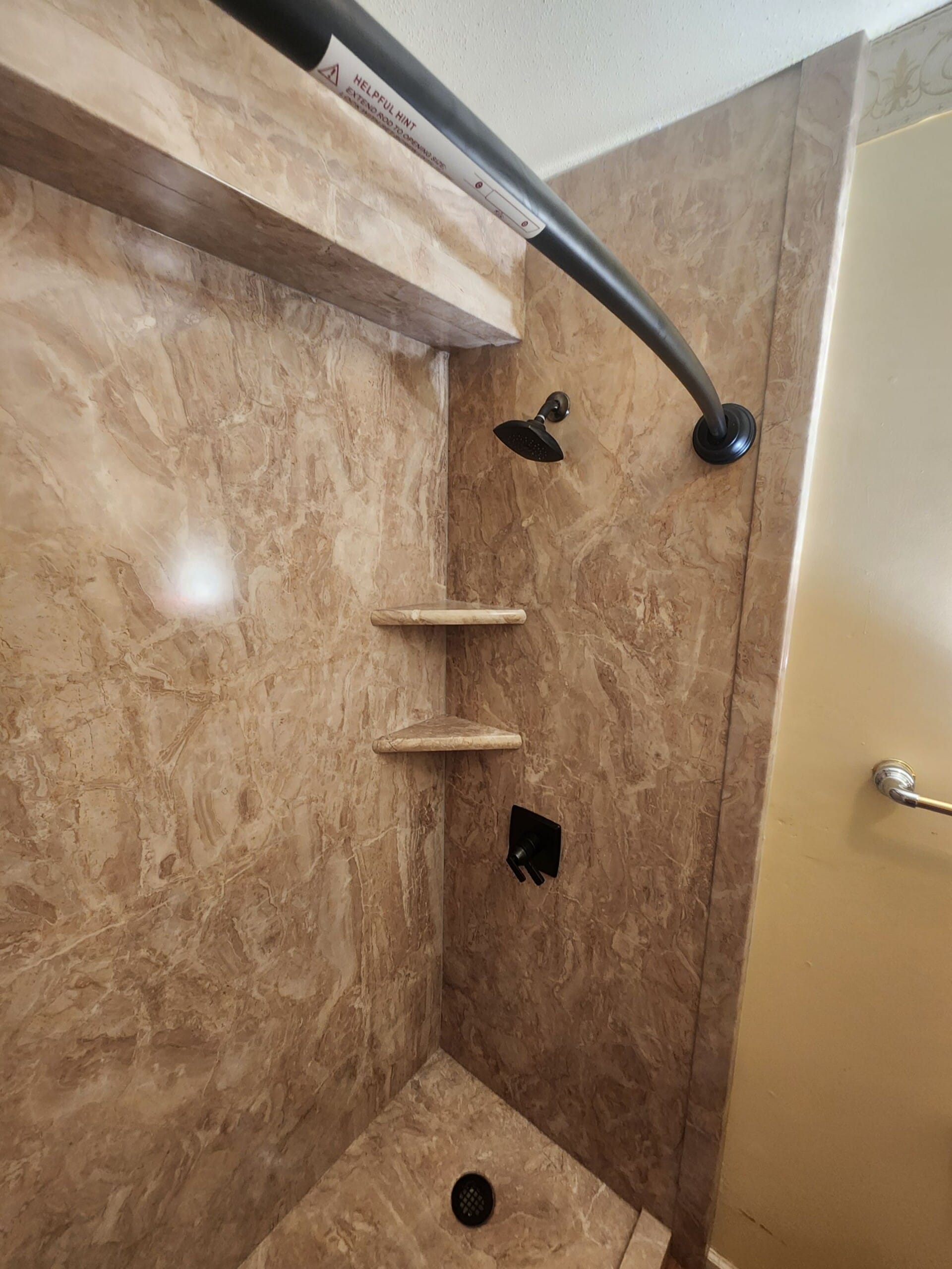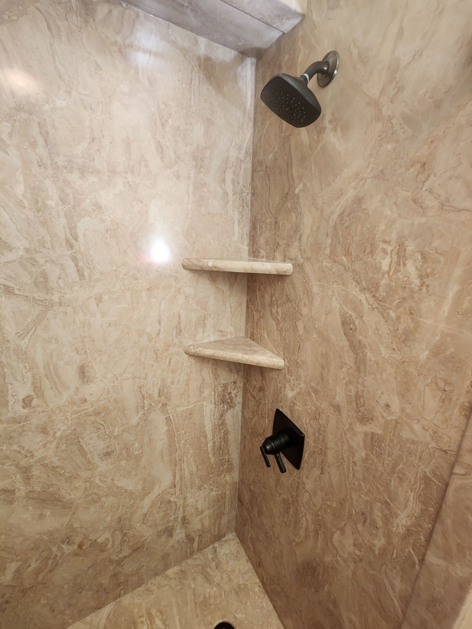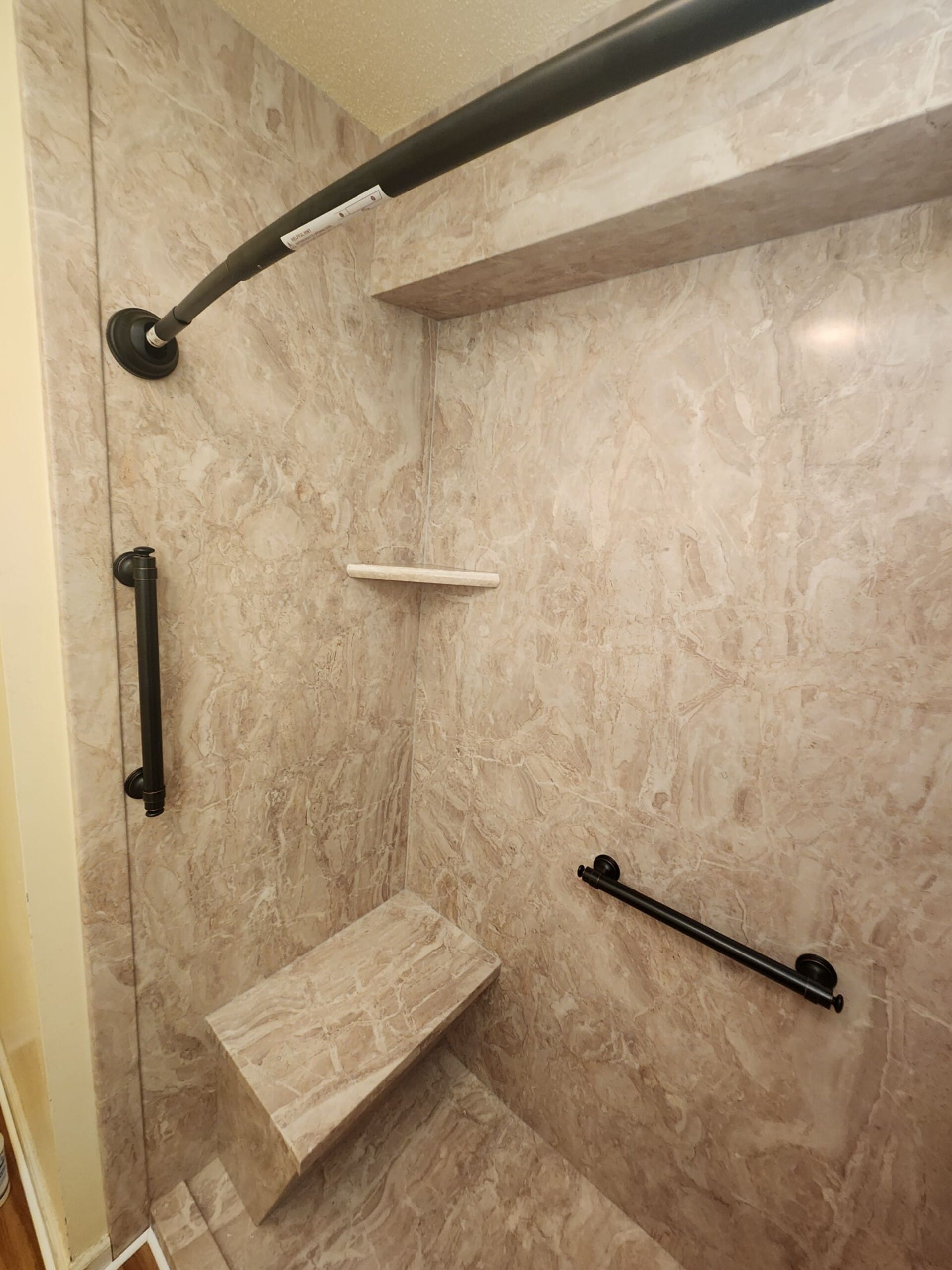 The remodel replaced the original tile-and-tub enclosure with a custom walk-in shower featuring full-height, marble-styled composite wall panels. A matte black showerhead and matching control valve were installed for contrast and modern appearance. Two integrated corner shelves were added for product storage, along with a solid bench seat for seated showering. Safety was addressed through the inclusion of two black grab bars, one vertically mounted and one horizontal.