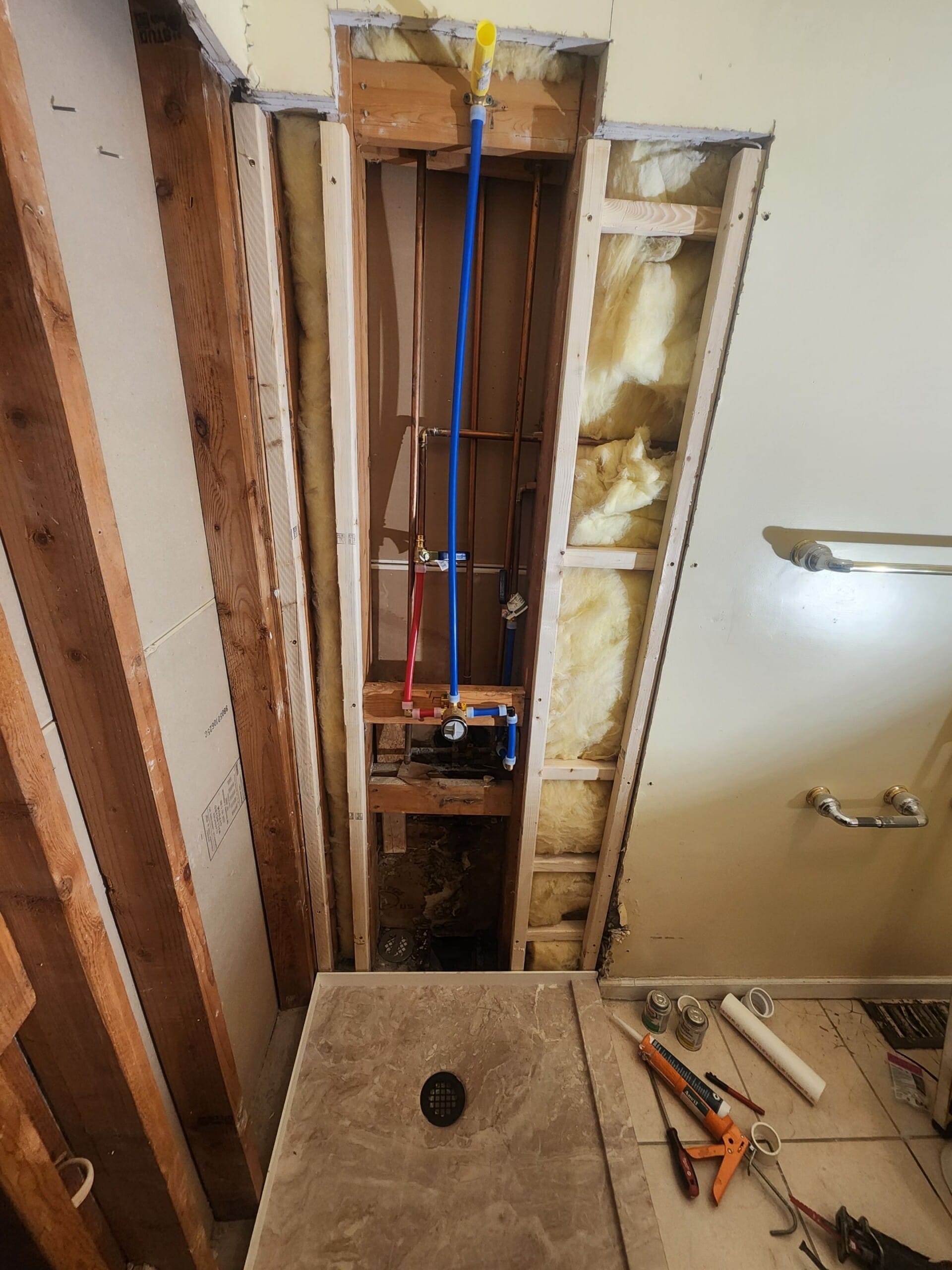 Installation was completed in one to two days and followed the outlined process of surface protection, full demo to studs, framing inspection, plumbing upgrade with PEX, panel installation, and custom base fitting. Additional safety and comfort features were incorporated including a bench and dual grab bars, tailored to user needs. Optional items like glass doors and alternate hardware finishes were discussed as part of the flexible design approach.