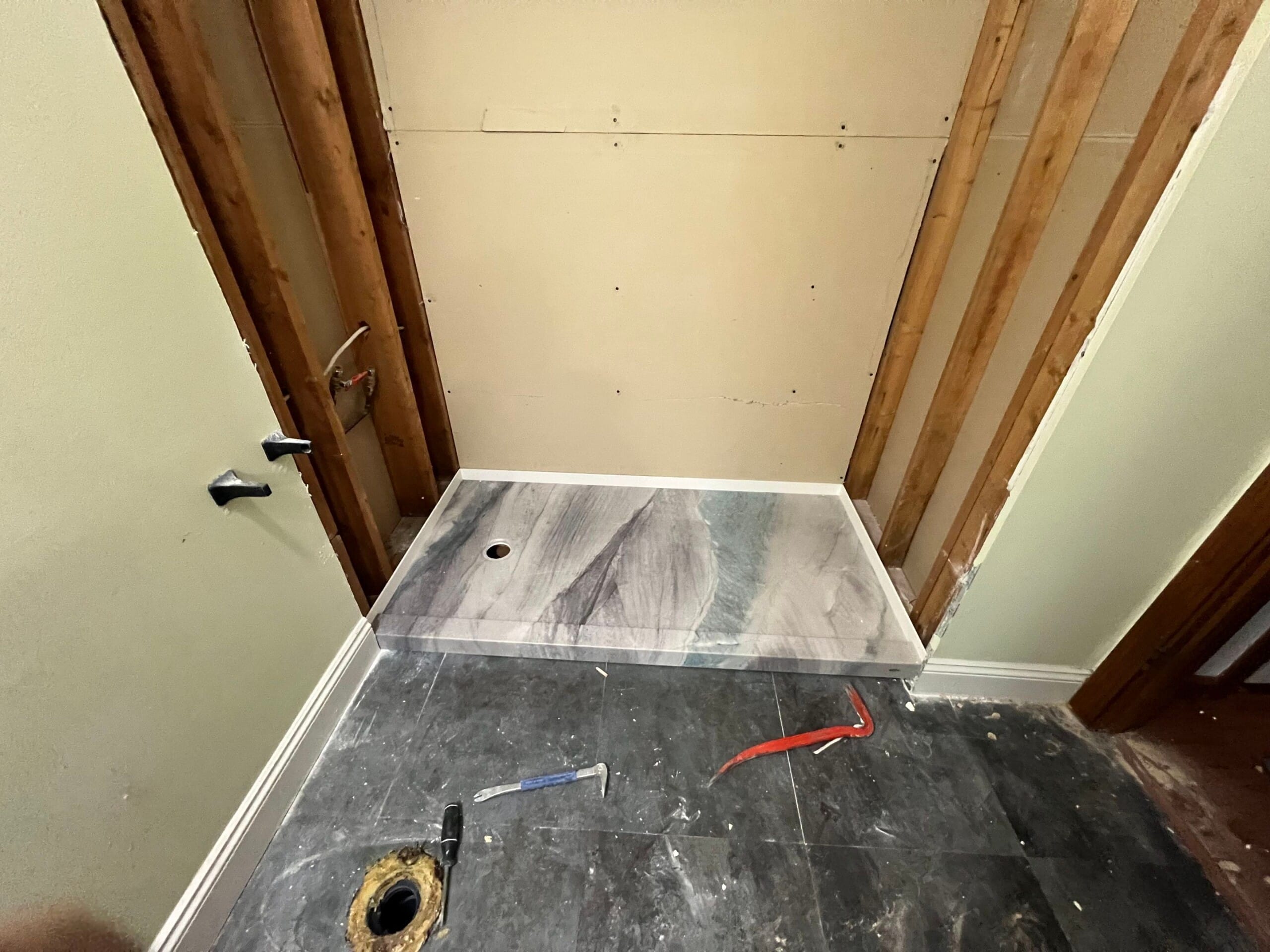 The full process began with demolition to the studs and inspection for any hidden water damage. Structural wood replacement was included at no additional charge. New plumbing was installed using Delta components, and finishing details included paneling, grab bar installation, and matte black hardware. Project scheduling was noted at approximately five to six weeks out, with a typical install time of one to three days depending on bathroom complexity.