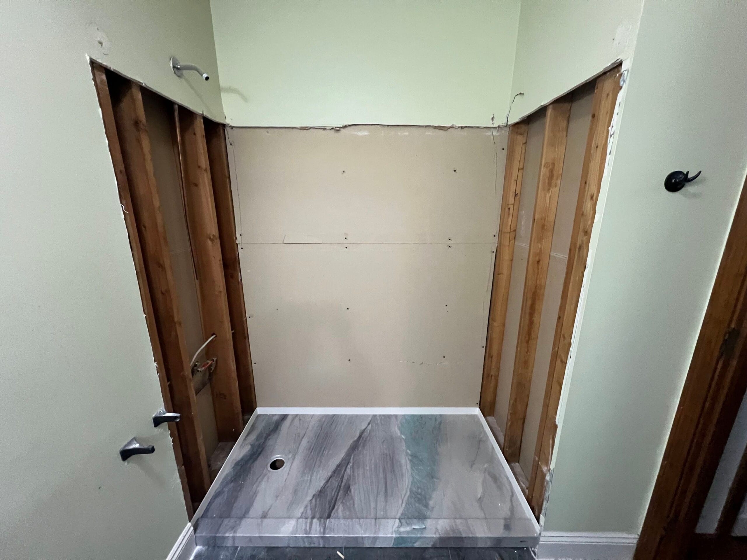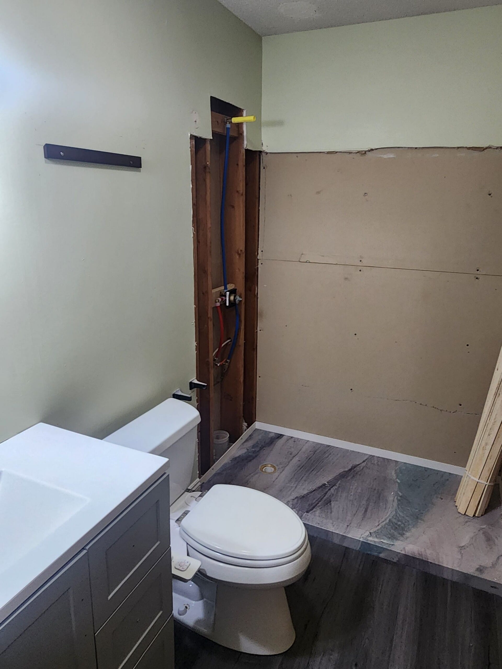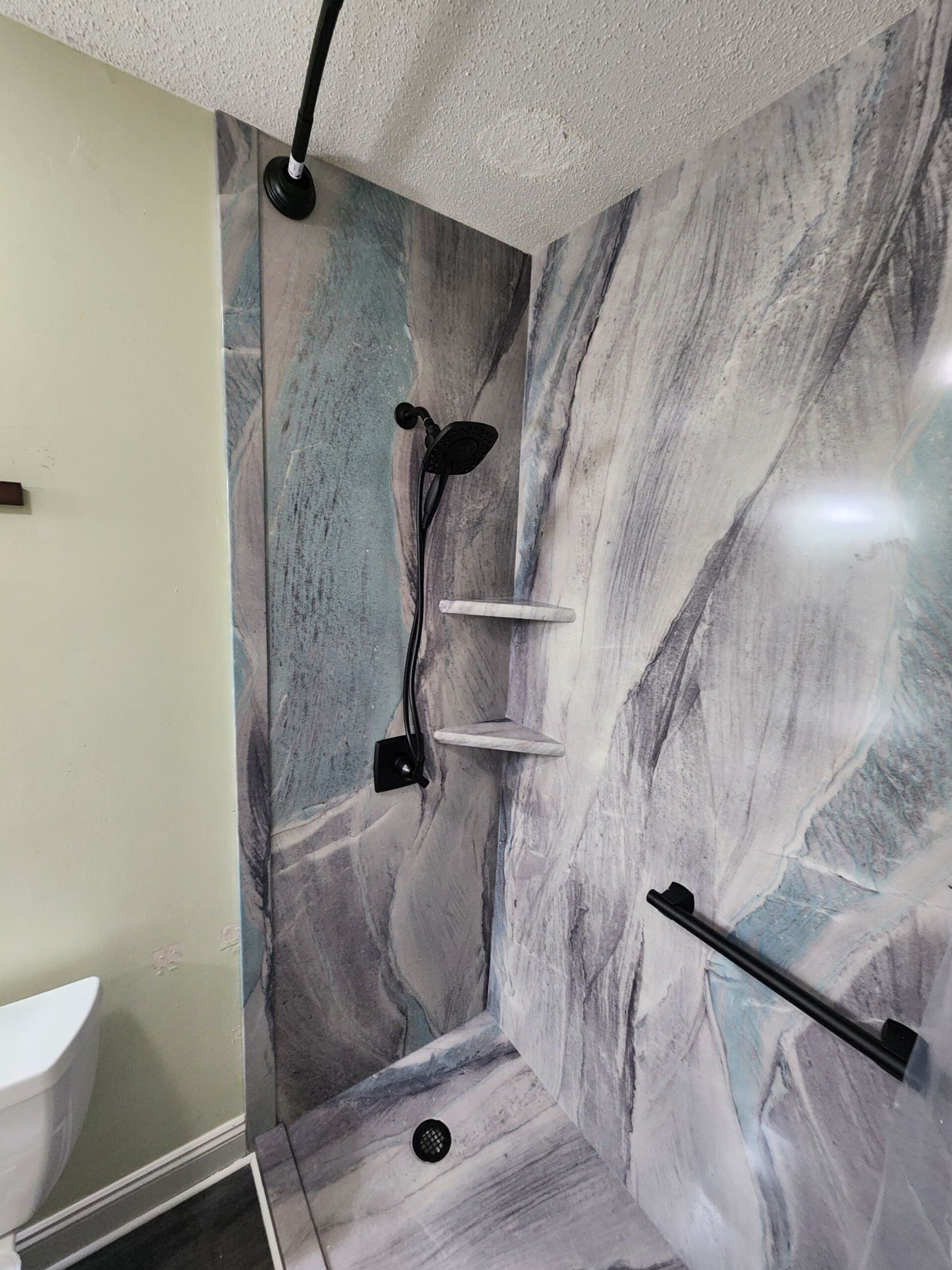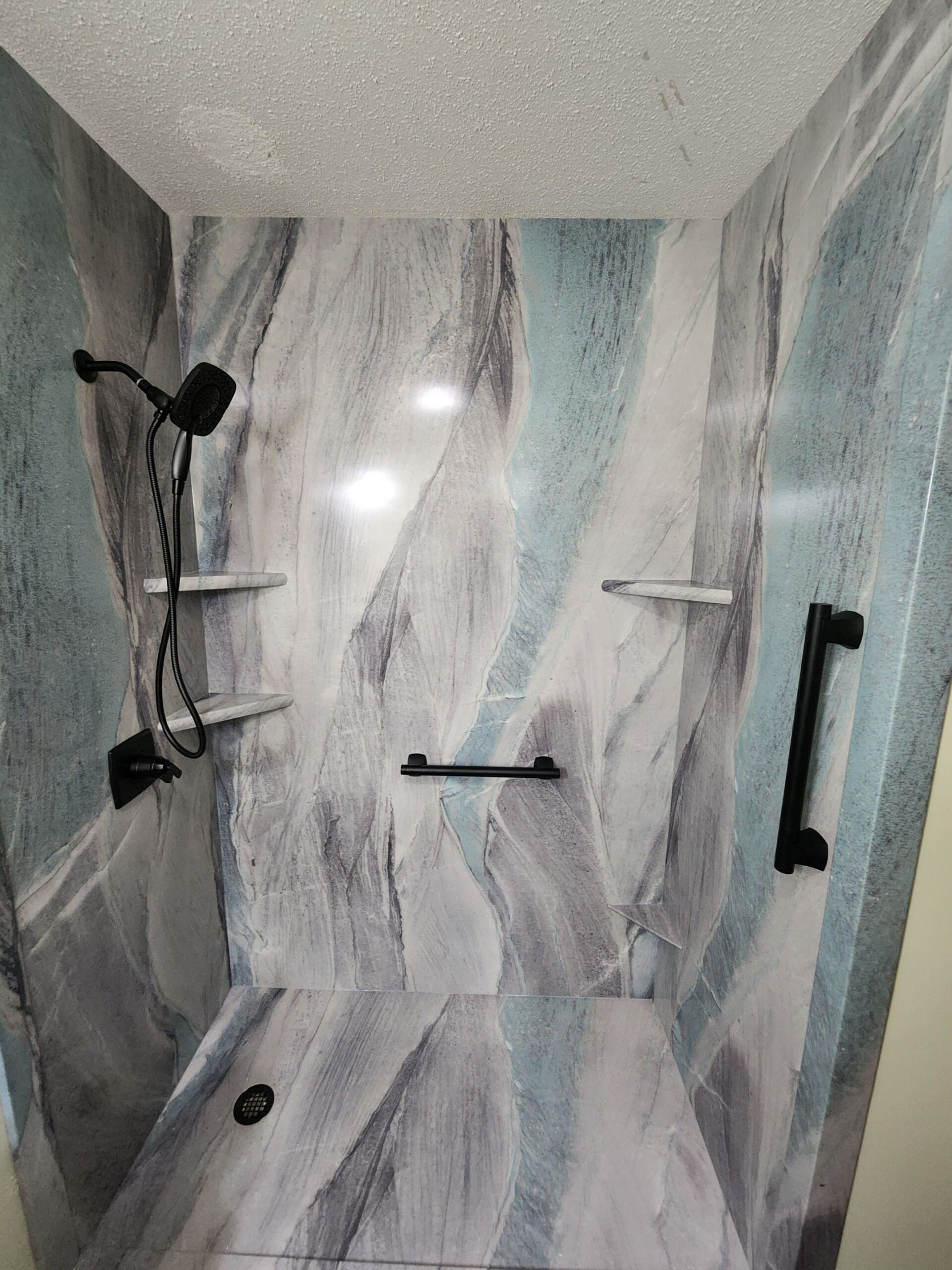 The remodel replaced a fiberglass tub-shower combo with a walk-in shower featuring composite wall panels in an Everest-inspired design. Matte black fixtures were installed, including a Delta handheld showerhead and control valve. Two corner shelves and a grab bar were added for both safety and storage. A custom non-slip base with matching wall-to-pan integration provided a cohesive, low-maintenance surface.