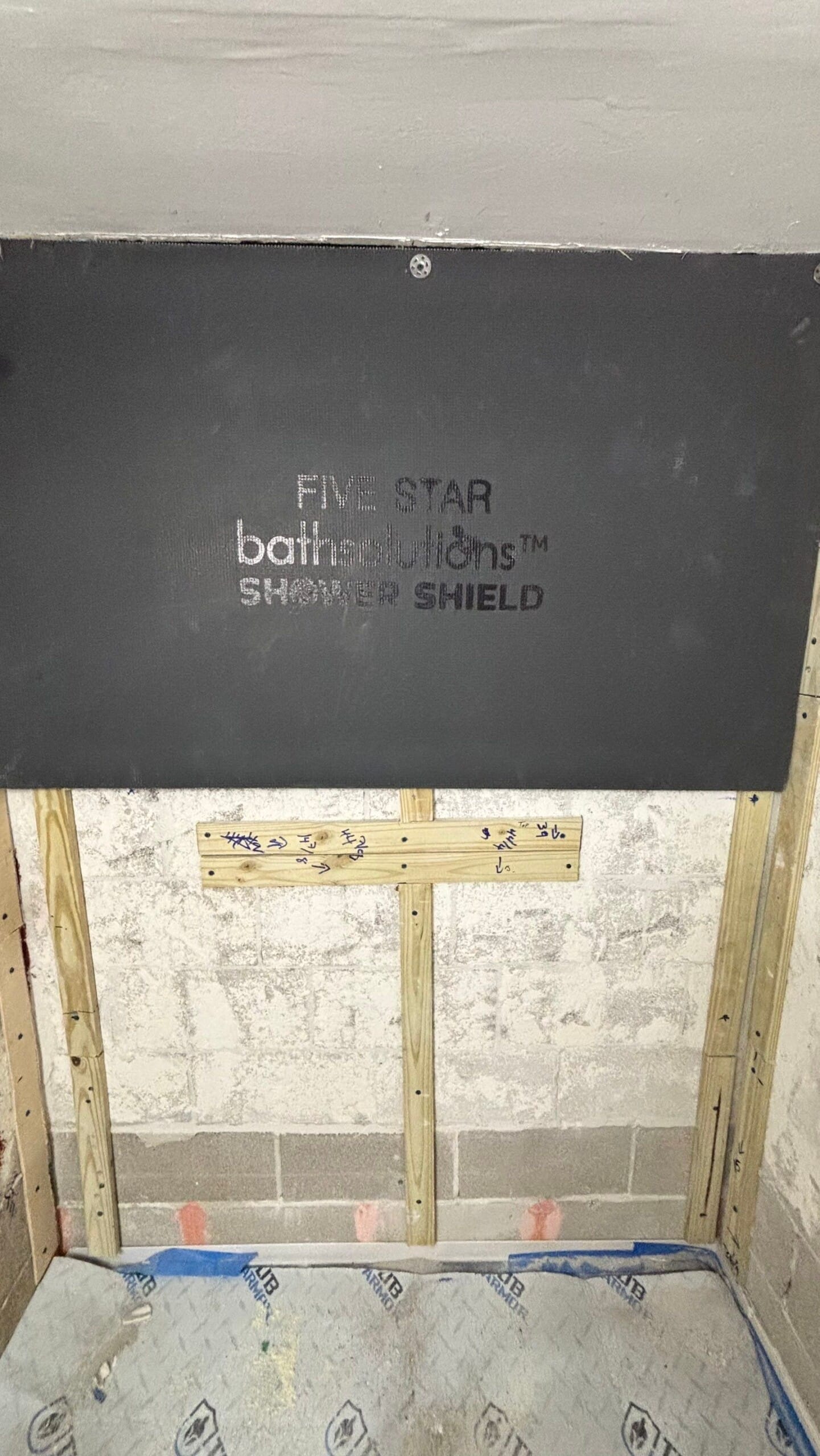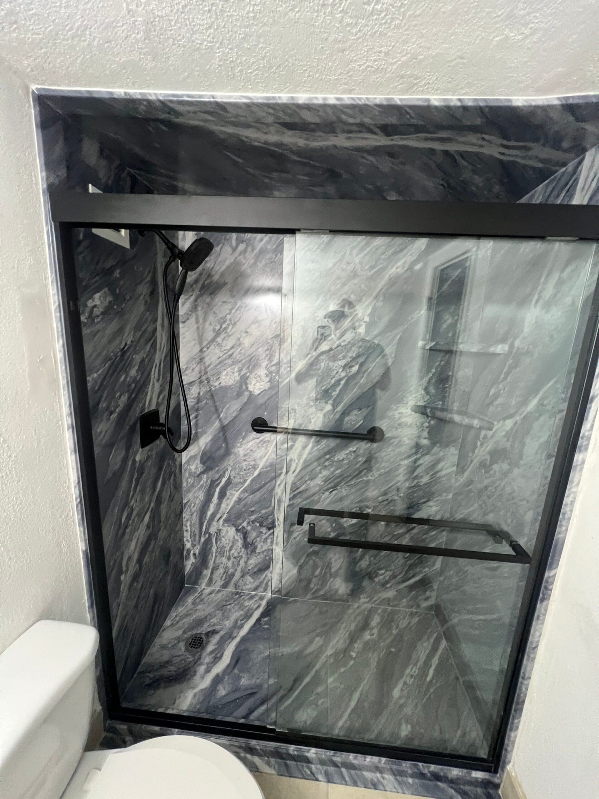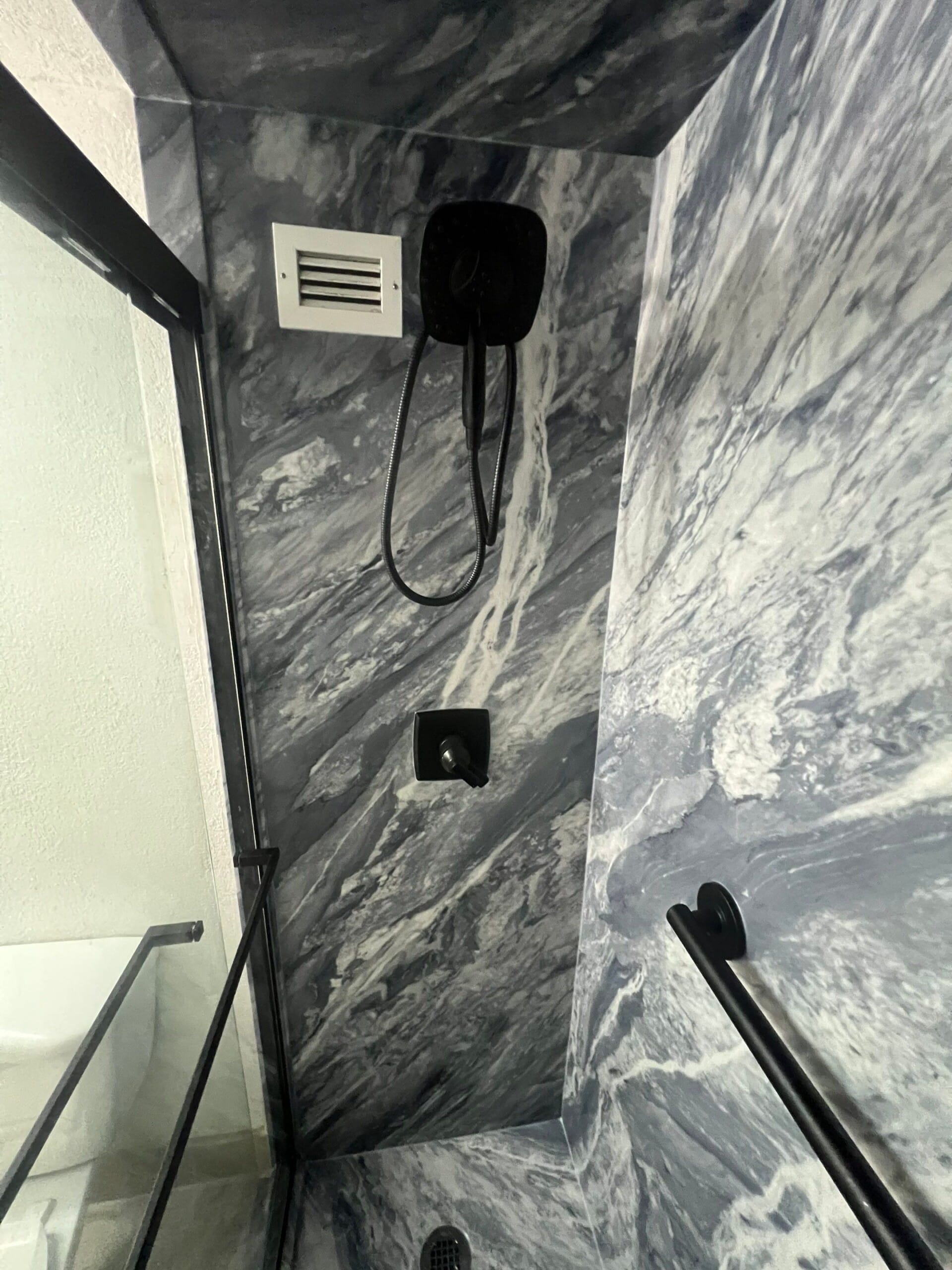 Installation took two days, beginning with full removal of the tub and existing tile down to the studs. The crew installed waterproof Shower Shield backer board followed by the wall panels, ceiling surround, and matching composite base. Matte black accessories were mounted per customer layout, including the sliding barn-style glass enclosure with black framing. The upgraded finish concealed prior layout limitations and introduced a fully sealed, easy-to-clean shower system. Daily job site cleanup and floor protection were maintained throughout the process to safeguard the surrounding space.