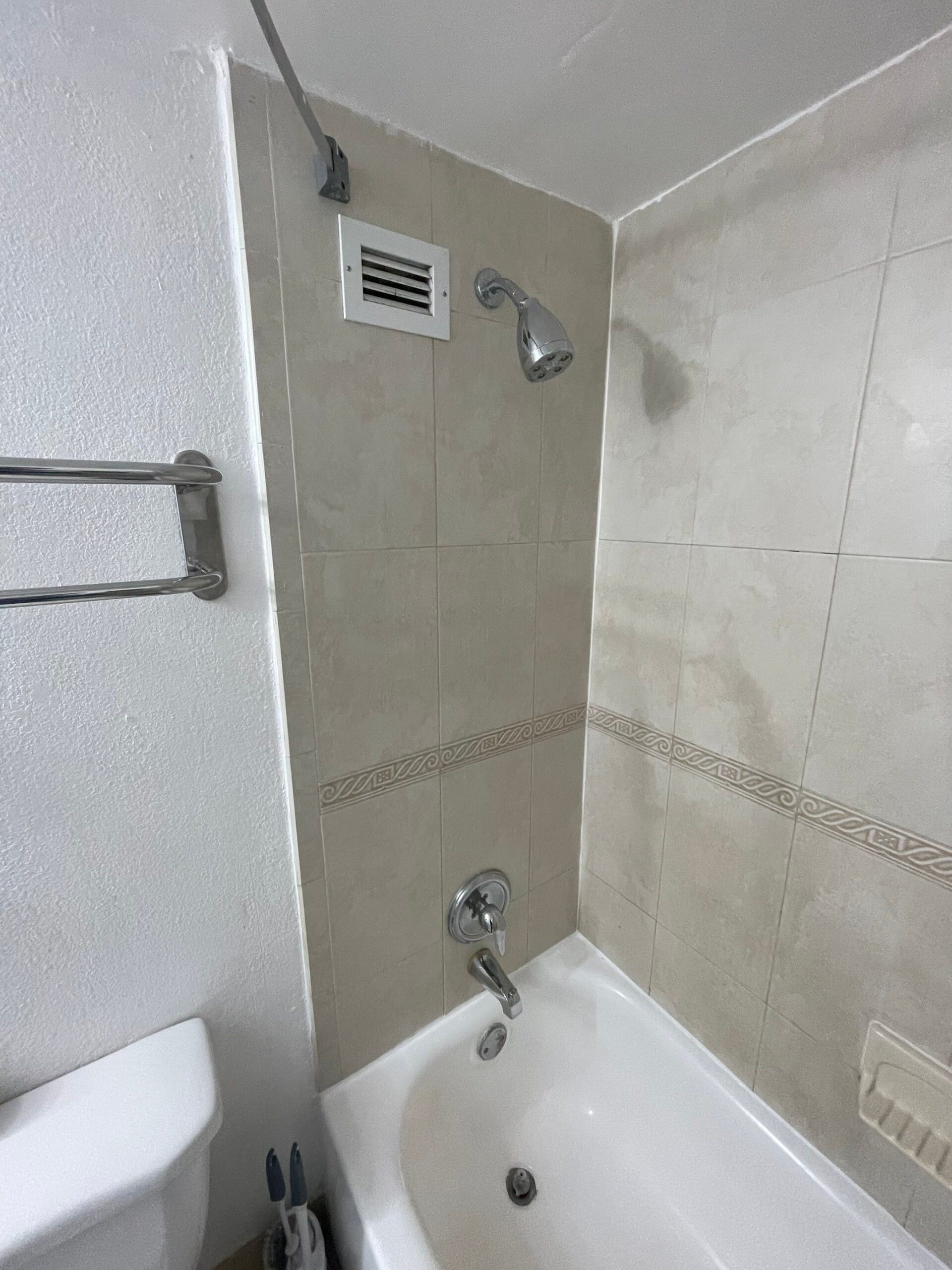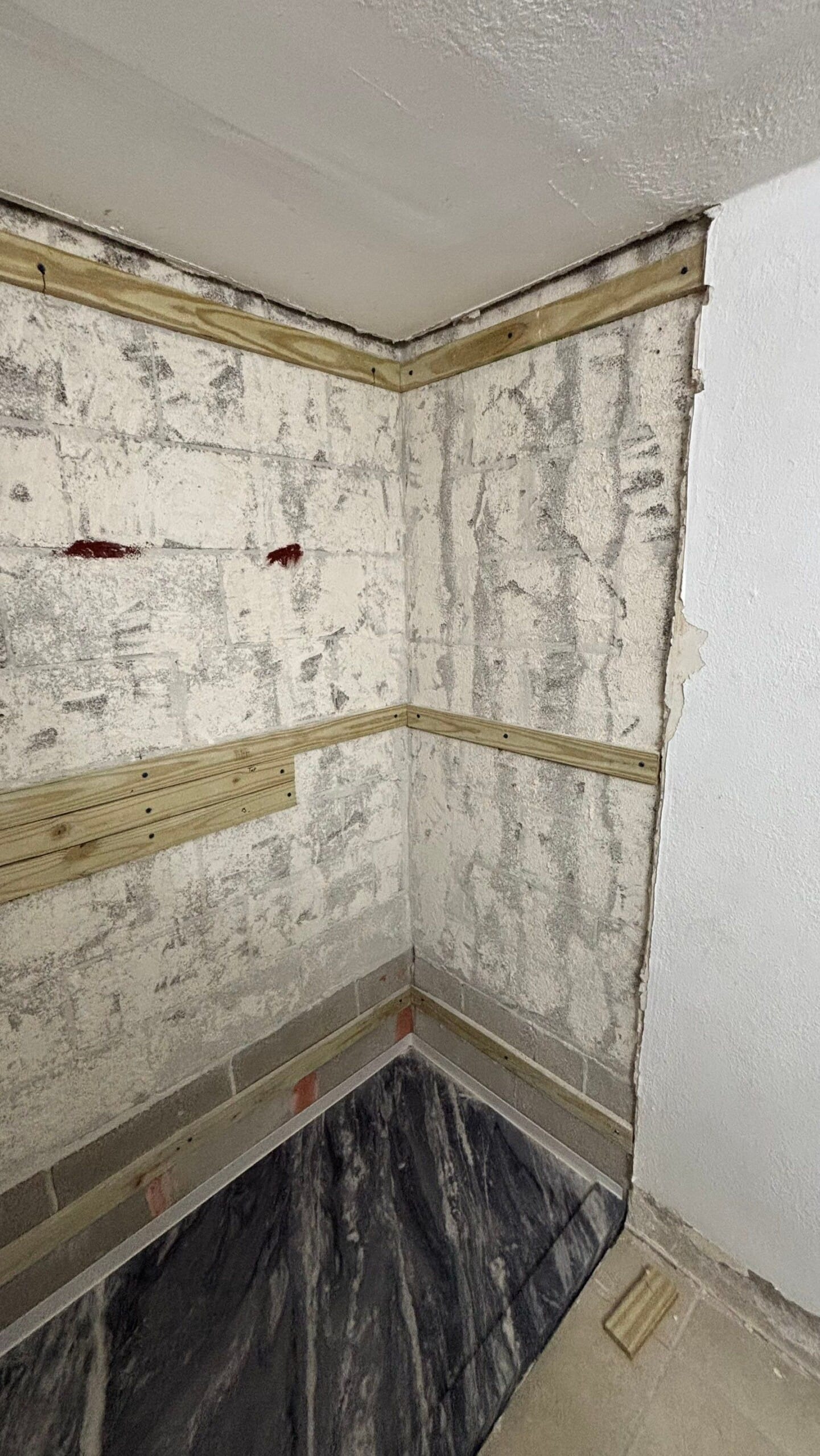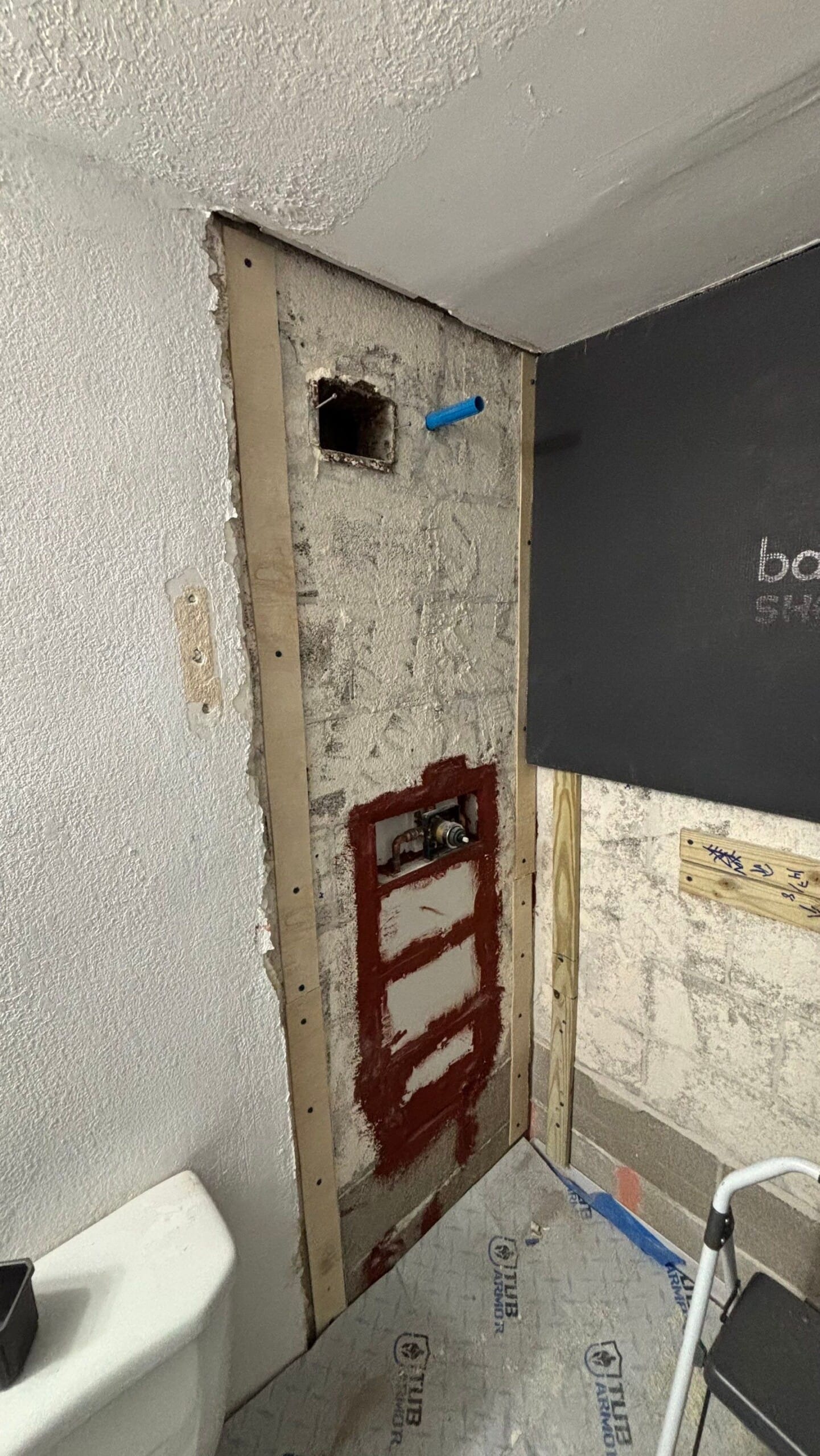 Installation took two days, beginning with full removal of the tub and existing tile down to the studs. The crew installed waterproof Shower Shield backer board followed by the wall panels, ceiling surround, and matching composite base. Matte black accessories were mounted per customer layout, including the sliding barn-style glass enclosure with black framing. The upgraded finish concealed prior layout limitations and introduced a fully sealed, easy-to-clean shower system. Daily job site cleanup and floor protection were maintained throughout the process to safeguard the surrounding space.