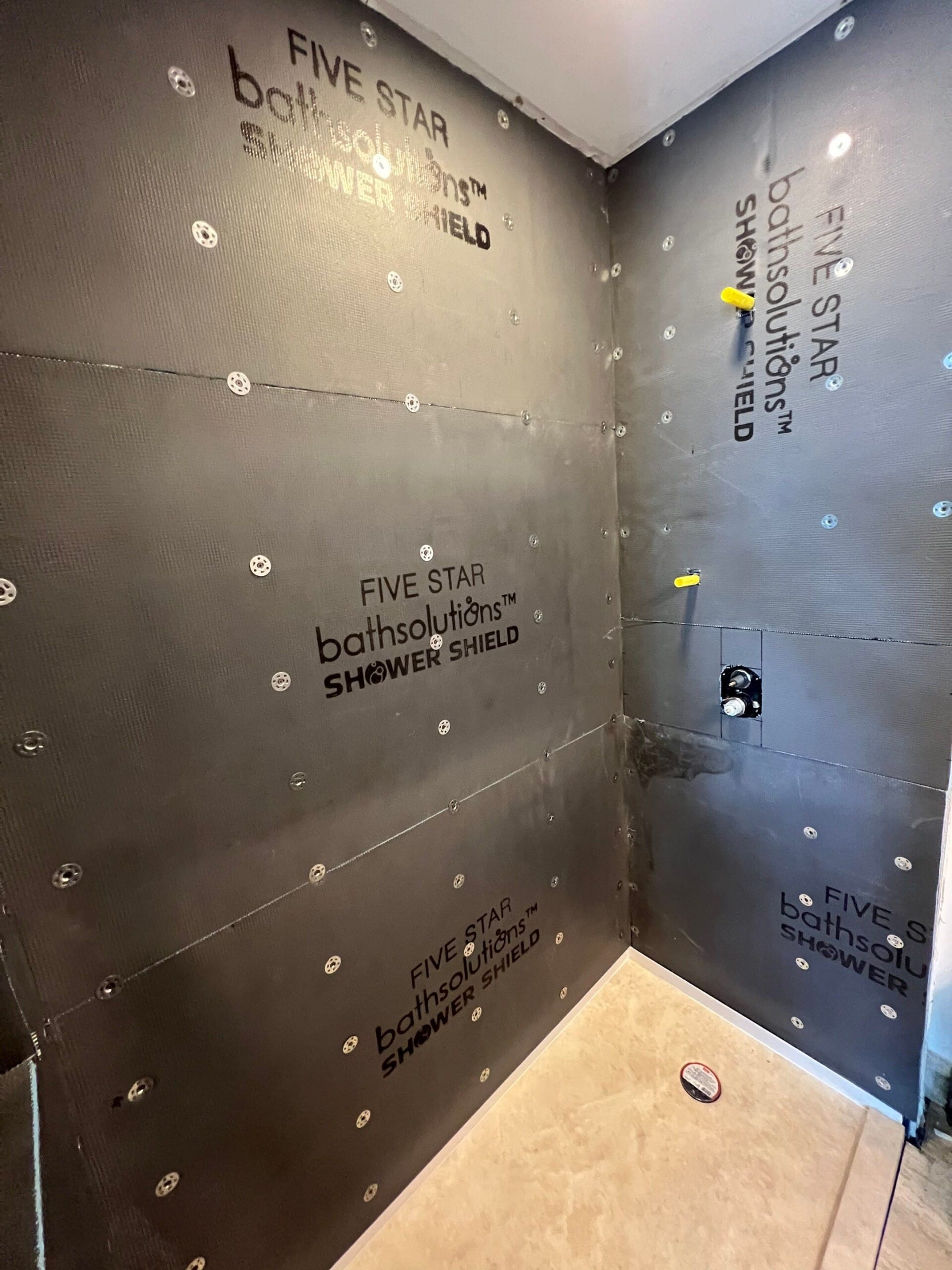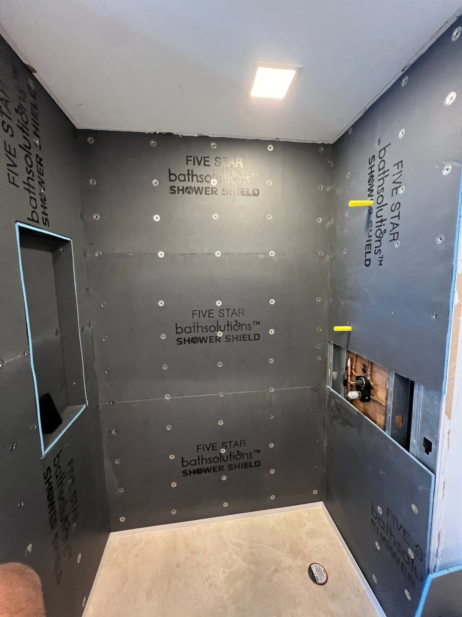 The certified team completed the remodel in two days. Work included full demolition of the previous unit, inspection and plumbing updates, installation of the shower base, waterproof backer boards, and full-height wall panels. The system also included a custom-installed barn-style sliding glass door with metal track hardware. Protective floor runners were used throughout, and all construction debris was removed from the property upon completion. The installation reflected precise measurements and finish alignment from floor to ceiling.