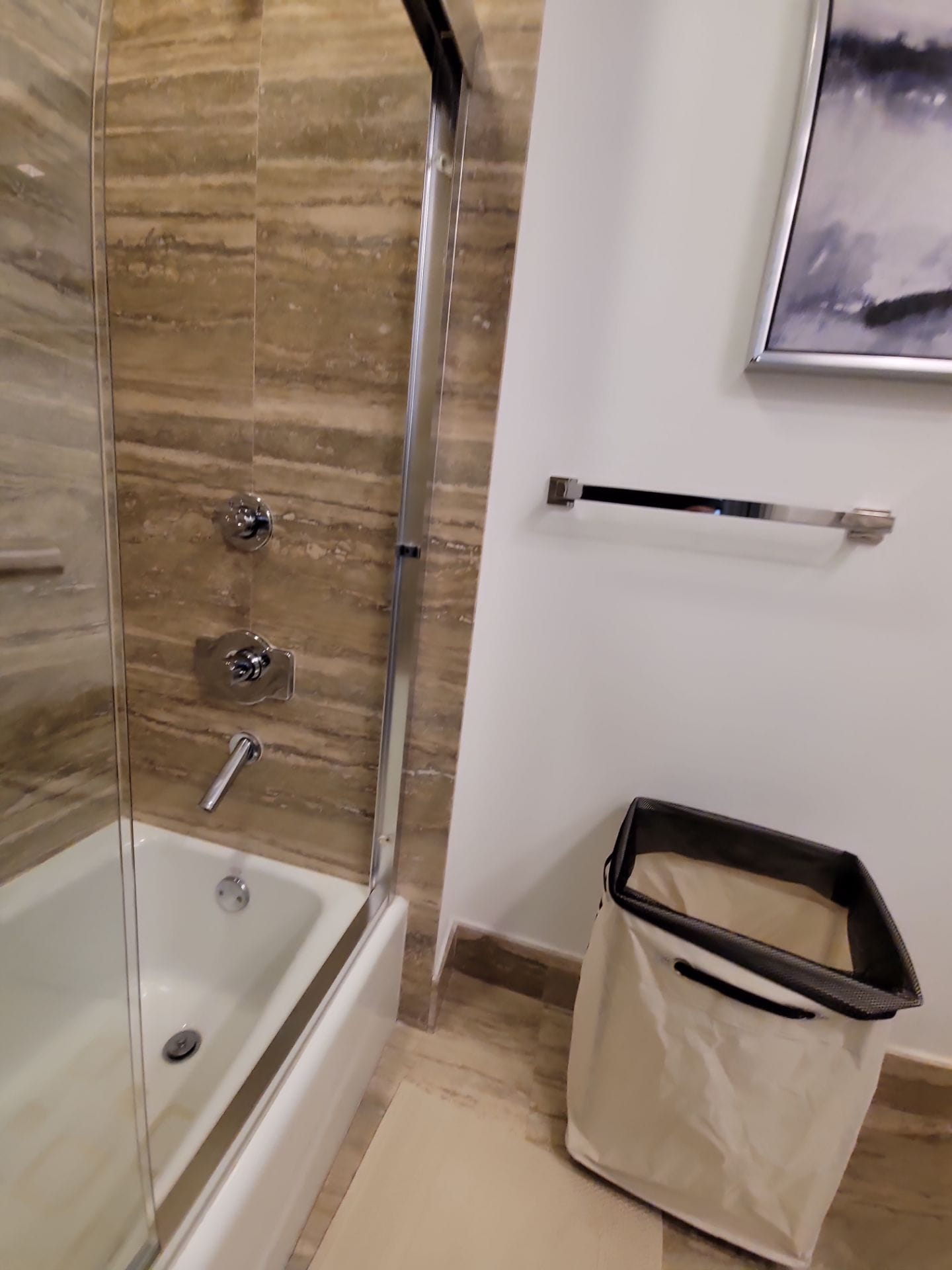 * Brushed nickel Delta commercial-grade fixtures with rainfall and handheld wand