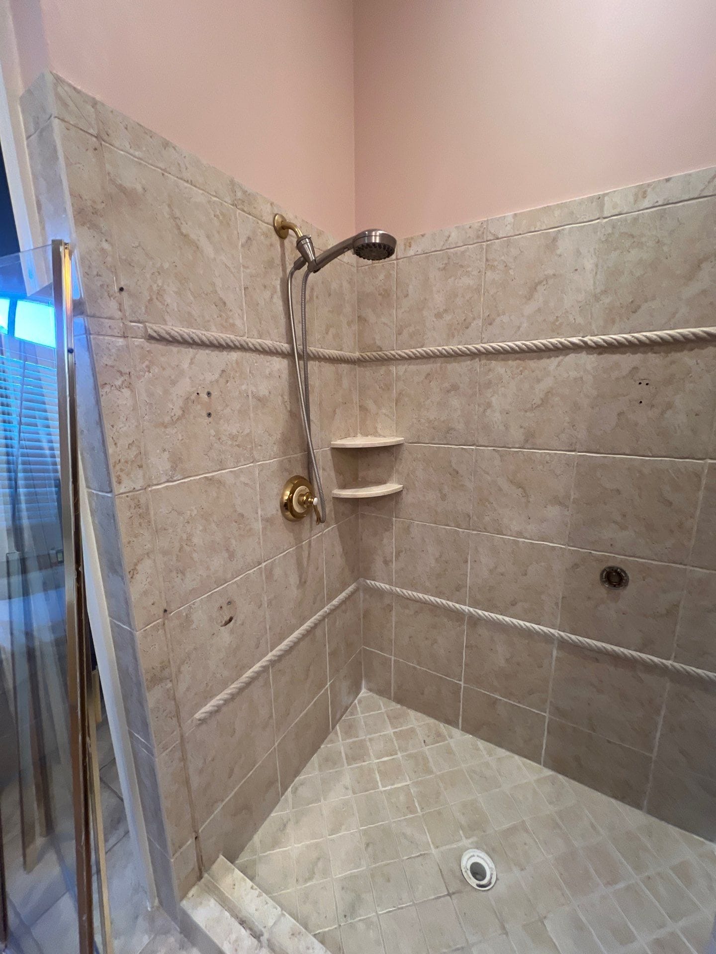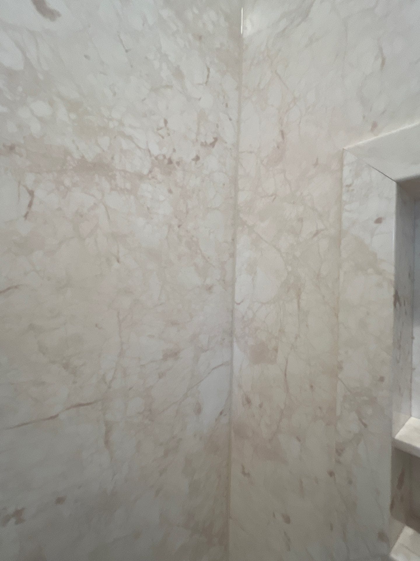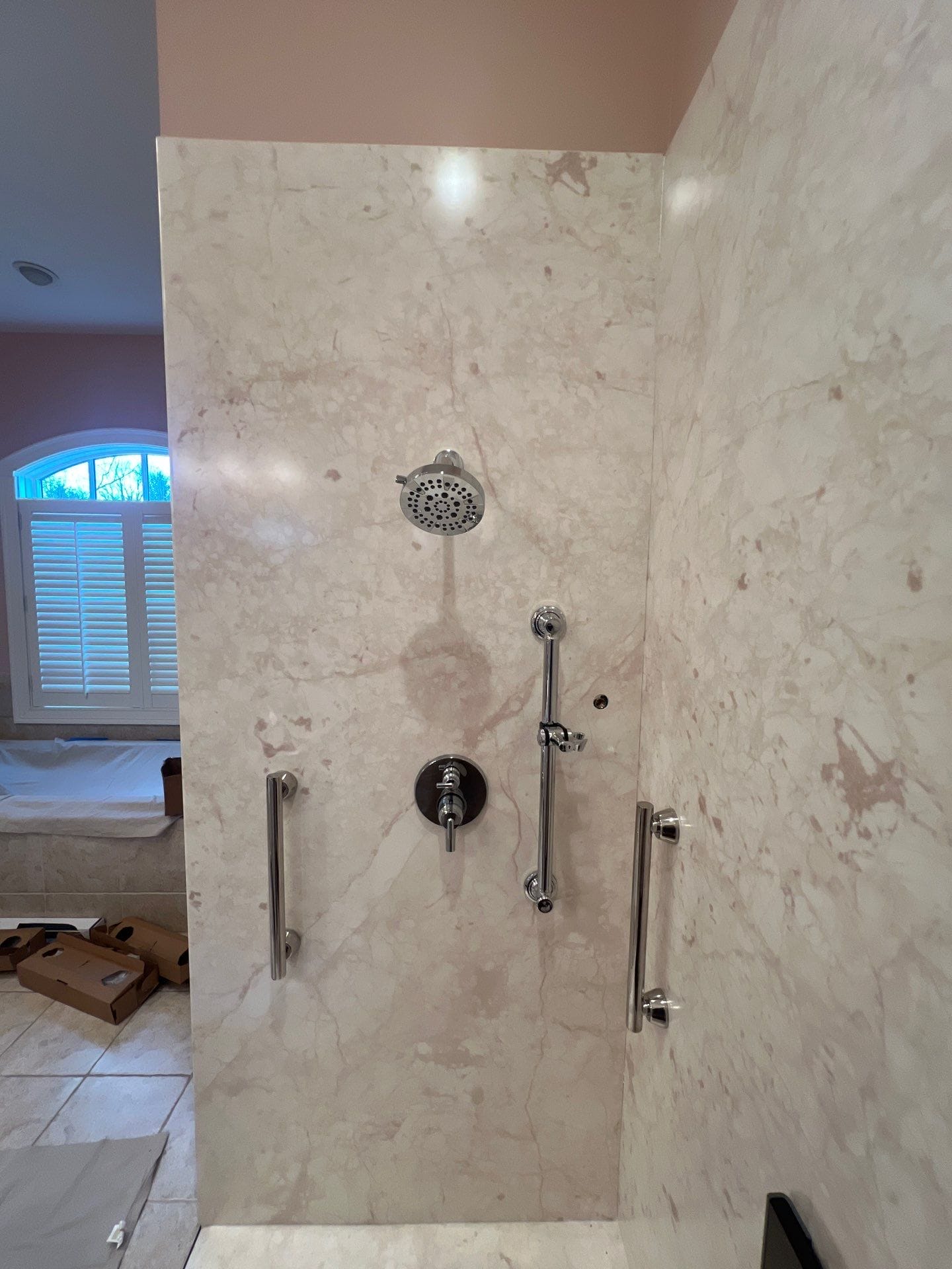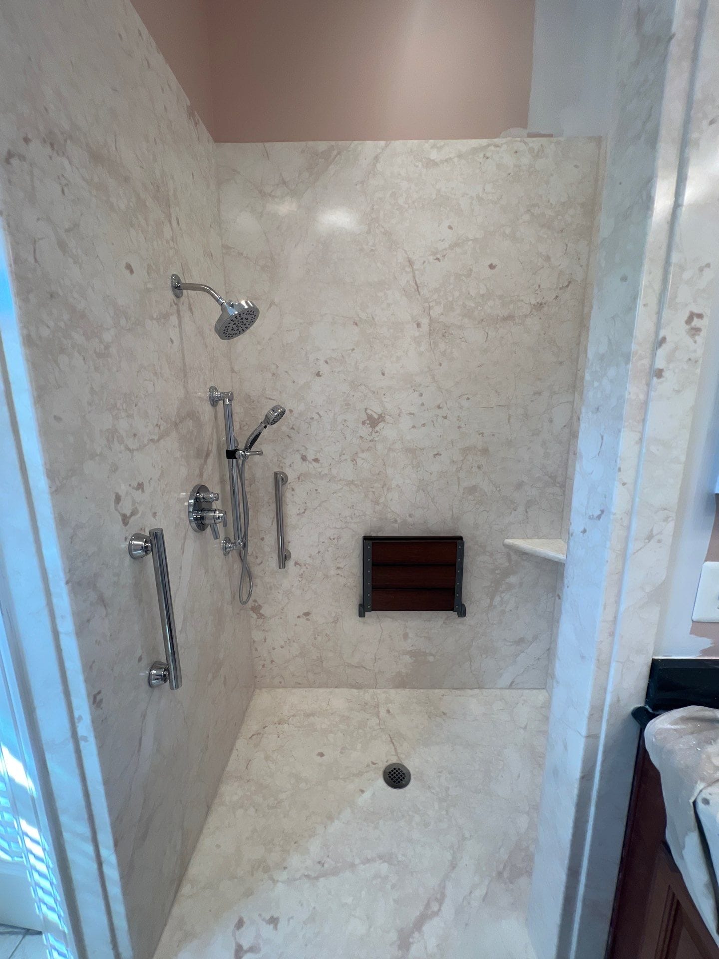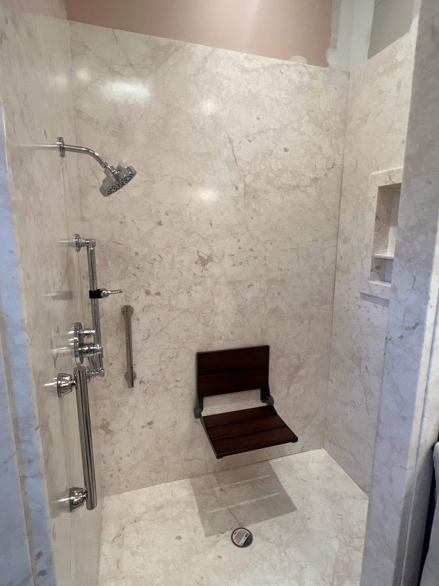 The Representative presented a grout-free composite wall system in a marble-style finish that closely aligns with the existing surrounding materials while delivering a cleaner and more seamless look. The updated design replaced the smaller tile pattern with large wall panels and incorporated chrome fixtures for a refreshed and cohesive appearance. Functional upgrades included a recessed wall niche for storage, a built-in bench for seating, and multiple grab bars for added stability. The system was designed to eliminate grout maintenance while providing a durable, non-porous surface resistant to mold and mildew.