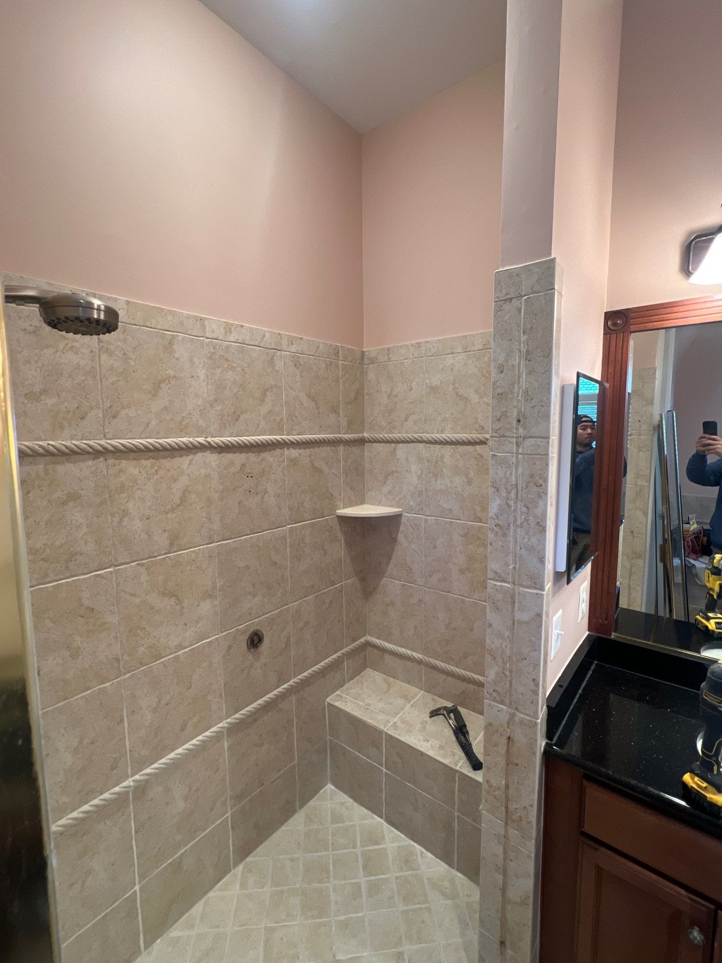Installation involved full removal of the existing tile and substrate down to the framing, followed by inspection and preparation of the structure. A waterproof backer system was installed before securing the new wall panels and shower base. The low-threshold shower floor replaced the previous raised entry, improving accessibility while maintaining water control. Fixtures, grab bars, seating, and storage components were installed and secured, and the space was sealed and finished with a clean, streamlined appearance. The project followed a multi-day timeline including demolition, installation, and final detailing.