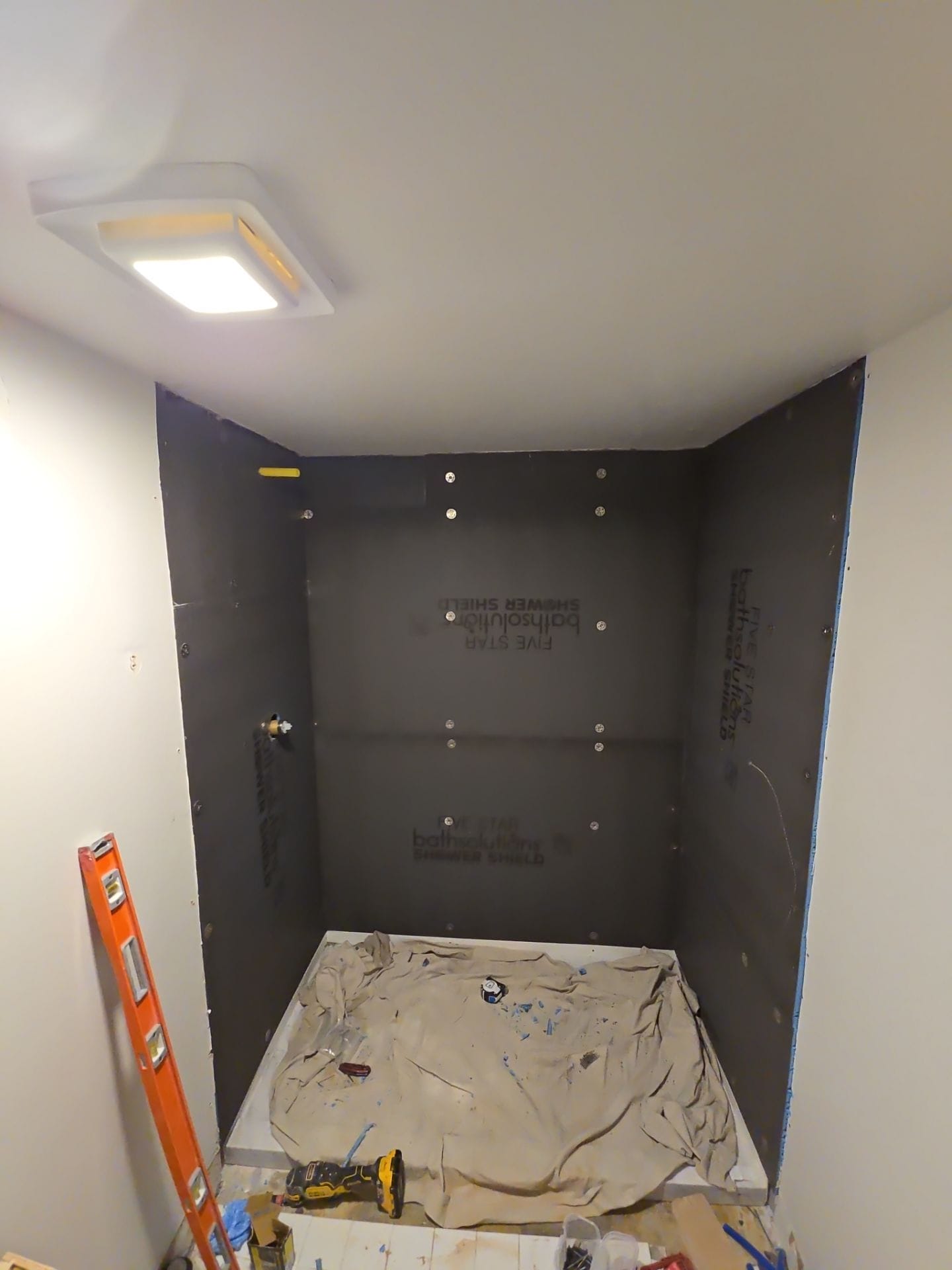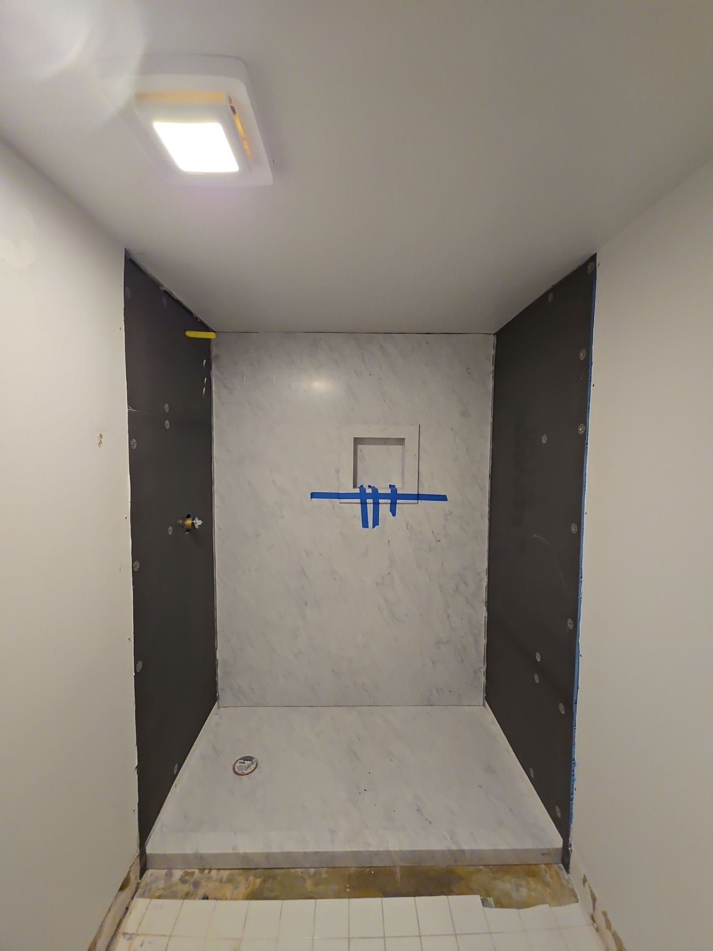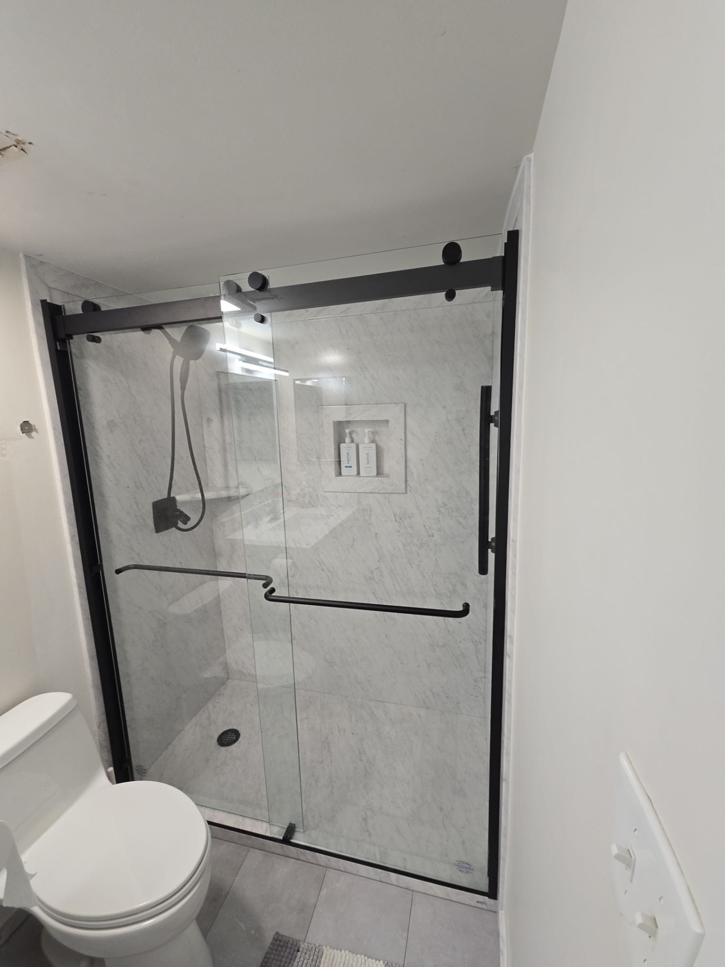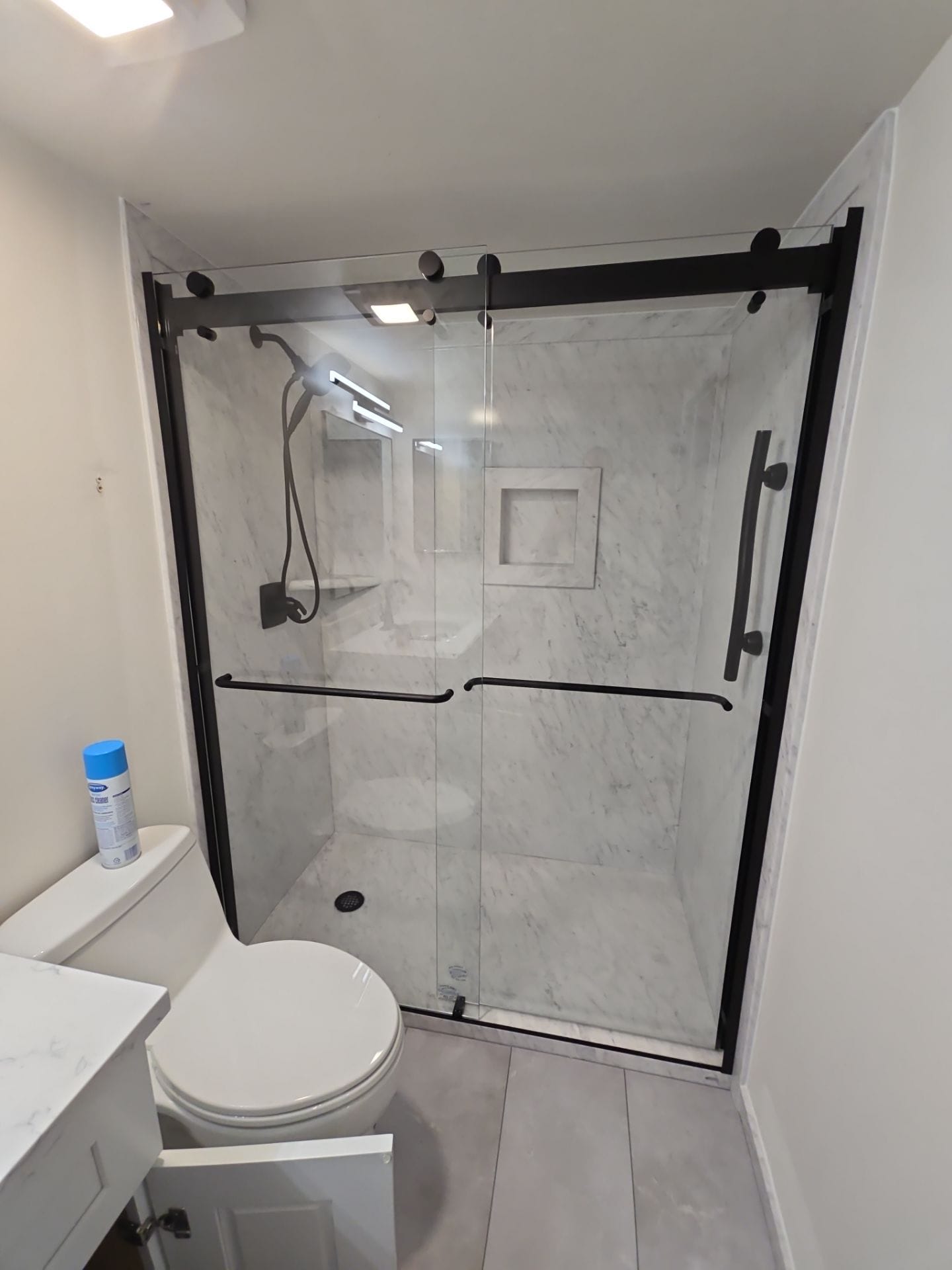 Installation included full removal of the existing tub and wall system, followed by preparation of the framing and installation of a waterproof backer system. A low-threshold shower base was installed to allow easier entry, replacing the previous high tub wall. A recessed wall niche was added for storage at an accessible height, and a corner shelf was incorporated for additional usability. The glass enclosure with sliding doors was installed to contain water while maintaining open access. The project was completed within a multi-day timeline, including demolition, installation, and final sealing and cleanup.