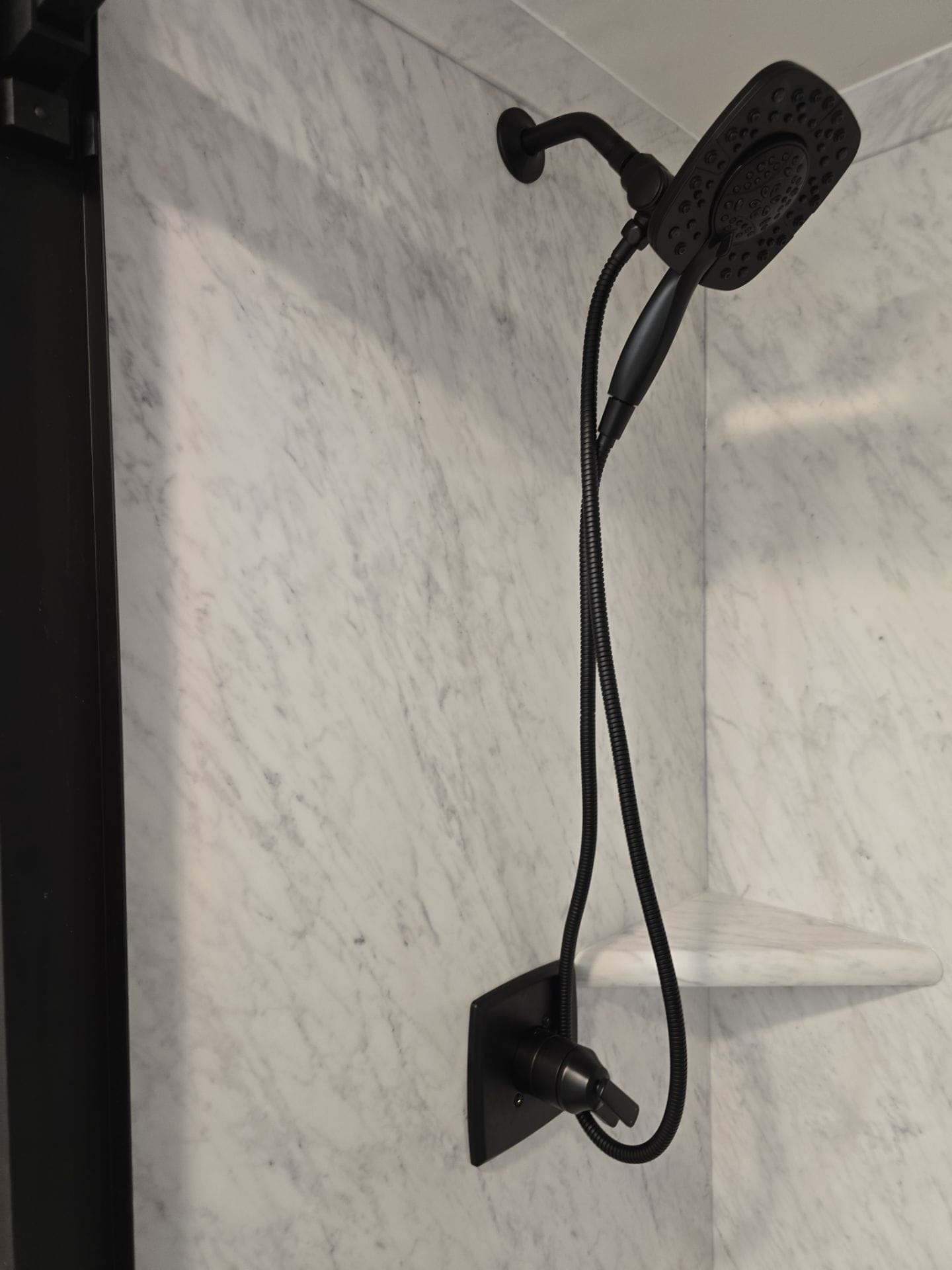 The Representative presented a grout-free composite wall system designed for durability and ease of maintenance, replacing the previous molded surround with large Calacatta-style panels for a brighter and more modern look. Matte black fixtures and hardware were selected, including a handheld shower system and sliding glass enclosure, creating a cohesive and updated finish. The system eliminates grout lines and reduces maintenance while providing a non-porous surface that resists mold and mildew. The company’s focus on accessible design and long-term performance supported the customer’s safety-driven goals.