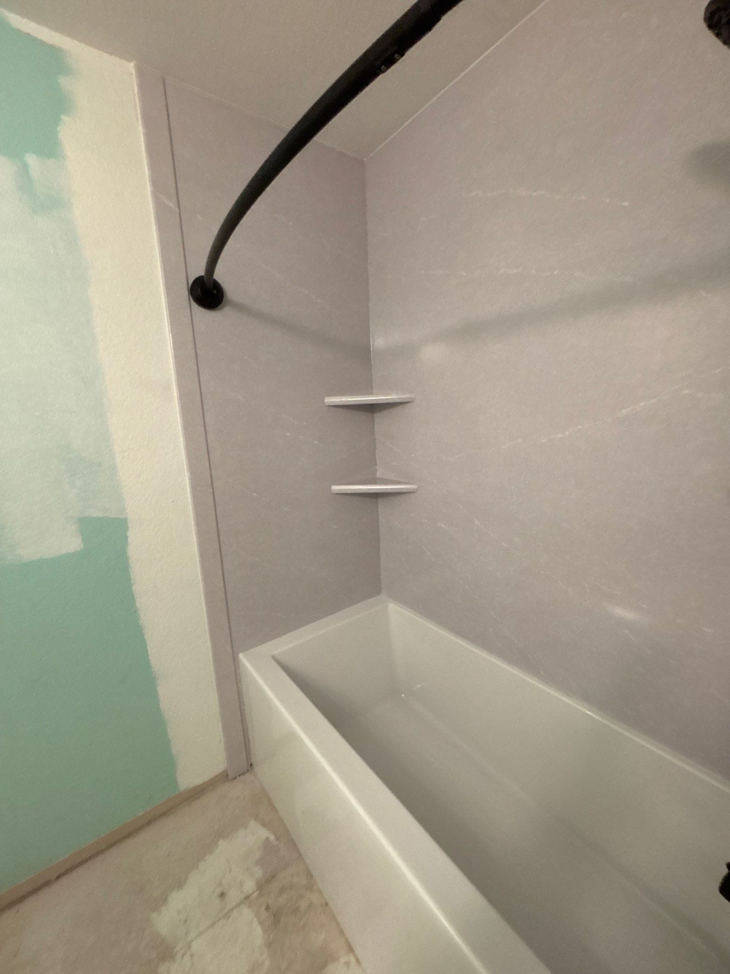 Installation began with a full demo to the wall studs, followed by a thorough inspection of framing and plumbing. Any structural or plumbing repairs were addressed at no additional charge. The remodel included the installation of the proprietary Shower Shield waterproof backer board, new PEX lines, and upgraded chrome fixtures. The wall system was completed with the Smart Choice White Pearl panels and permanently secured shelving. A horizontal grab bar was placed for both safety and towel use. The existing flooring remained untouched per customer request. The full installation timeline was estimated at three to four days, coordinated and finalized through an on-site visit by the project manager.