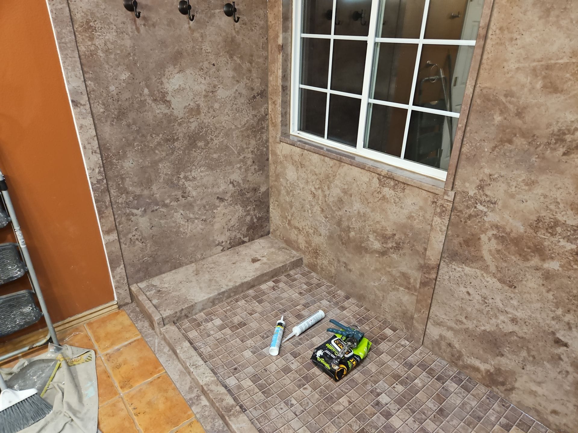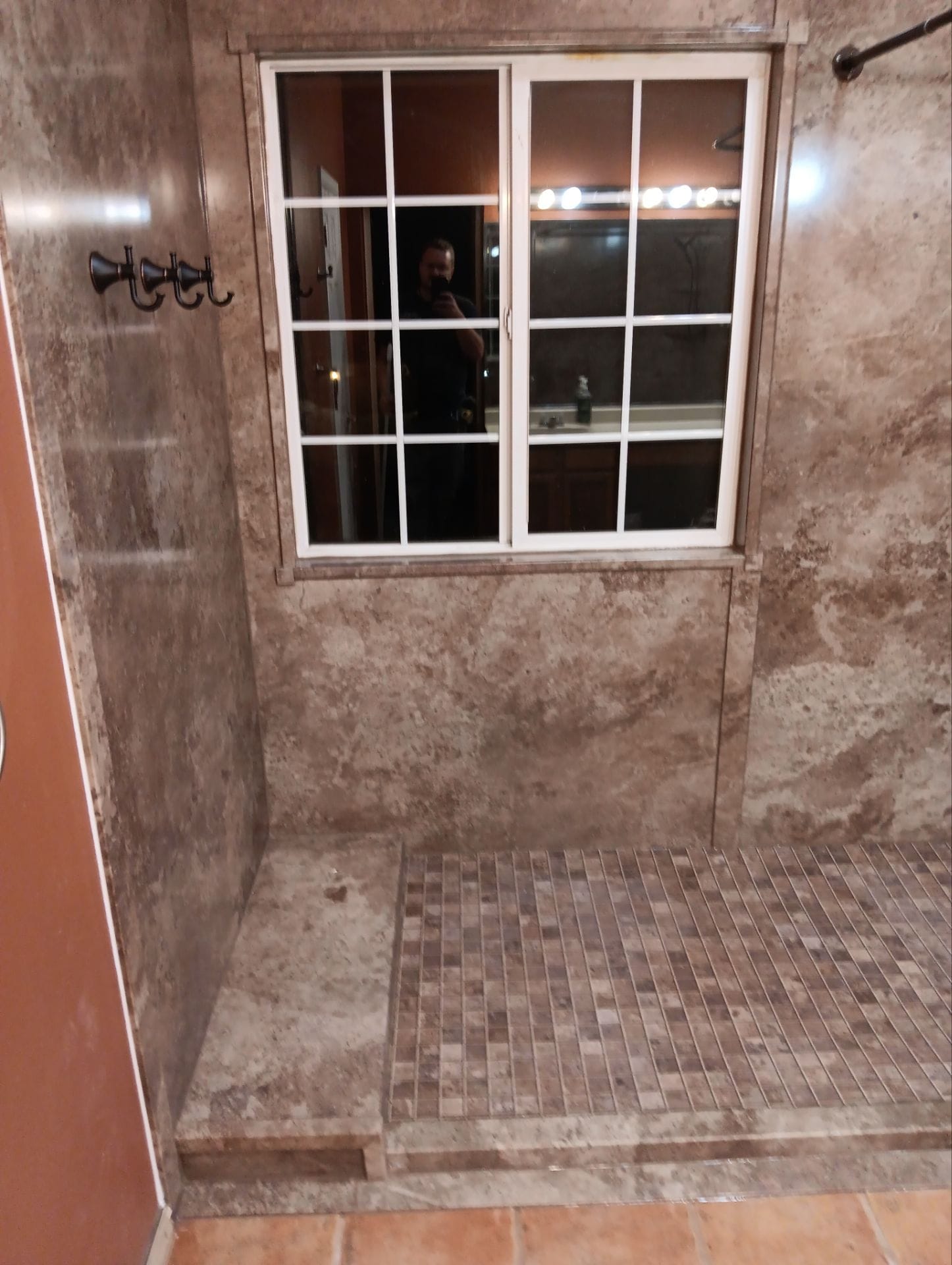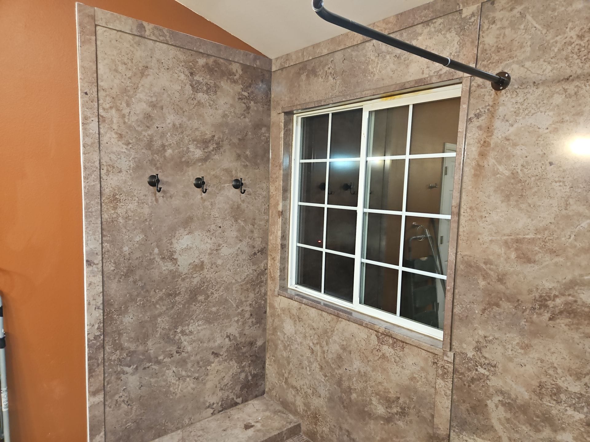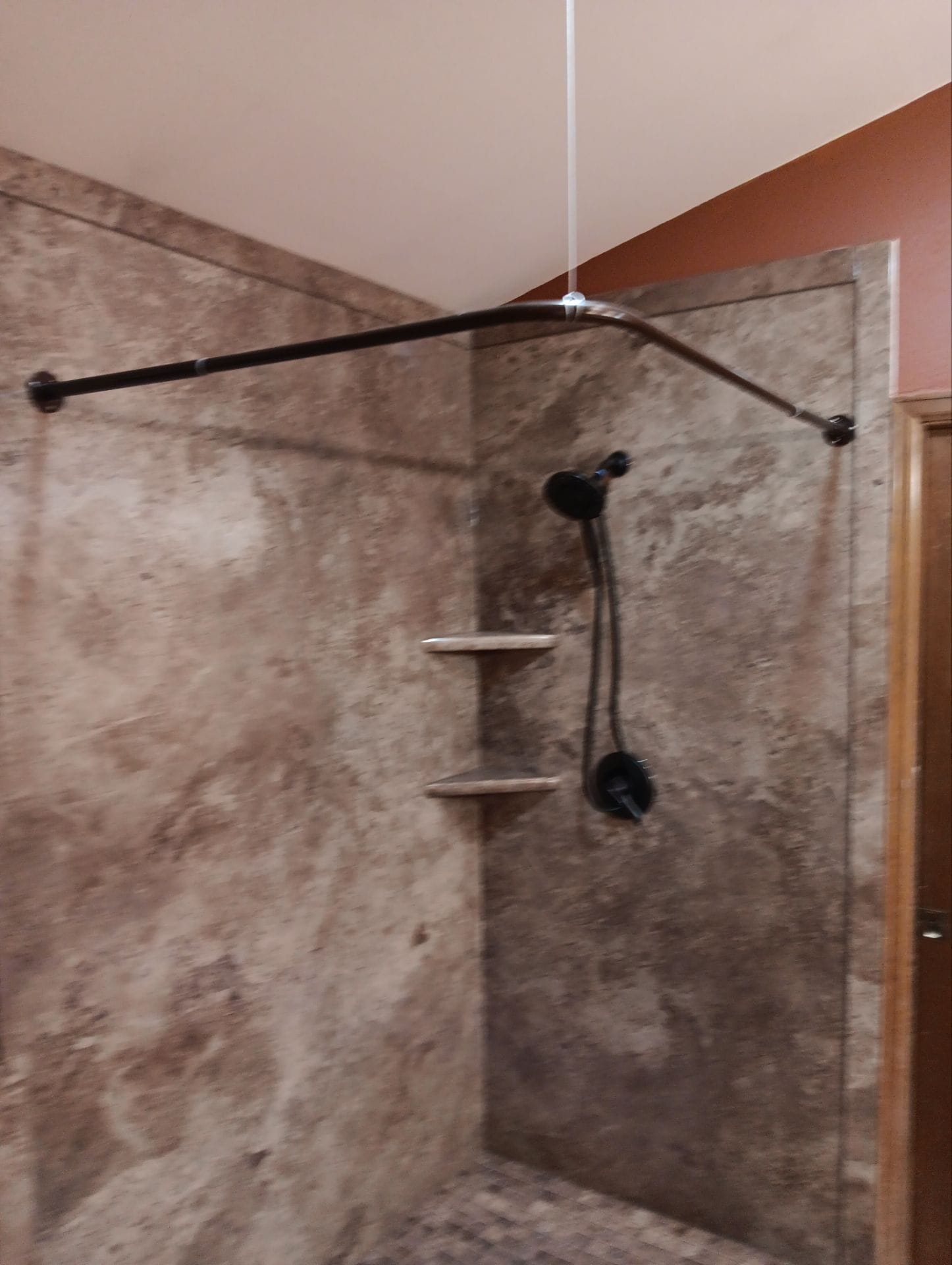 The installation process included full demo to the studs—already partially completed by previous contractors—followed by verification and treatment of any remaining moisture or structural damage. Five Star installed a thermal-insulated, weight-bearing pan and mounted all accessories to ADA-backed blocking for safety. The walls were completed with floor-to-ceiling antimicrobial panels in a textured stone finish and sealed using a quad-lock system with marine-grade silicone. The finished space included a wide walk-in base with matching mosaic-tiled shower floor, an integrated bench, two corner shelves, oil-rubbed bronze fixture upgrades, and a curtain rod in place of the previously requested sliding rainfall glass doors. Installation was completed with new recessed overhead lighting. Visuals confirm the grab bar was omitted from the final layout, likely due to layout constraints or updated design decisions. Installation typically takes two to three days, with materials arriving in approximately six to eight weeks.
