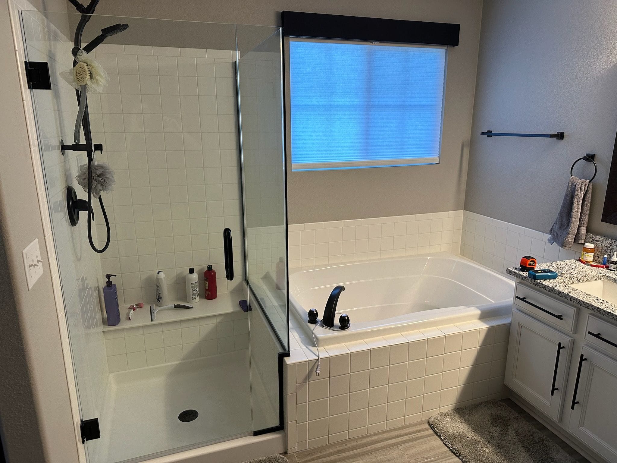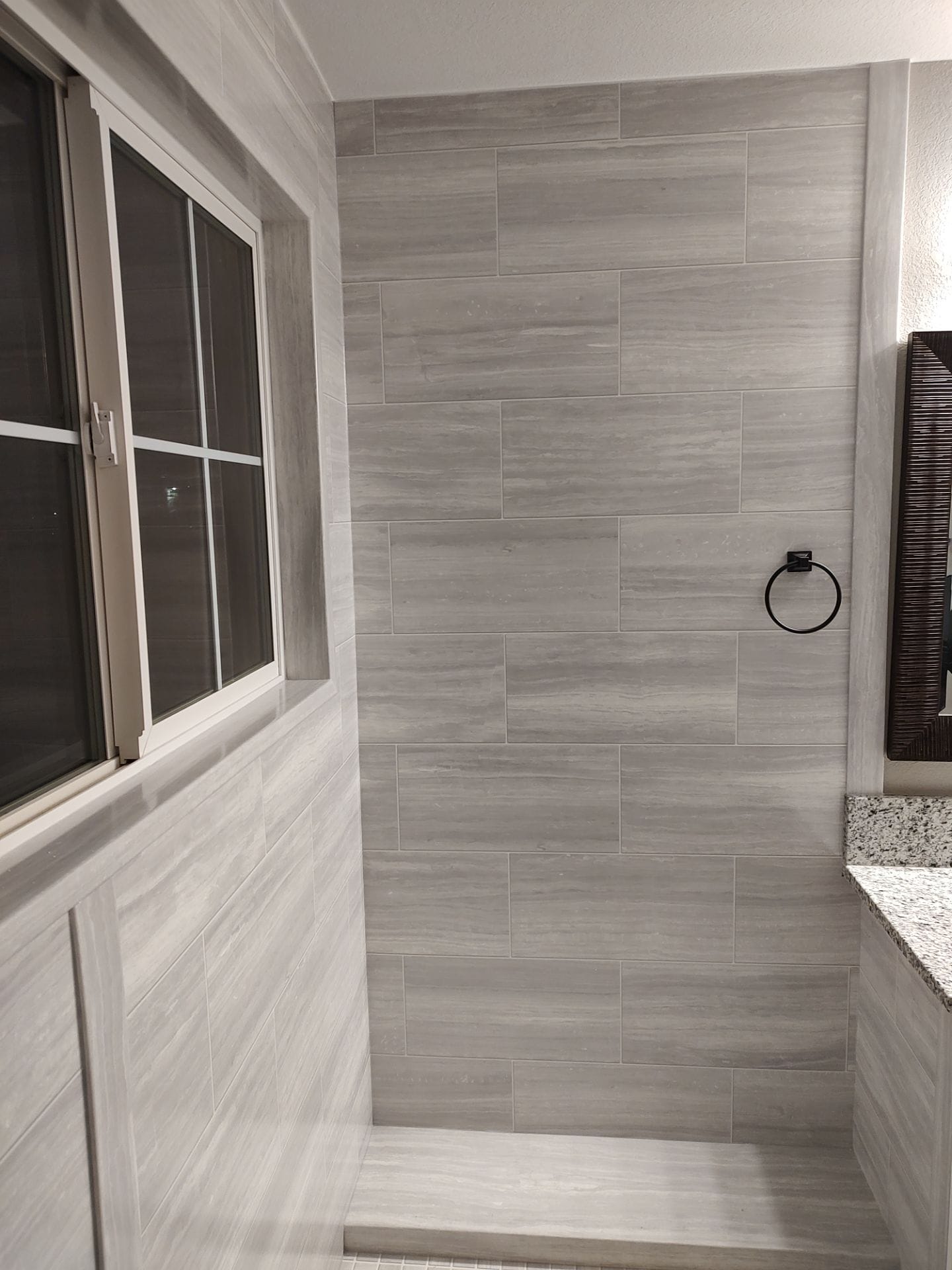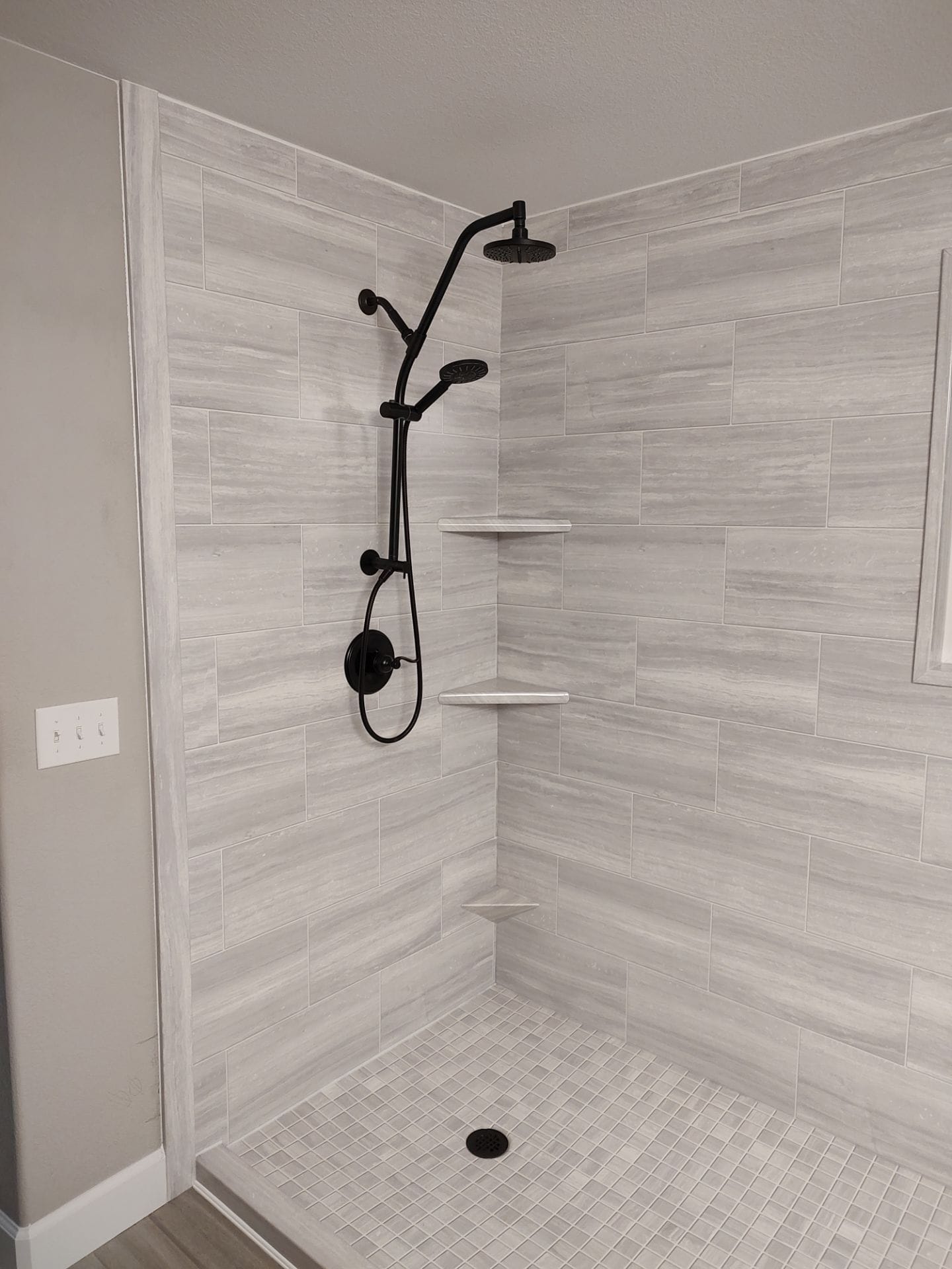 Installation included a complete demolition of the existing shower materials to the wall structure, followed by preparation and waterproofing of the space. After structural inspection and necessary repairs, a new shower base and waterproof backer system were installed to create a sealed foundation for the remodel. Custom cut composite wall panels were installed along with integrated corner shelving and a built in bench. The matte black Delta shower system was mounted and connected, and the worksite was cleaned and cleared at the completion of the project.