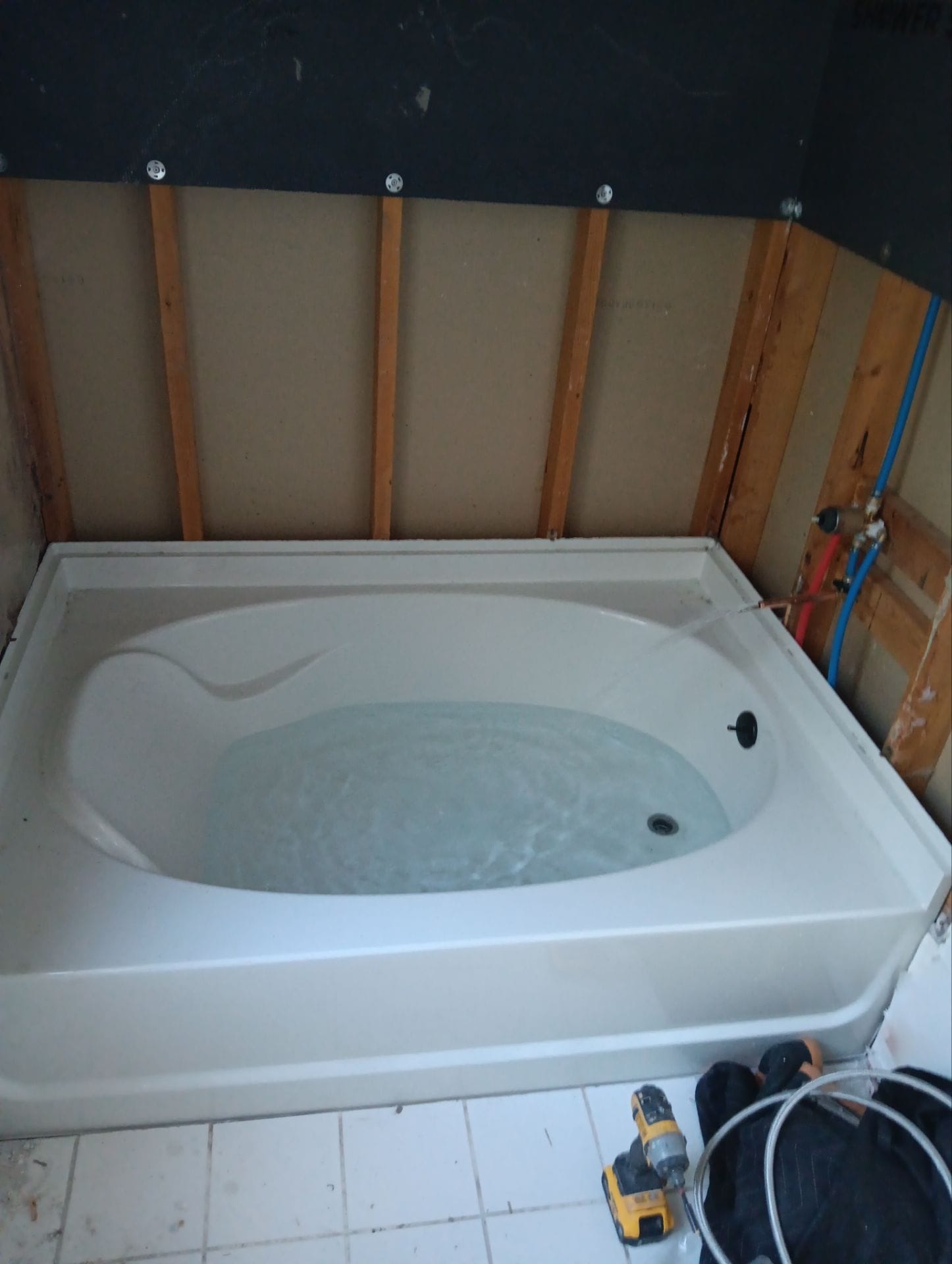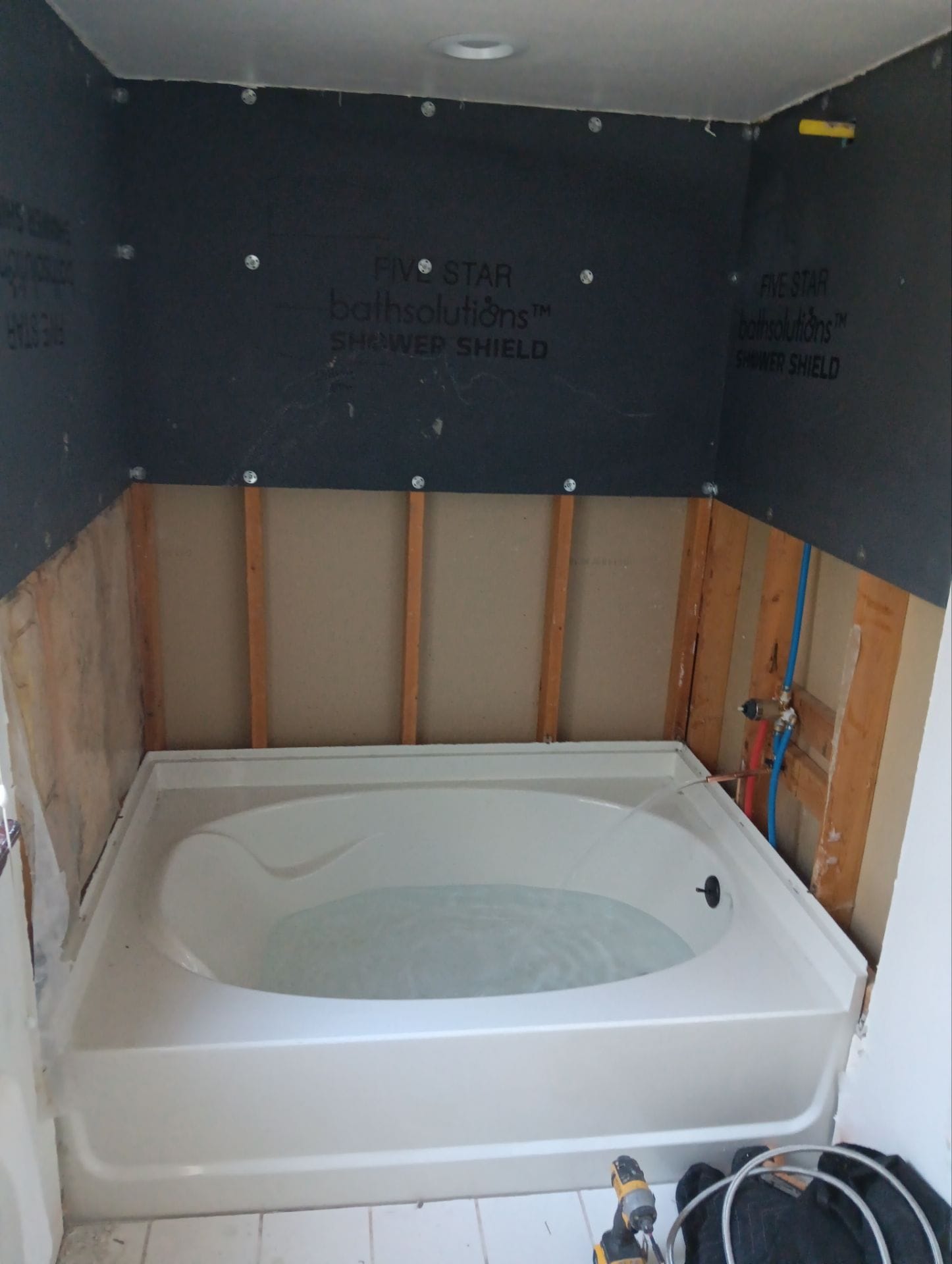 Installation followed the standard process beginning with demolition to the studs. Images show the plumbing roughed in and tub water-tested before panels were installed. Five Star’s waterproof backer boards were secured in place and trimmed to accommodate the lighting recess. All work was completed without the use of a dumpster, and all materials were hauled away by trailer. The completed system showed tight wall-to-panel transitions and matched accessory placements.
