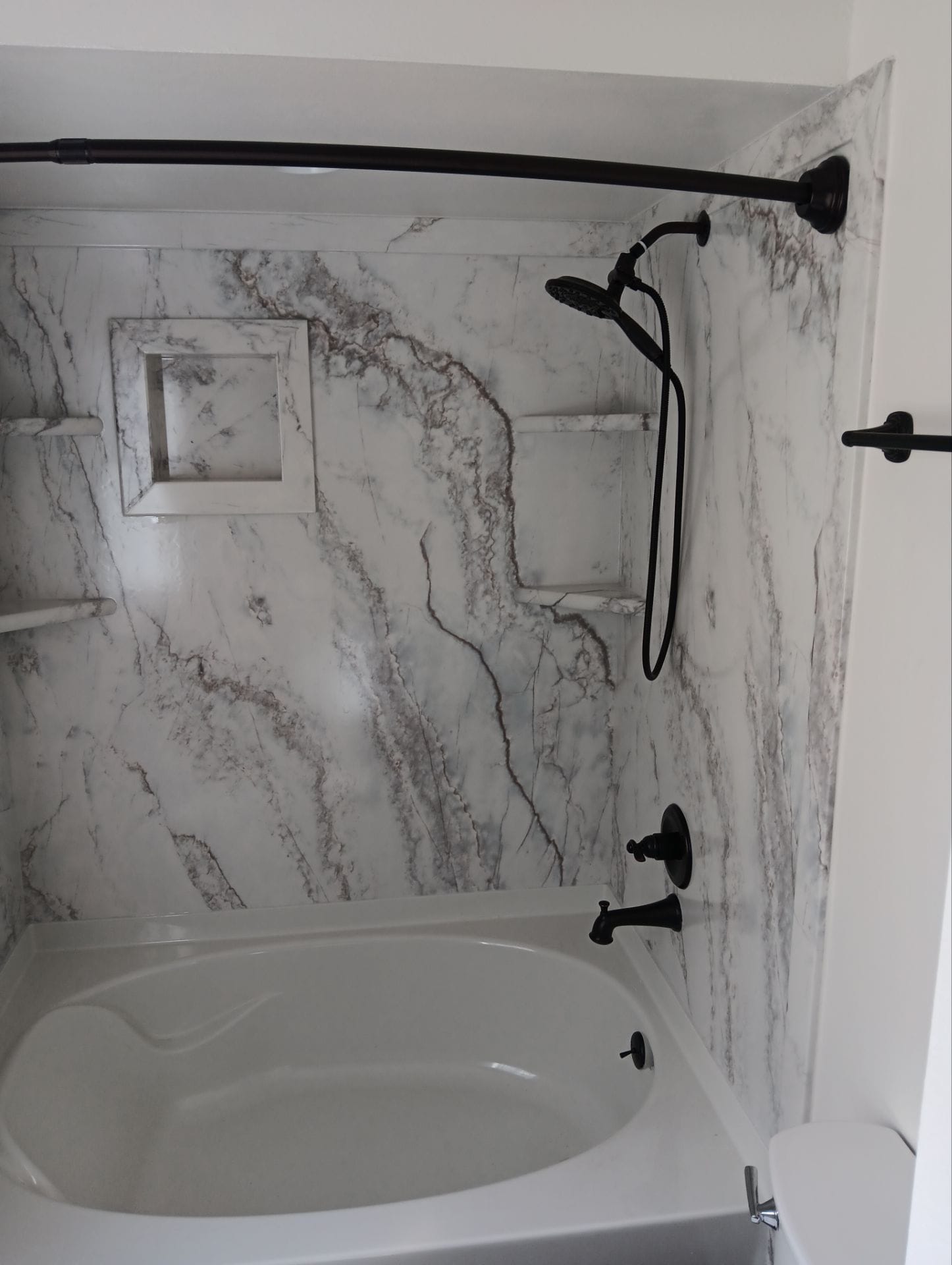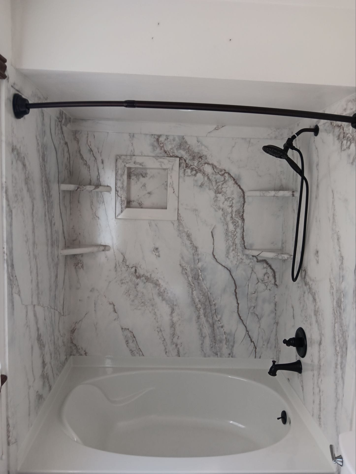 * Upstairs: 60x32 white soaking tub with curved backrest, Centrel composite wall system in marble pattern, three corner shelves, recessed niche, curved curtain rod, matte black Delta fixtures