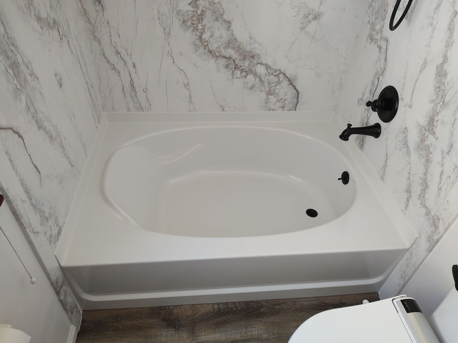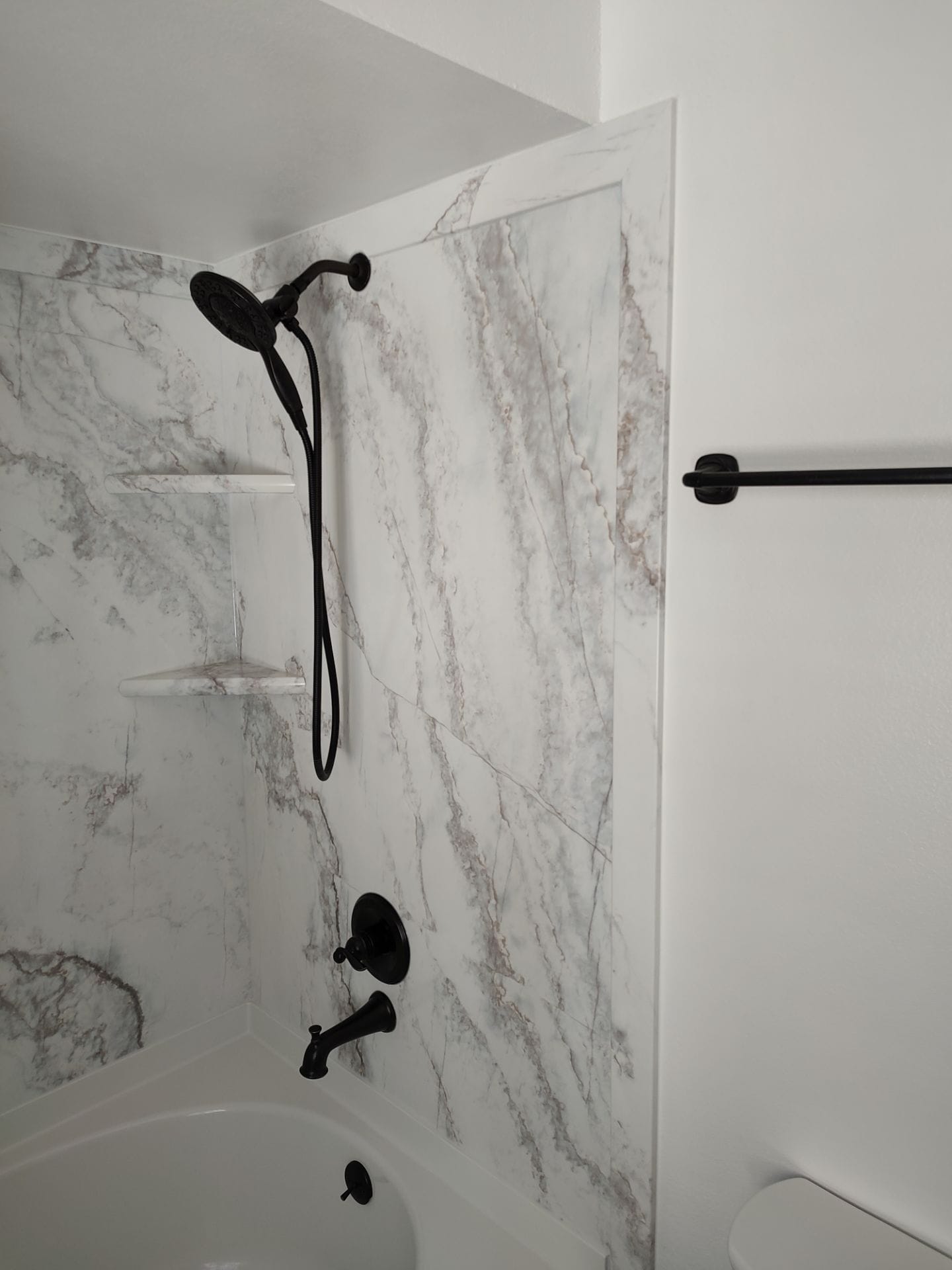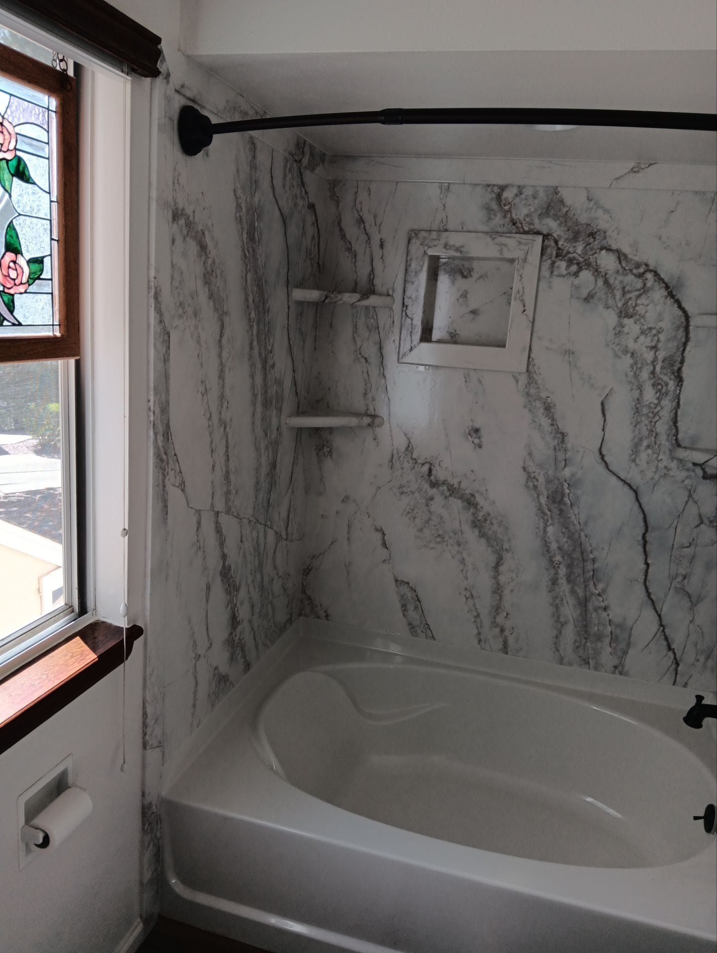 The new upstairs tub system included a white, contoured soaking tub with a curved backrest, paired with high-contrast Centrel composite panels in a marble design with gray and taupe veining. The matte black Delta fixture package included a wall-mounted tub spout, control trim, and handheld showerhead with slide bar. Three corner shelves were integrated for storage, and a matching black curved curtain rod was installed. A recessed niche was centered on the back wall for additional utility. One safety bar was originally planned but not installed per the final photos. The flooring was replaced with a weathered wood-look plank that matched the updated window trim.