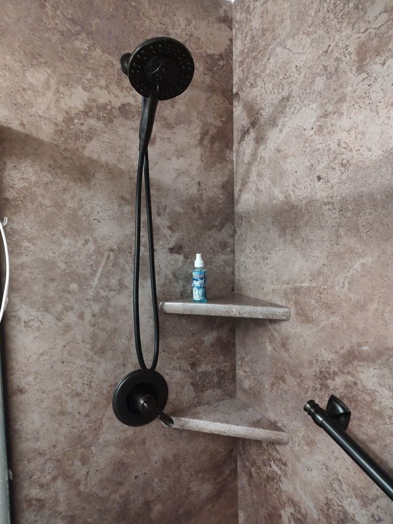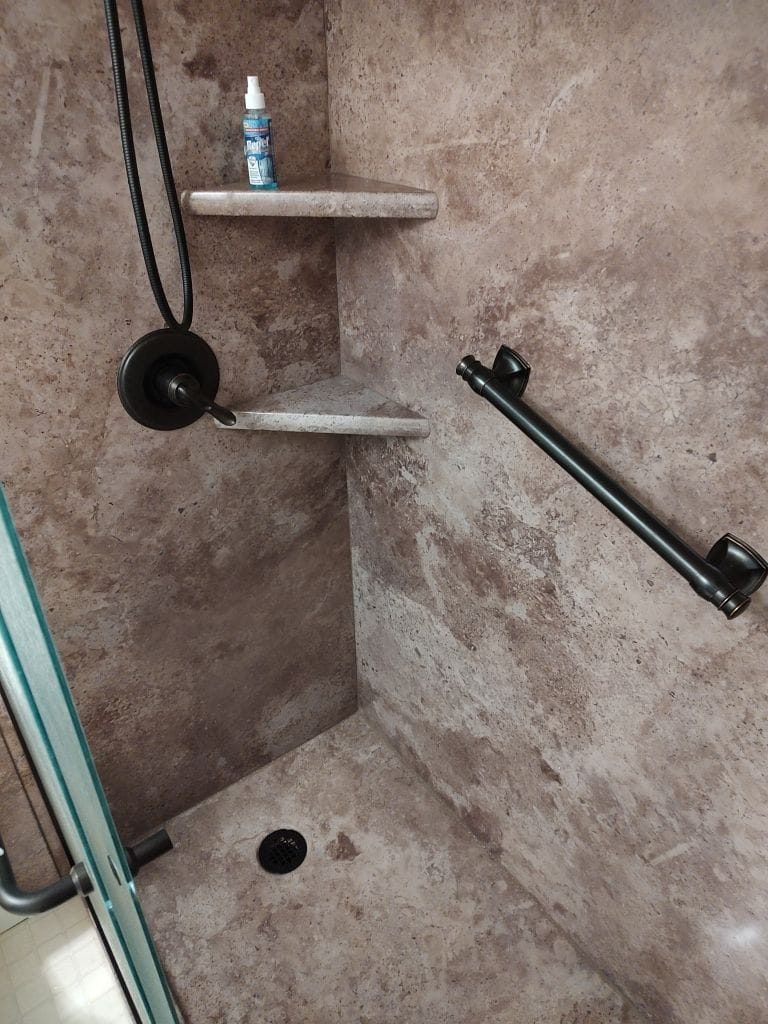 * Walk-in shower conversion with matte black Delta fixtures