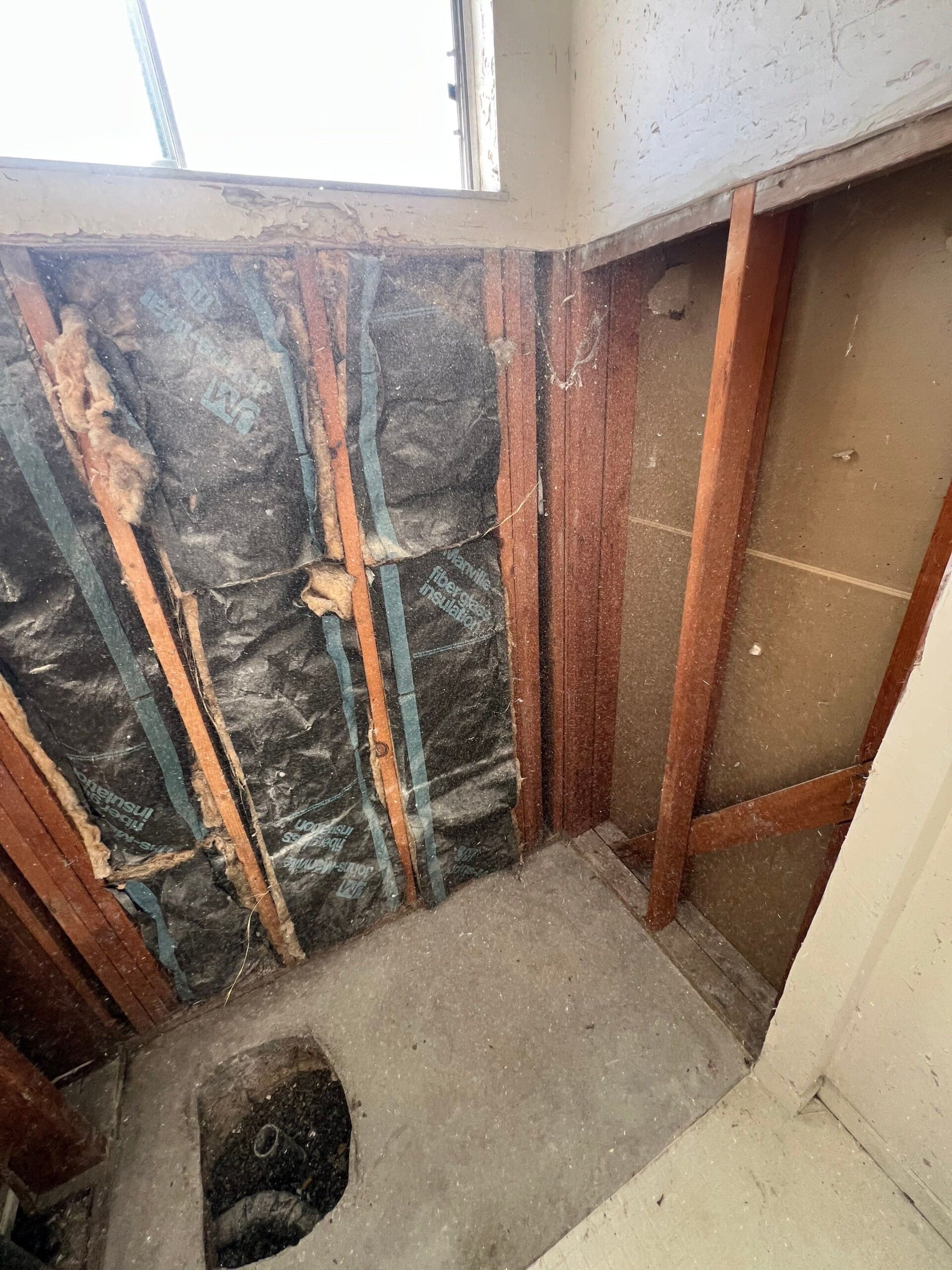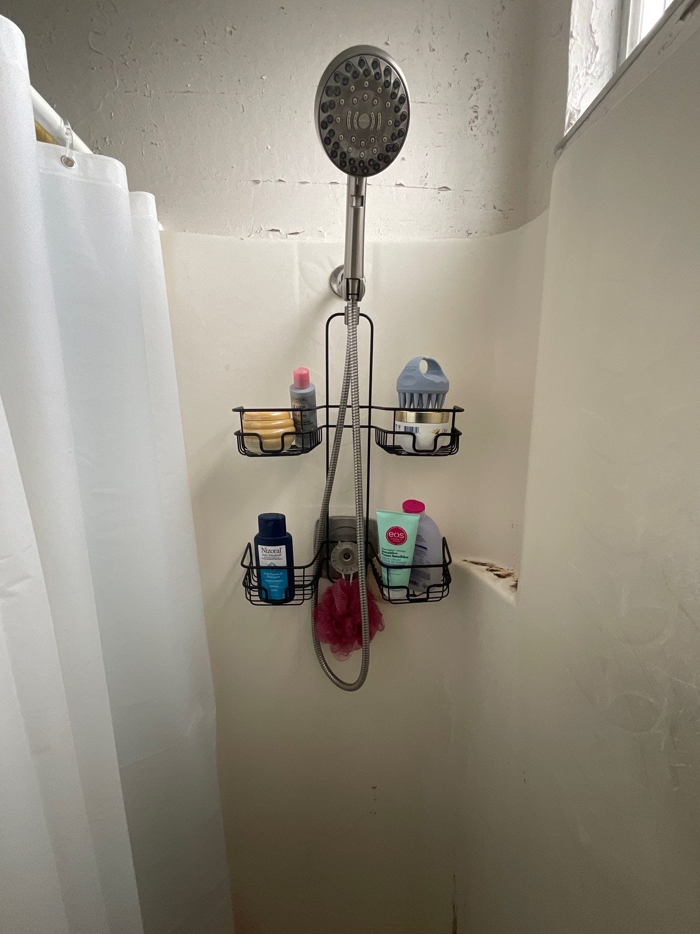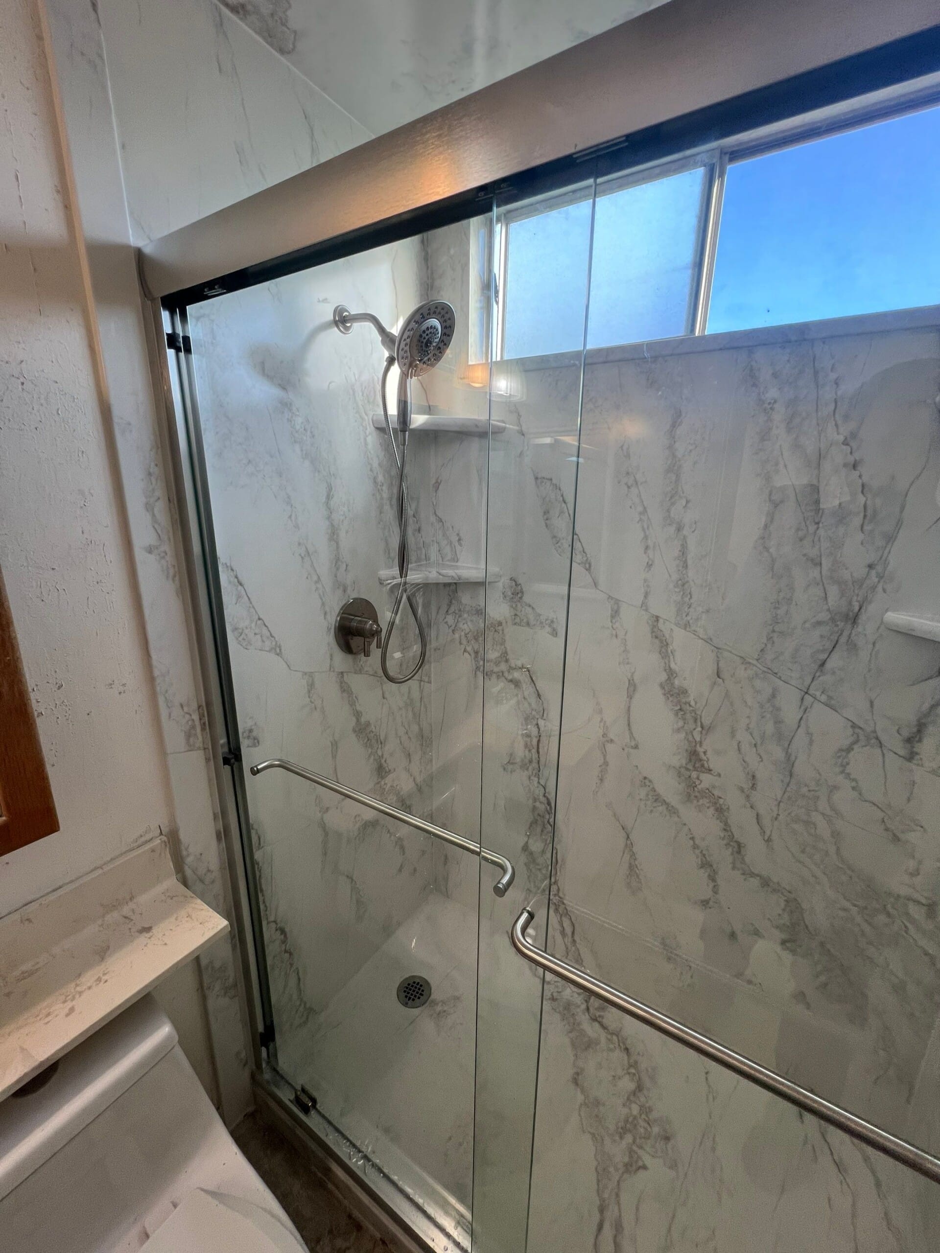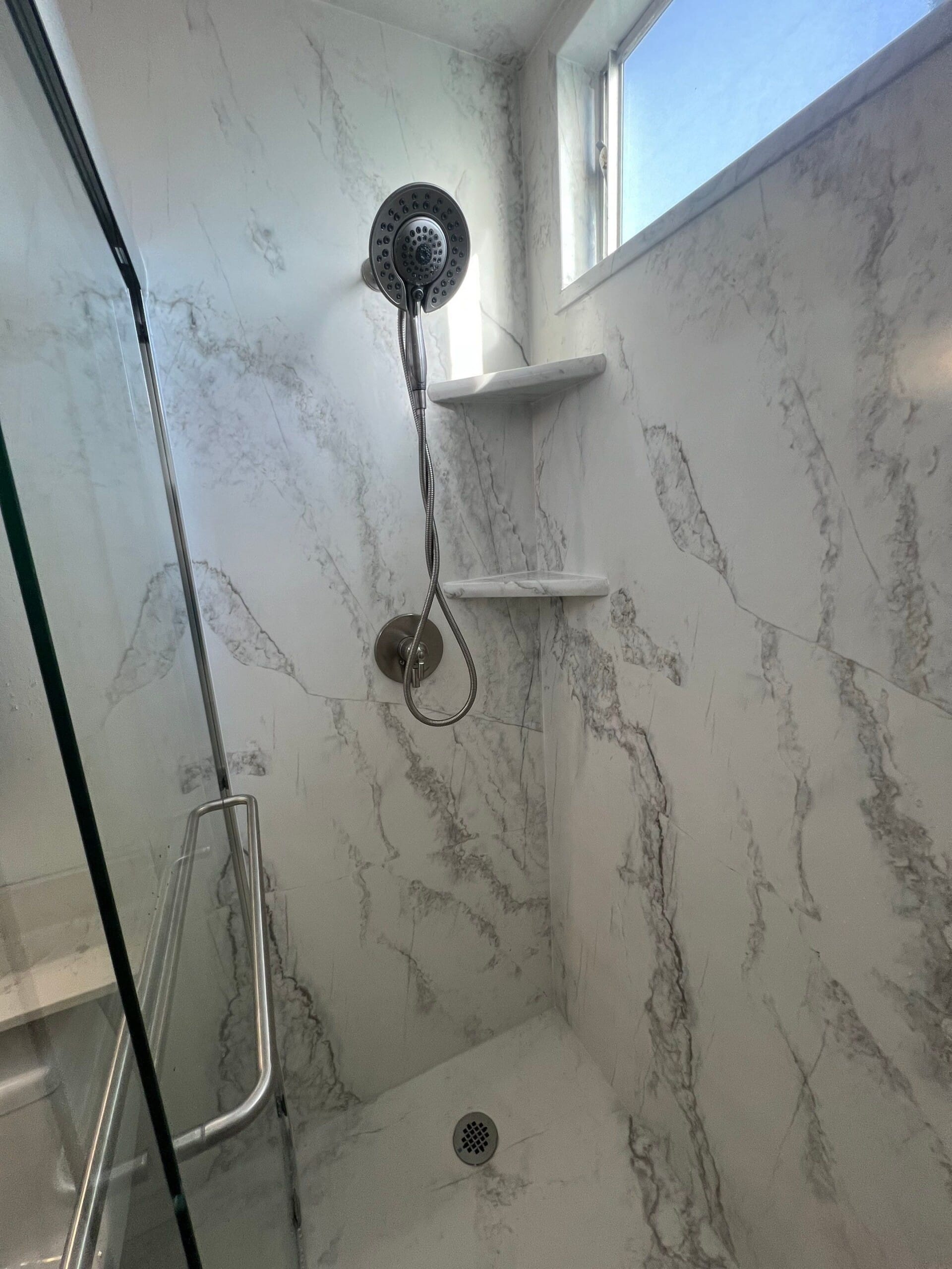 The remodel was executed with a complete tear-out of the old stall, followed by reconstruction using proprietary waterproof backer boards and a non-slip shower base. Full-height wall panels were installed in a bright marble finish with light gray veining, extending seamlessly to a matching ceiling surround. The team added corner shelving for organized product storage and installed new sliding frameless glass doors with brushed nickel hardware. The new handheld shower head and valve system completed the transformation. Work was completed efficiently over two days, with all debris removed and the workspace fully cleaned upon exit.
