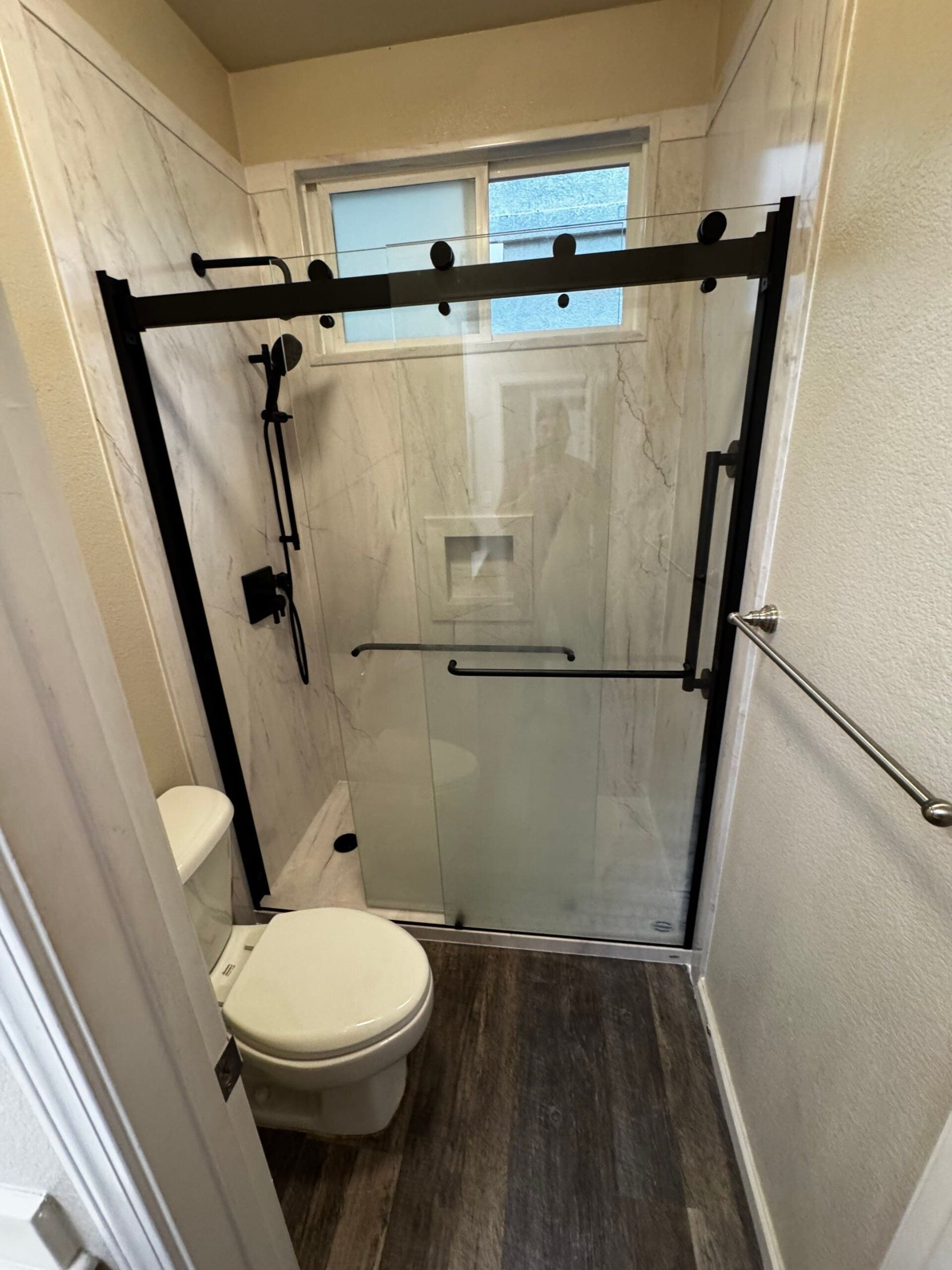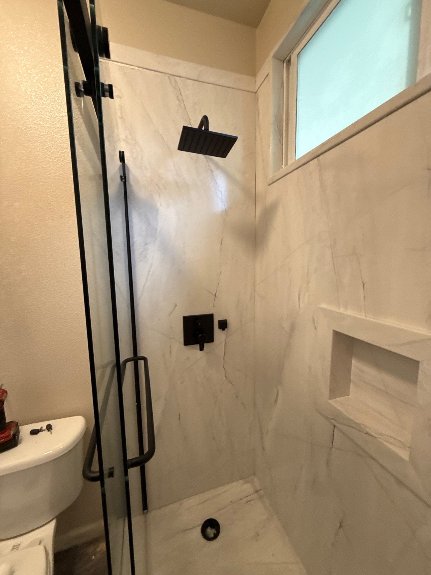 The remodel was planned with a two-day installation window following a lead time of six to eight weeks from commitment. The installation process included full demolition to the studs, plumbing updates using PEX, and waterproofing with proprietary shower shield backer boards. The new shower incorporated a non-slip pan, matching wall systems, a recessed niche for storage, and matte black finishes throughout. The team finalized the upgrade with a modern sliding glass barn-style door and ensured the workspace was left clean, with all materials removed upon completion.