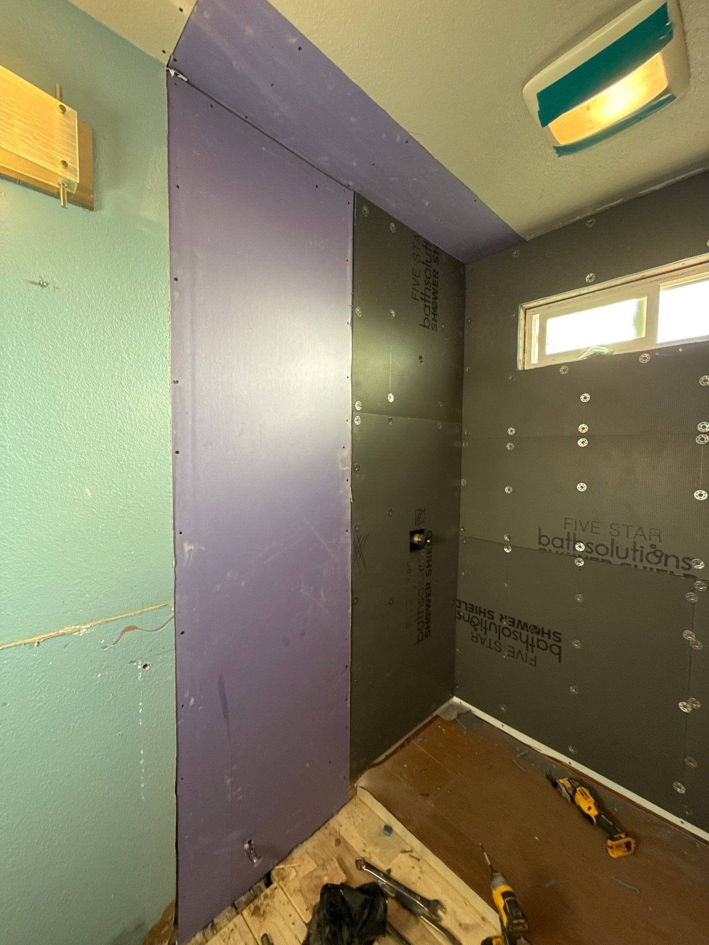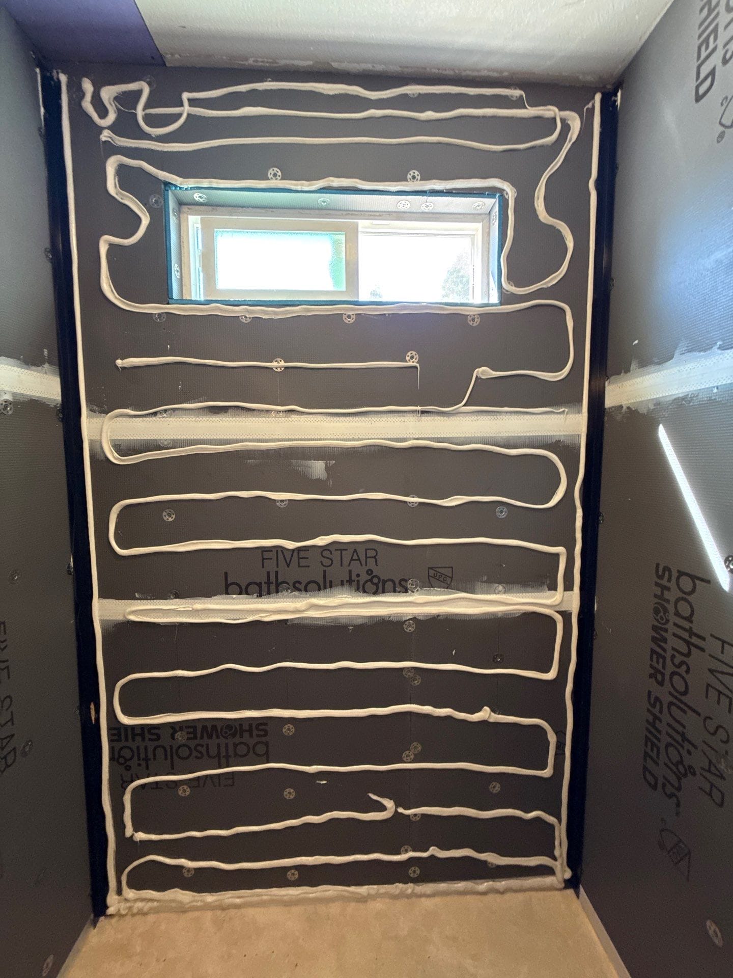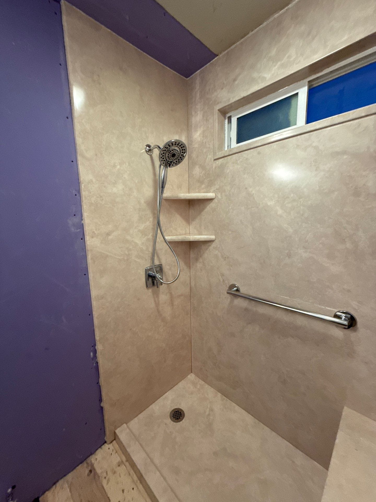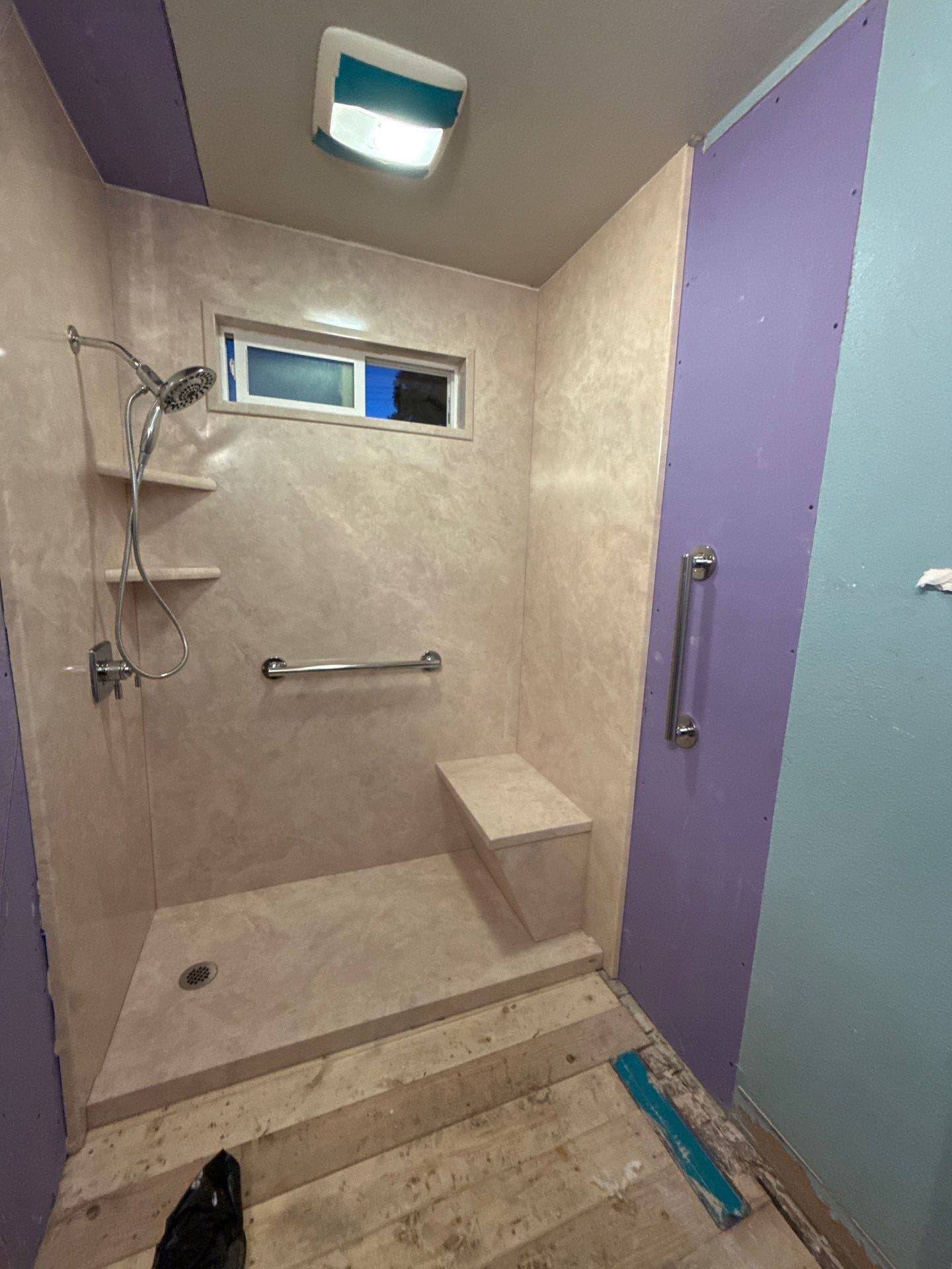 Installation involved removal of the original tub and wall materials, followed by inspection of the framing and plumbing areas to ensure a stable foundation for the new system. Crew installed updated plumbing connections, waterproof backer protection, and the grout-free composite wall panels before completing installation of the shower base, fixtures, shelving, and bench seating. Window opening within the bathing space was preserved and integrated into the new surround system. Installation work typically occurs over a short construction window once materials and scheduling are finalized, with the worksite protected and cleaned throughout the process.