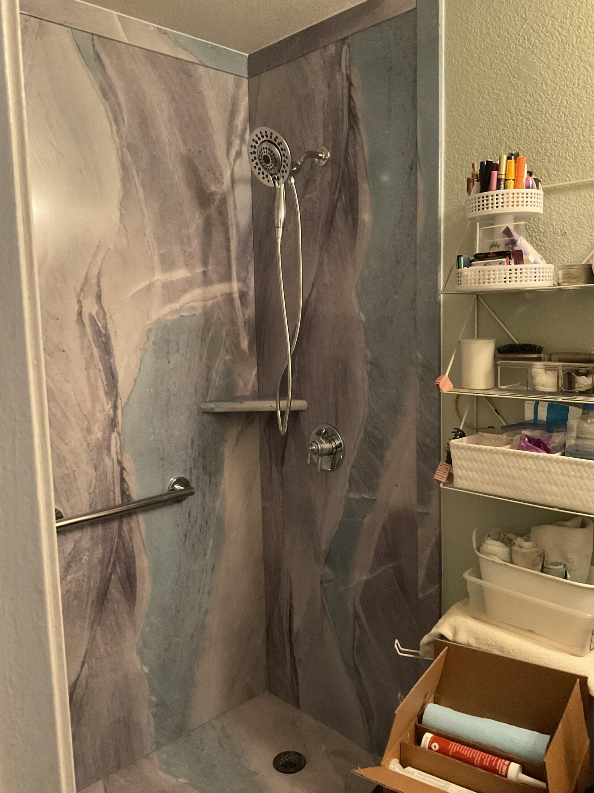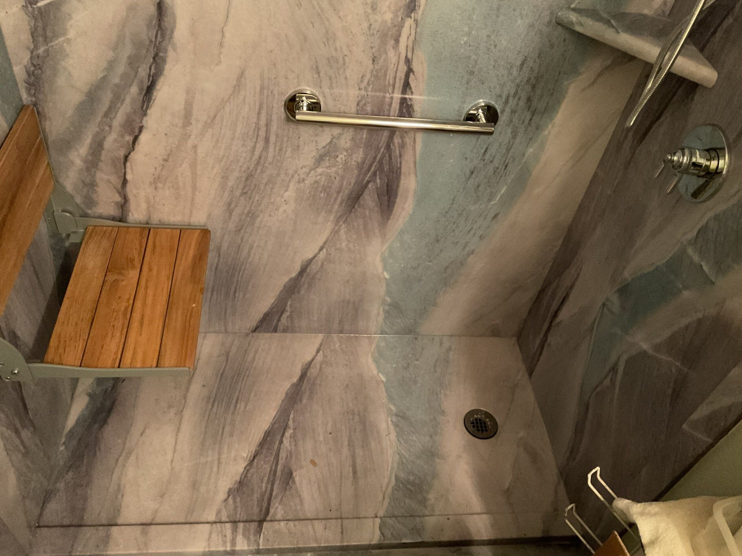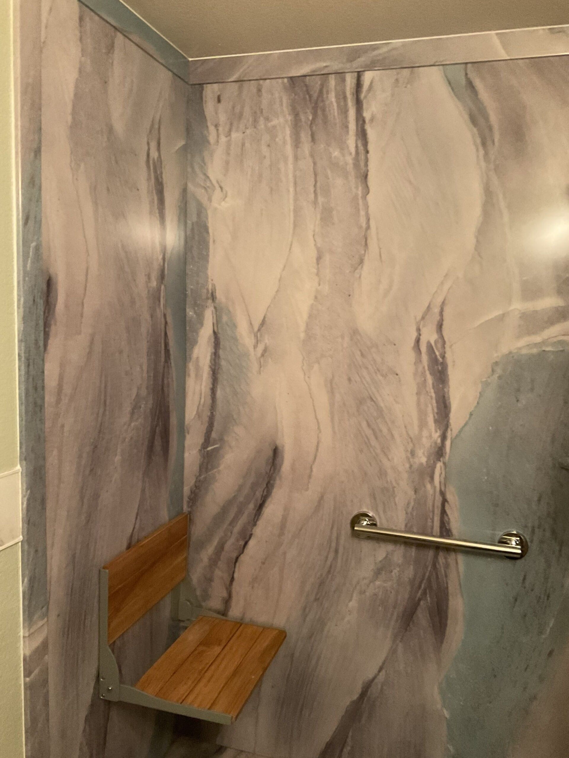Installation, explained by Koren, completed in one day. Crew demoed existing tub, protected surrounding areas, and installed the new base, Shower Shield backer board, panels, grab bars, bench, corner shelf, and valve trim. Original plumbing remained in place, and no changes were needed to surrounding floor or walls. Site was cleaned same day and ready for use.