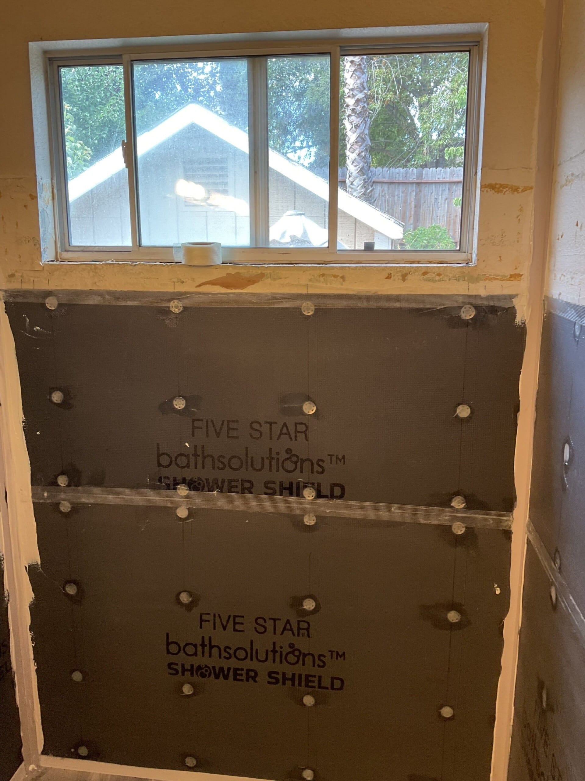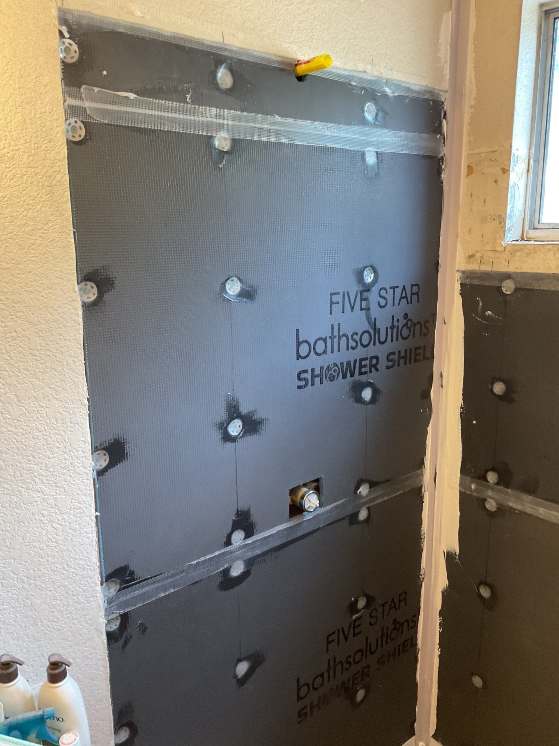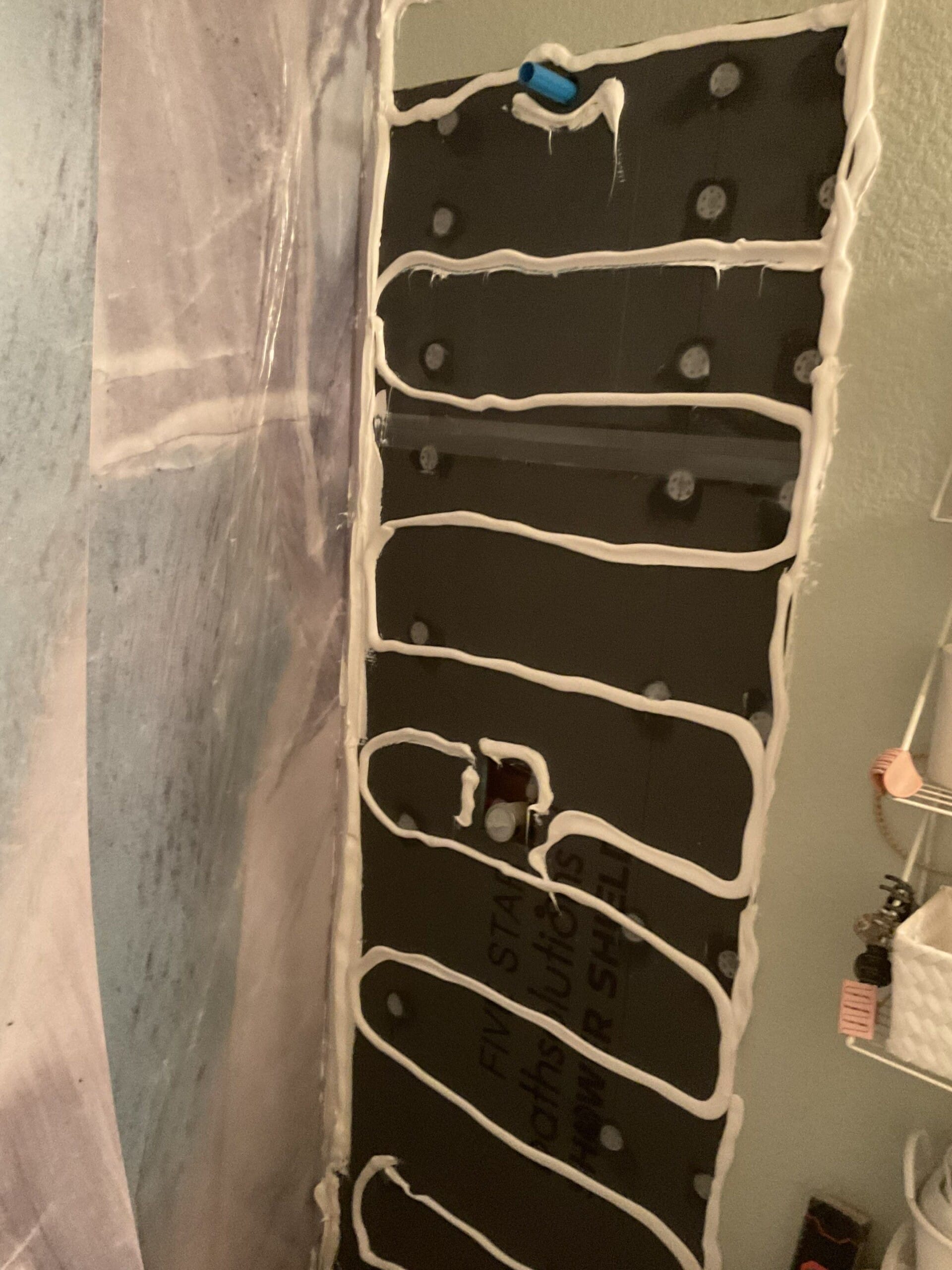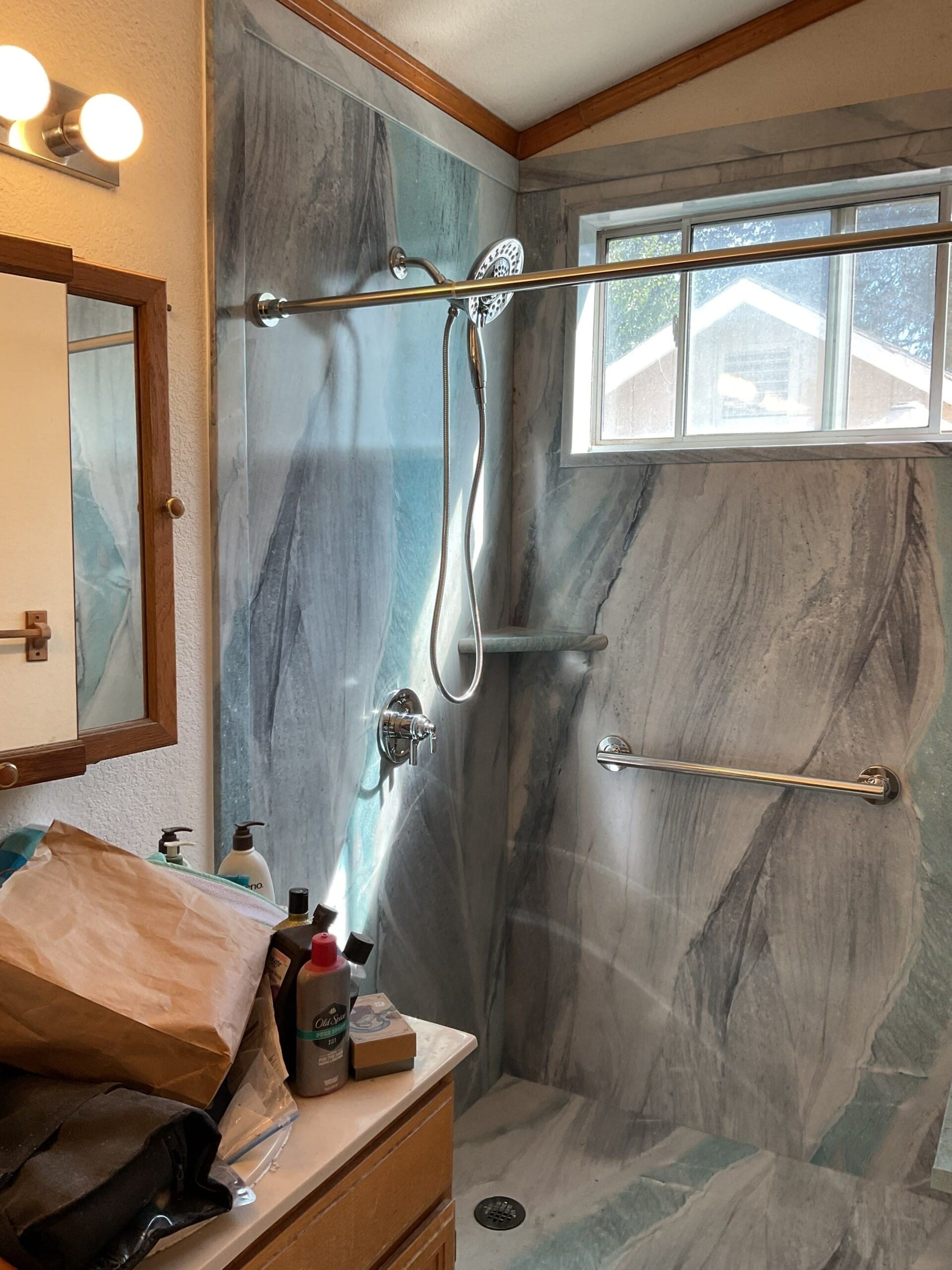 Installation, explained by Koren, completed in one day. Crew demoed existing tub, protected surrounding areas, and installed the new base, Shower Shield backer board, panels, grab bars, bench, corner shelf, and valve trim. Original plumbing remained in place, and no changes were needed to surrounding floor or walls. Site was cleaned same day and ready for use.