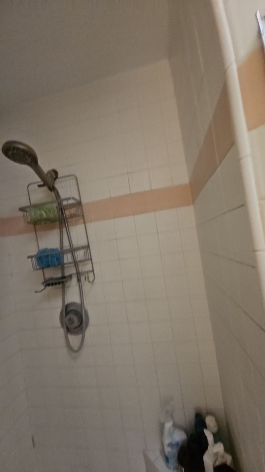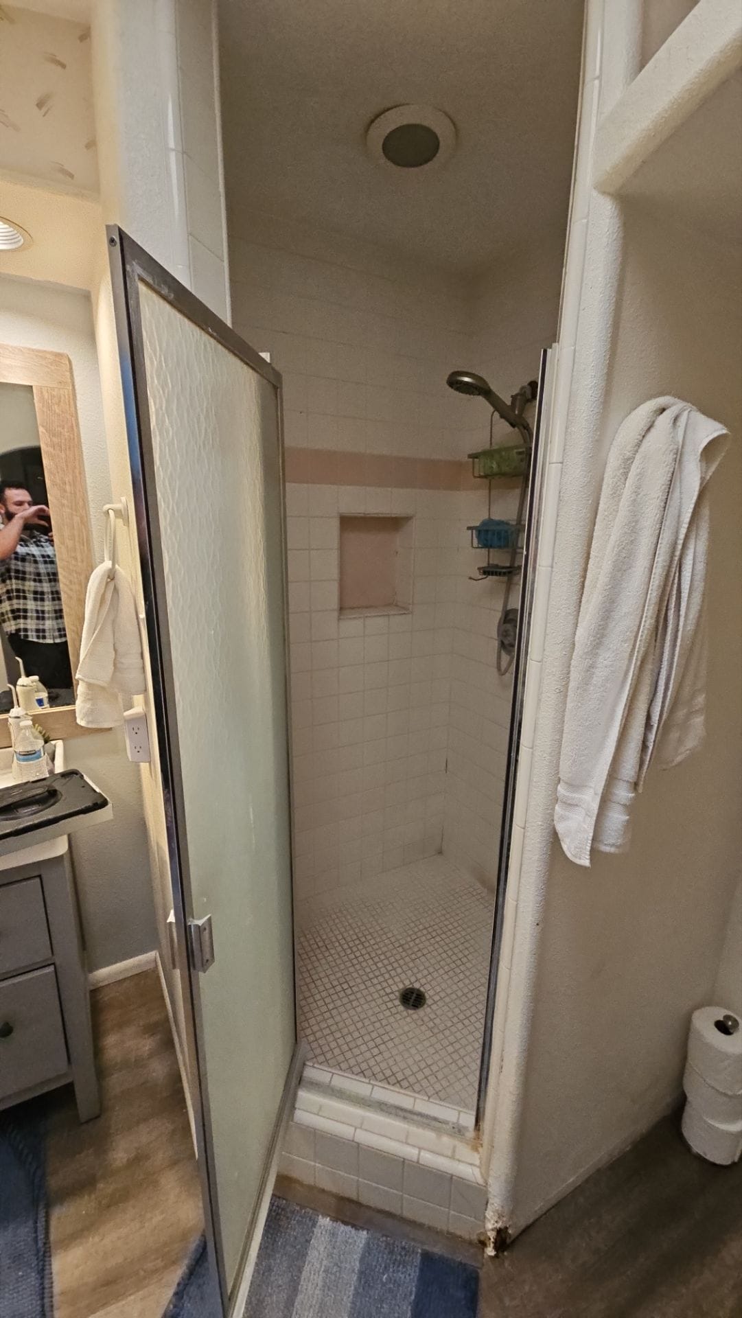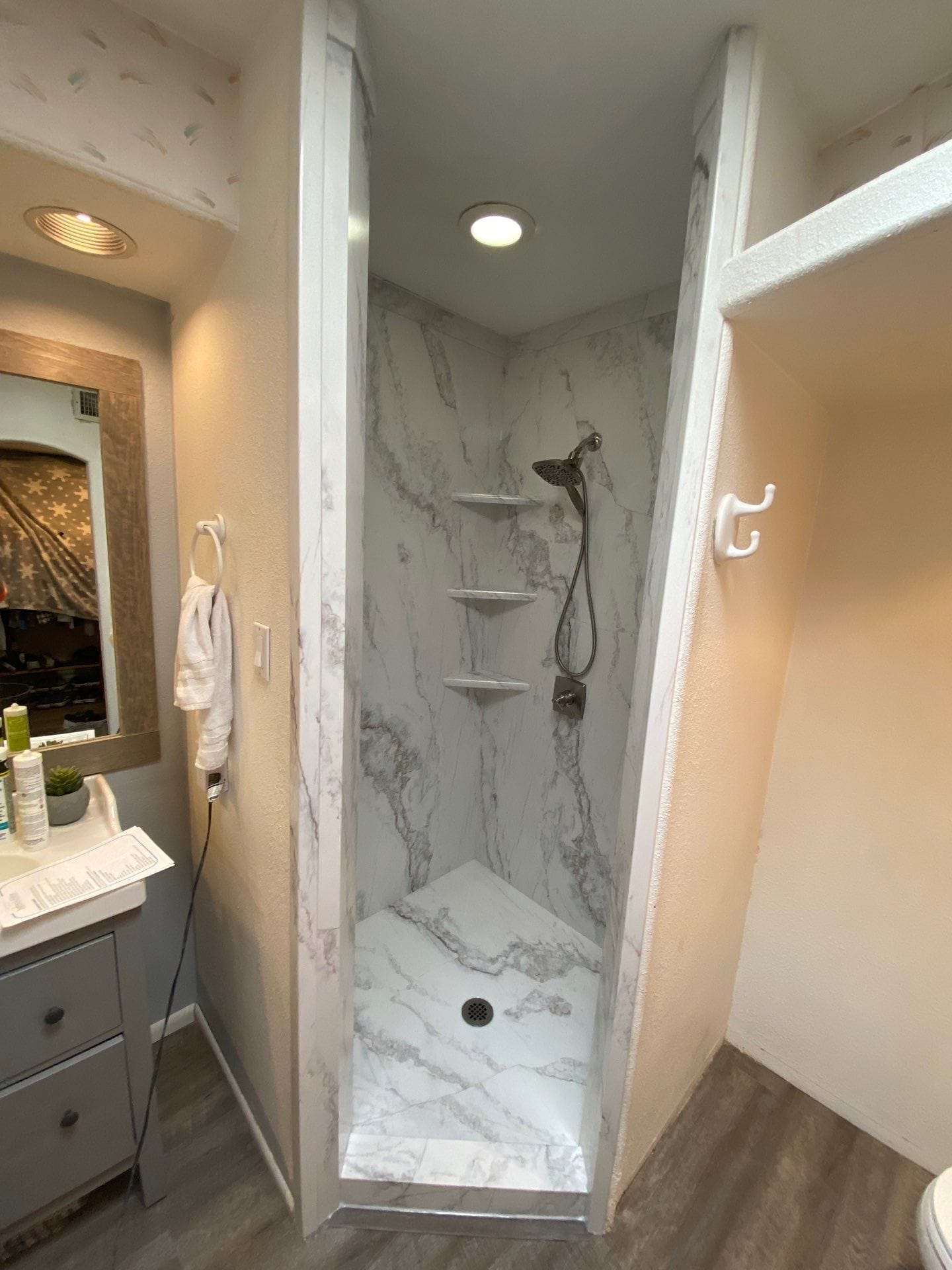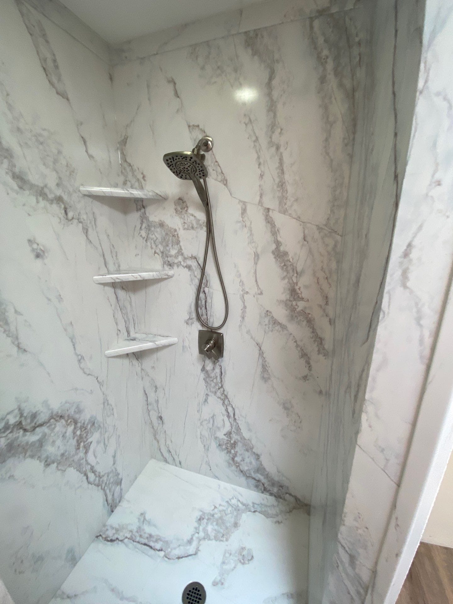 The remodel introduced marble-inspired, grout-free composite panels with dramatic veining in a bright finish to visually expand the narrow alcove. The original white tile was removed down to the studs and replaced with full-height seamless panels trimmed to the enclosure dimensions. Three matching corner shelves were integrated into the layout for efficient vertical storage while maintaining an open interior. The shower floor was rebuilt with a new low-threshold composite base in matching marble tone. Brushed nickel hardware was used for the updated handheld shower system and valve, delivering a softer metallic contrast to the panel finish.