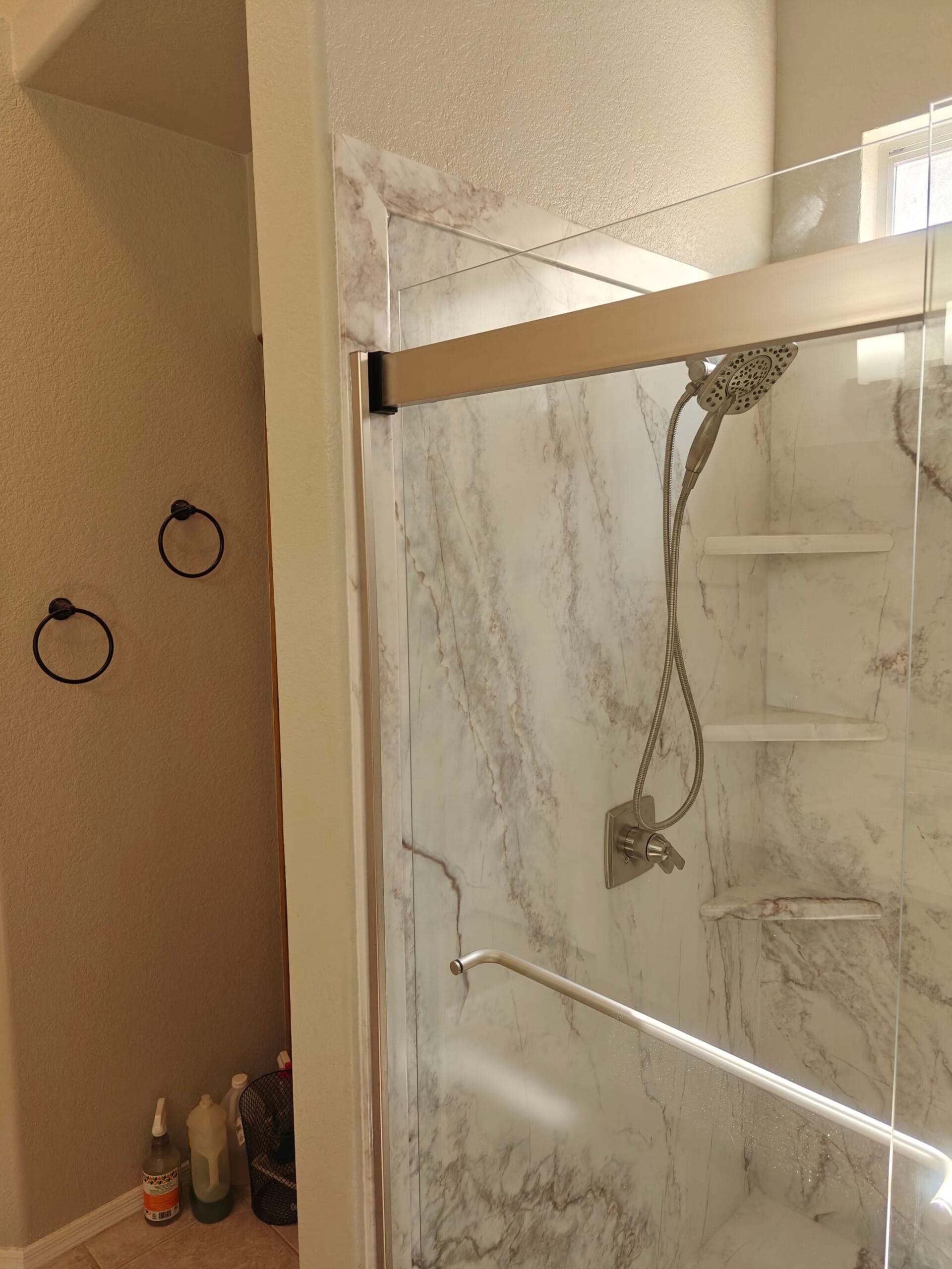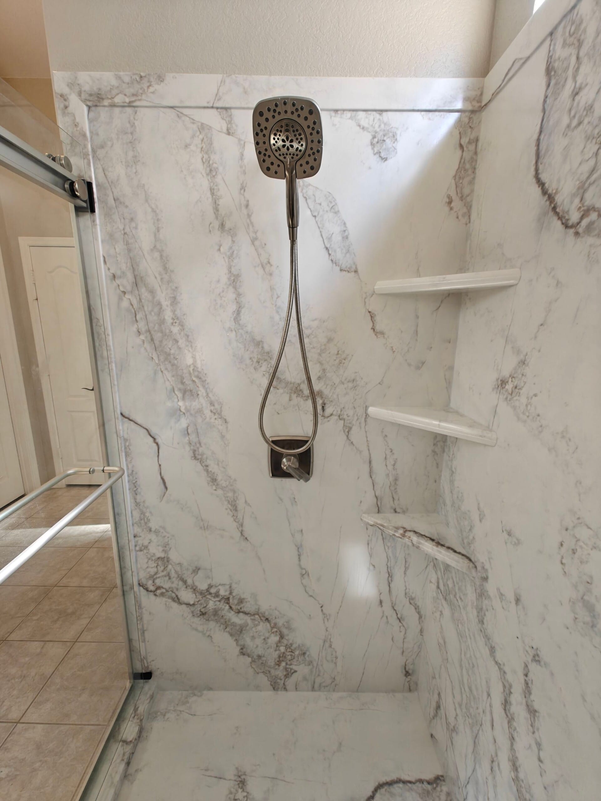 The final remodel introduced Smart Choice marble-style composite wall panels that extended to ceiling height. The seamless six-layer system eliminated grout lines and created a clean, high-contrast appearance under natural light from the nearby window. Two built-in corner shelves were positioned vertically for streamlined storage. The base was rebuilt with a low-threshold pan matched to the wall finish for a continuous look. A handheld shower with brushed nickel finish was installed in place of the original fixture, paired with a modern single-handle valve. The enclosure was completed with a sliding glass barn-style door and straight stainless steel handles inside and out.