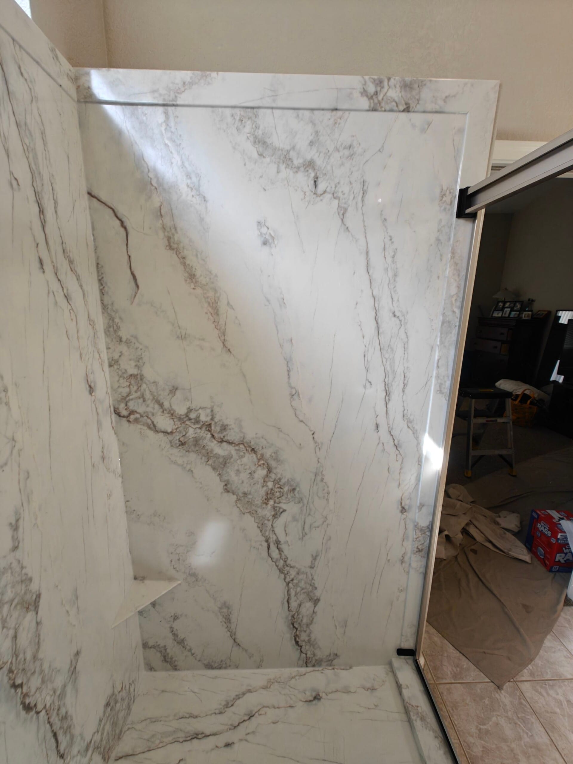 Joey LeBlanc guided the homeowner through all available options, ultimately recommending the Smart Choice package for its composite material thickness, antimicrobial protection, and cement foam backer. The marine-grade silicone sealant ensured long-term flexibility and protection from moisture intrusion. Joey explained how the system avoided common grout failures and offered a smooth surface that required no harsh cleaning products. The homeowner’s goals for easy maintenance and long-term stability aligned with the system’s design.