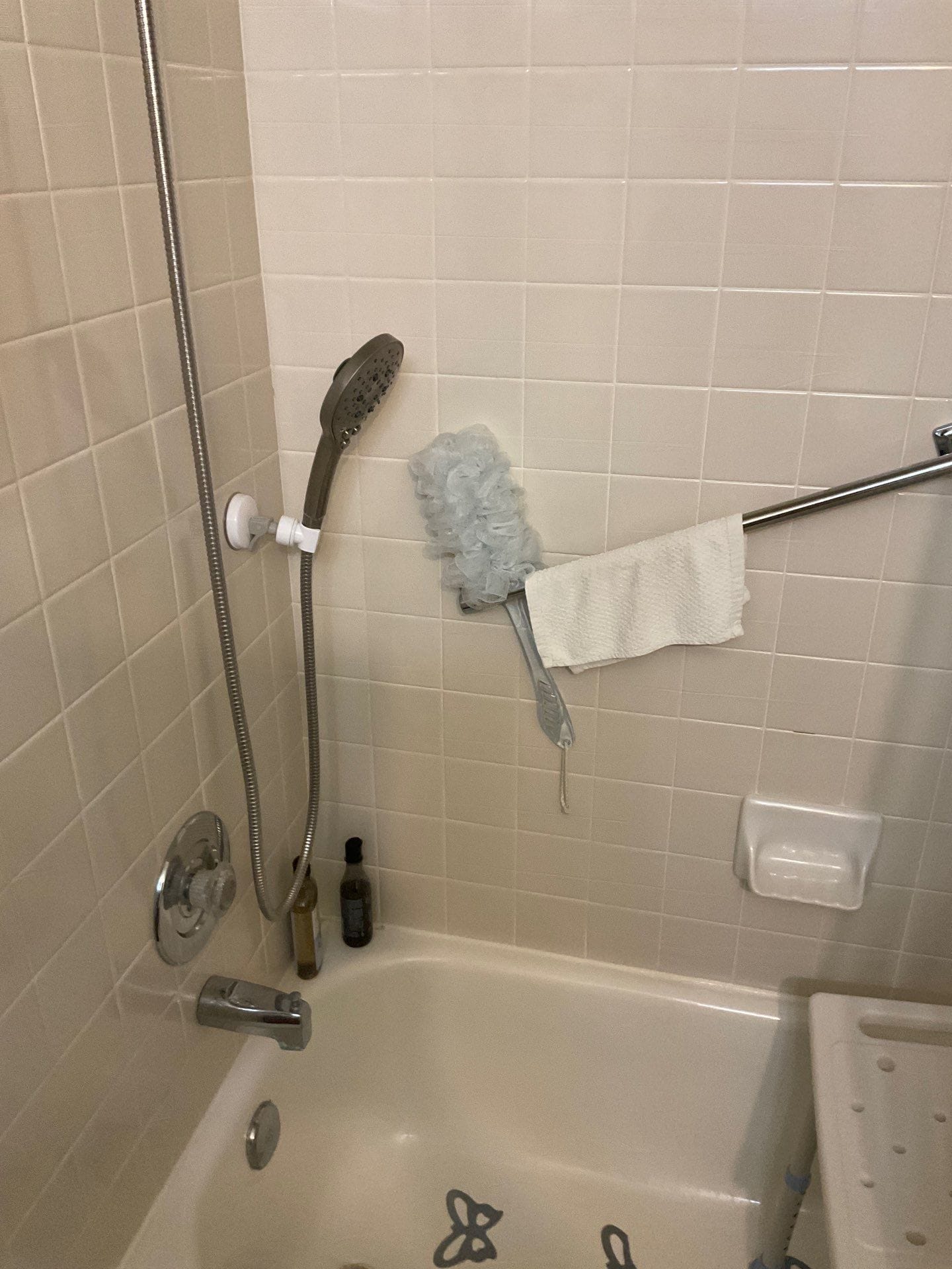 * Adjustable handheld showerhead on brushed nickel slide bar