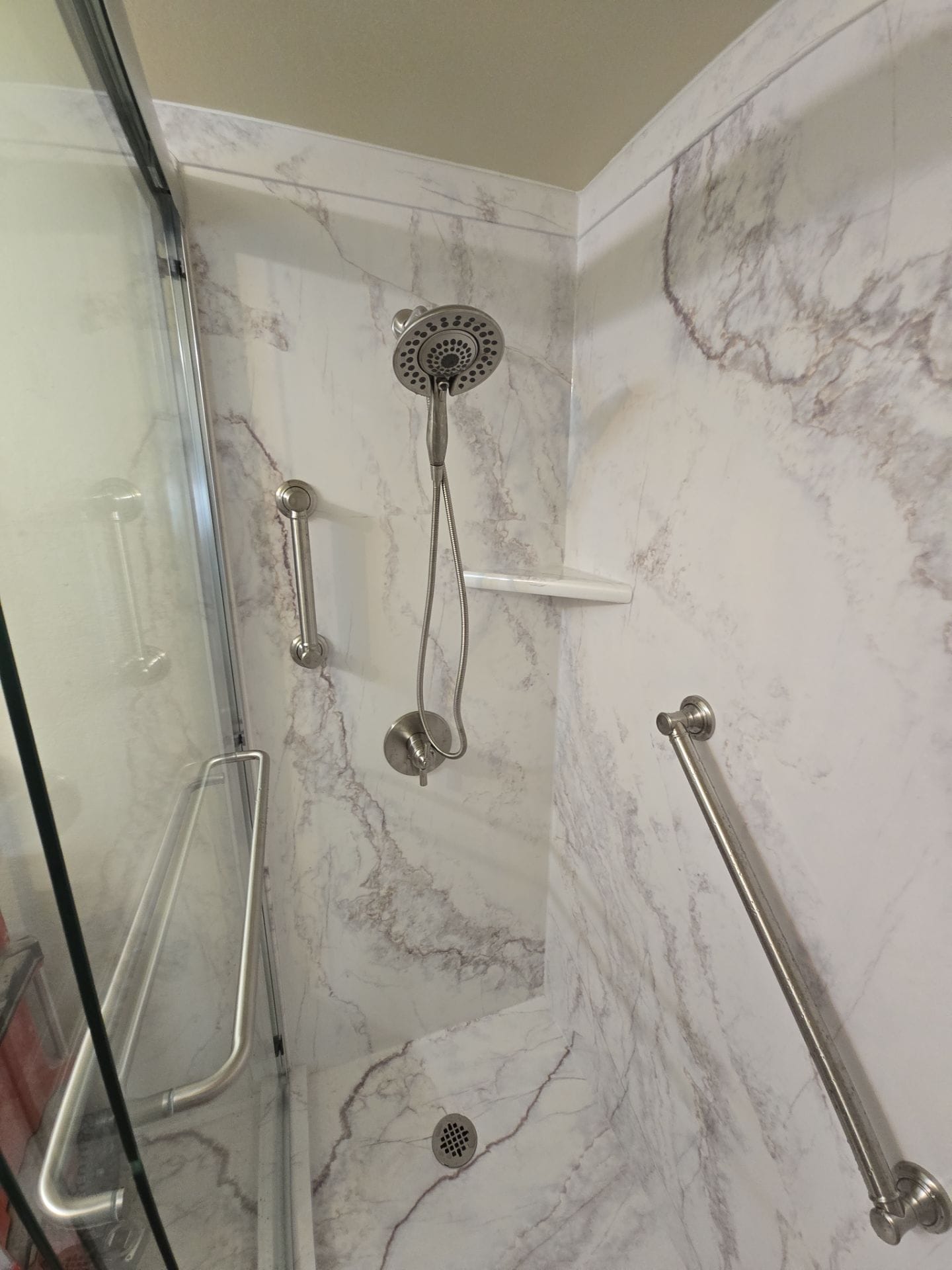 The Five Star Bath Solutions representative proposed a composite wall system with a stone-inspired finish to provide a brighter, more sophisticated appearance without the upkeep of tile or grout. The customer selected a Calacatta-style wall panel set paired with a brushed nickel hardware package that included grab bars, an adjustable handheld showerhead on a vertical slide bar, and trim-matched corner shelving. The system’s antimicrobial, grout-free surface and reinforced backing offered both hygiene and durability. A double grab bar configuration was installed for added stability, along with a sliding glass door to ensure water containment while keeping the space open and functional.