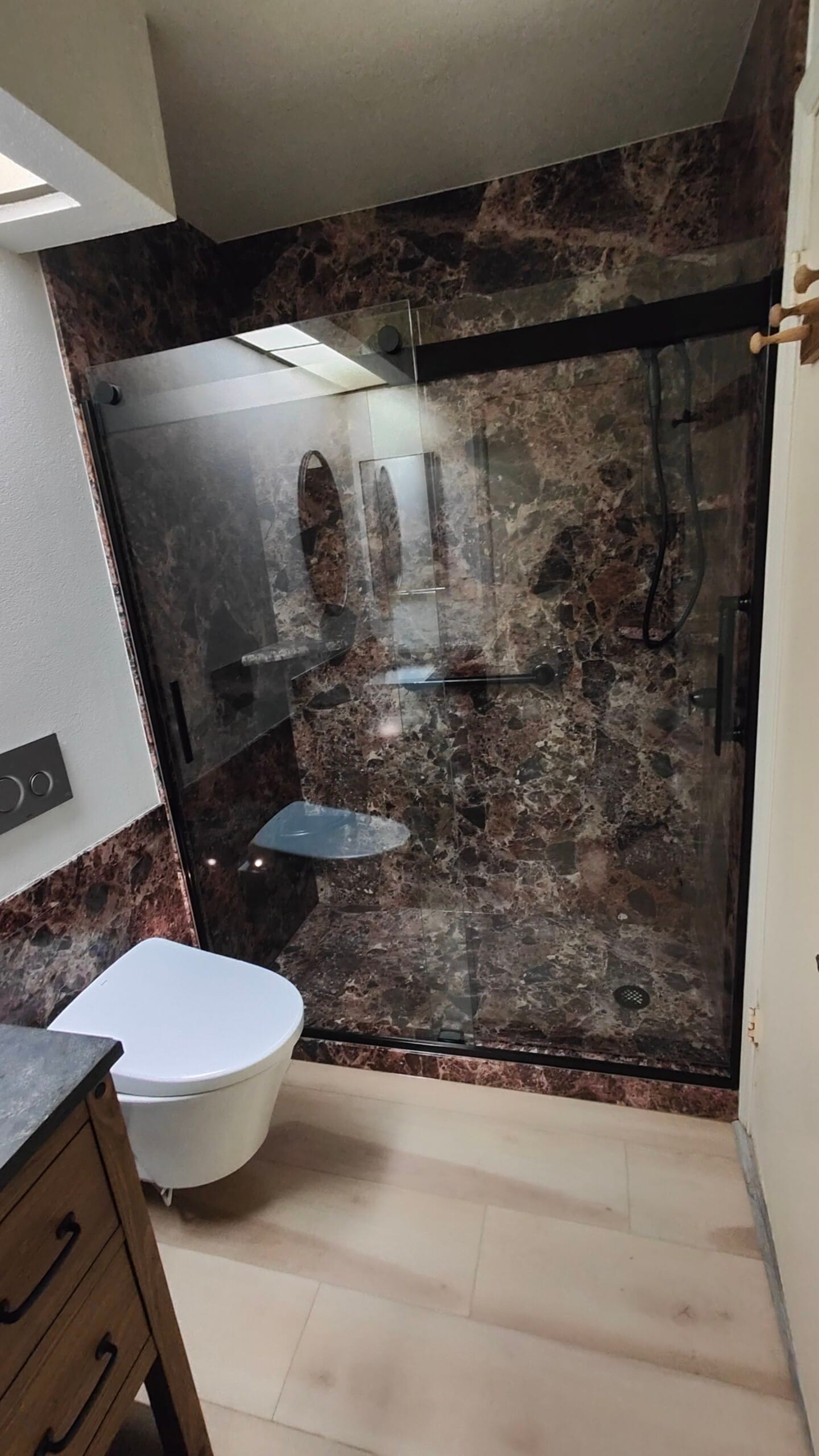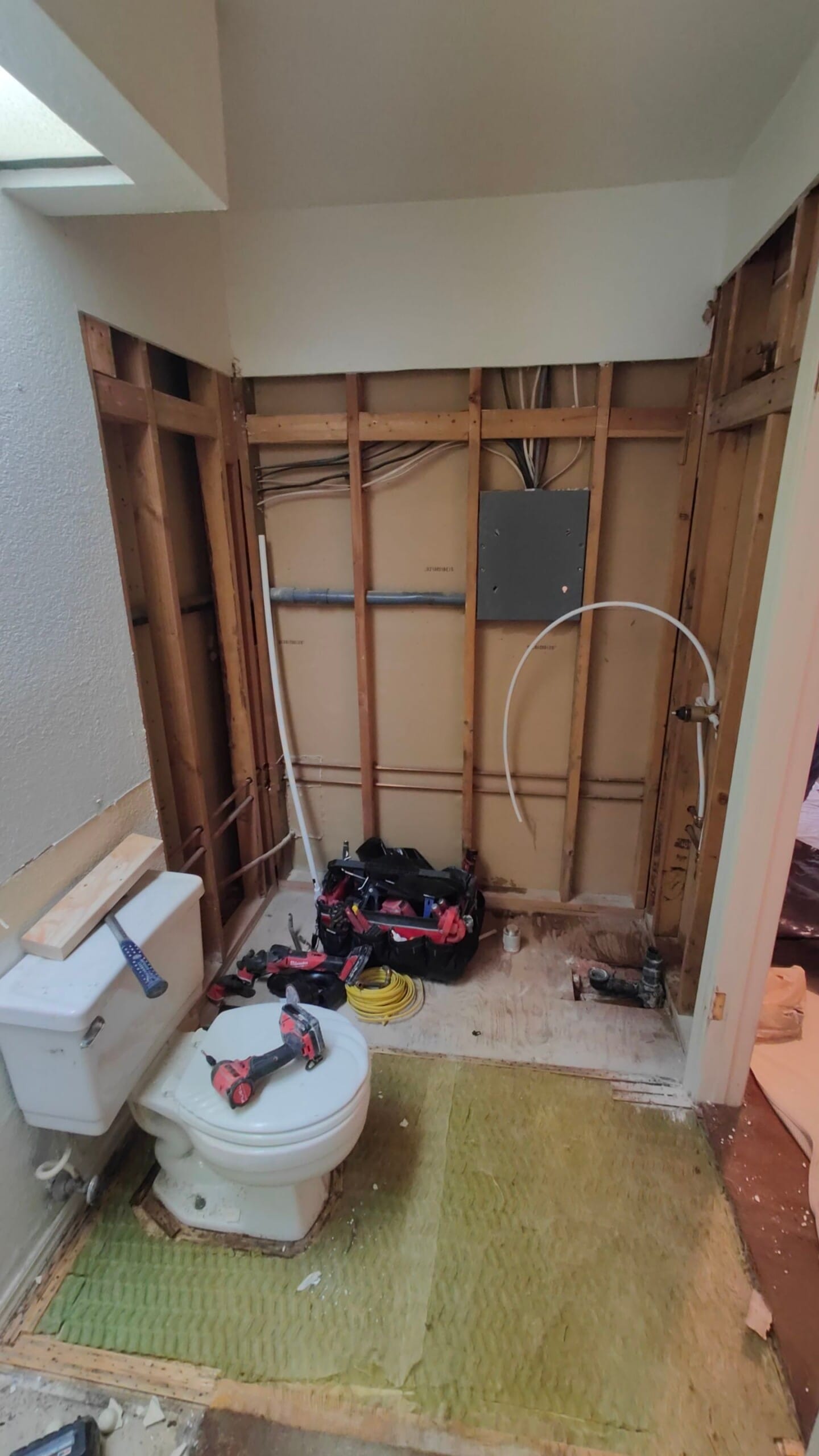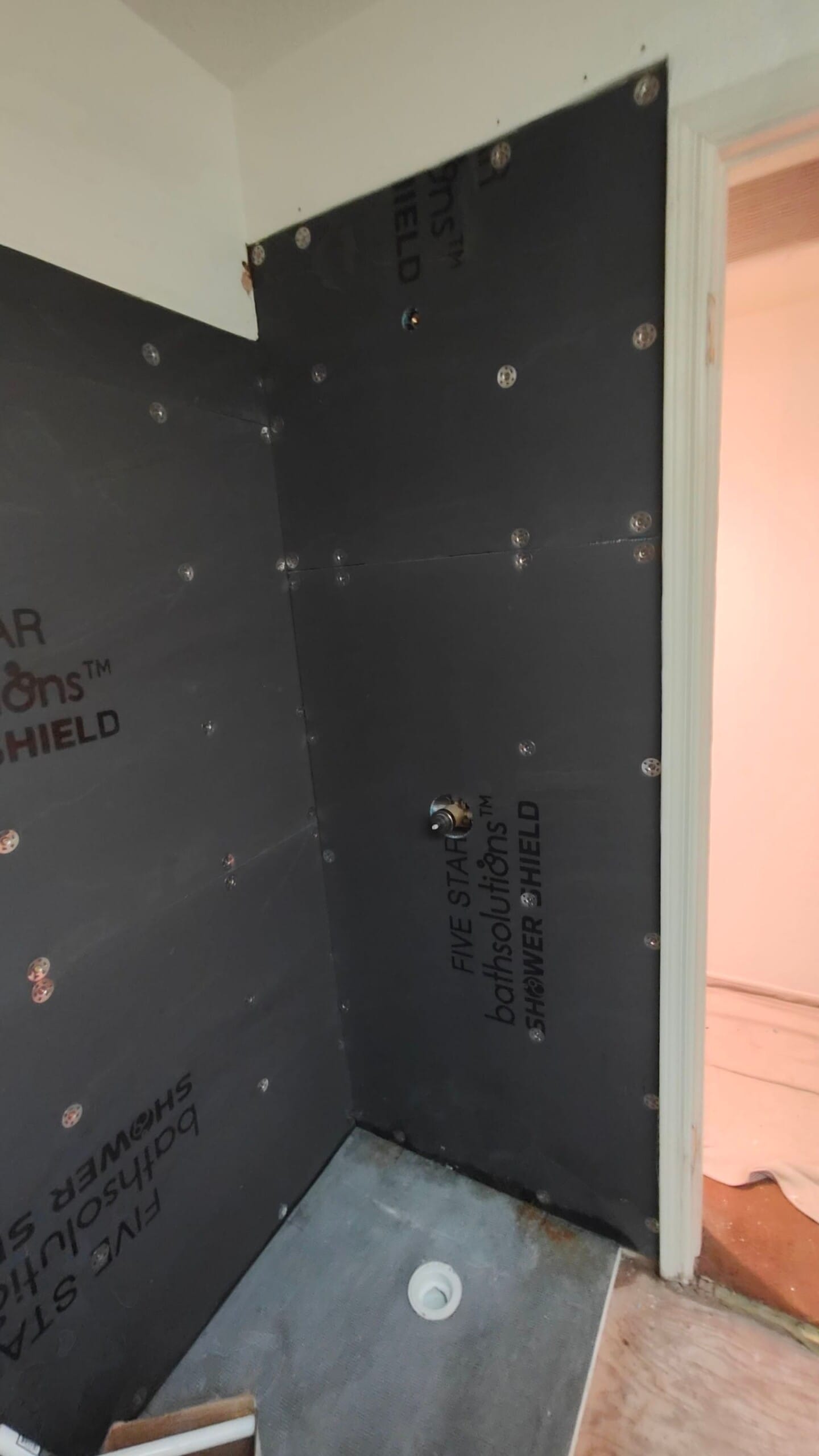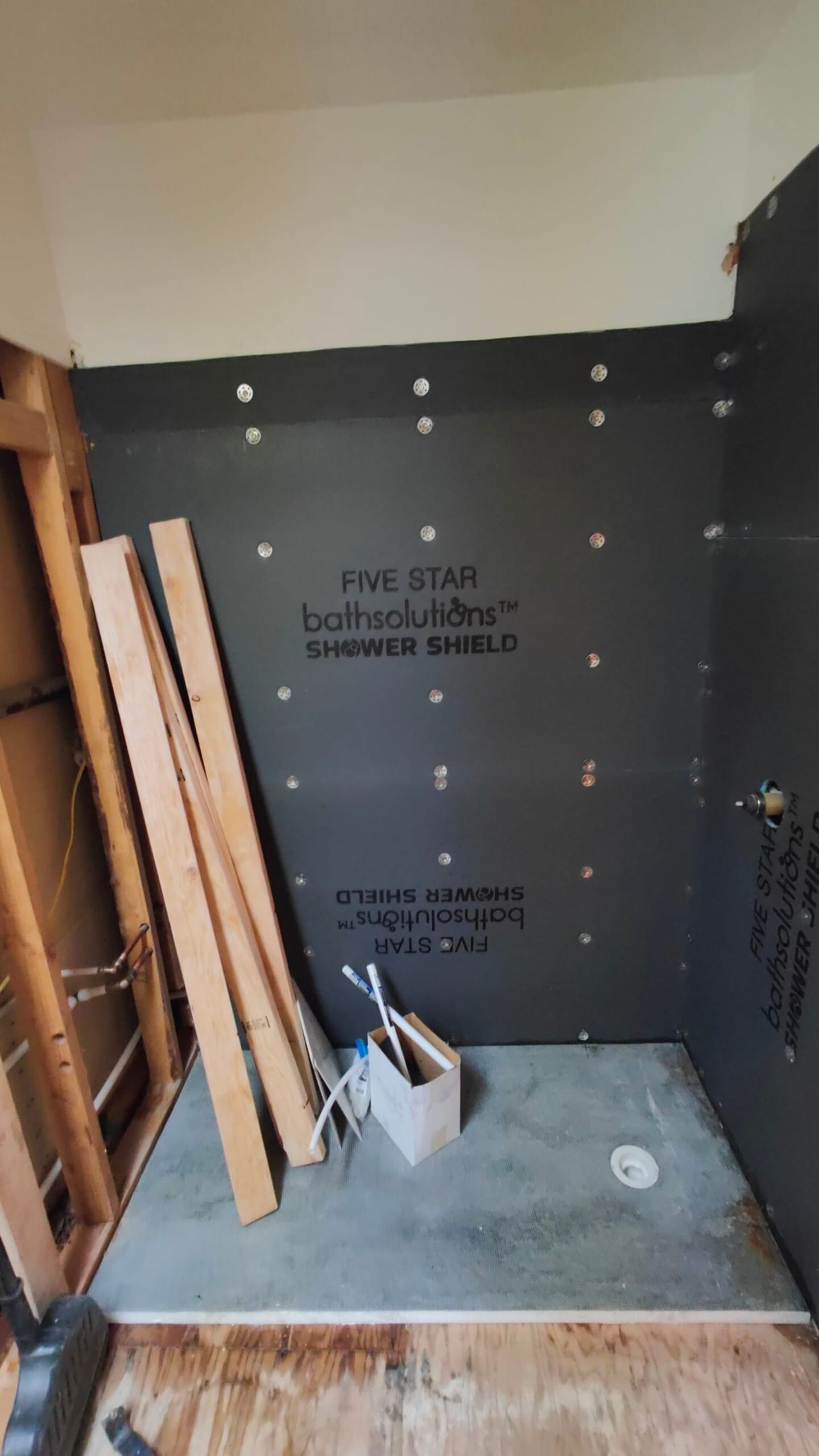 The remodel was performed by Five Star Bath Solutions' in-house installers, all background-checked, drug-tested, and insured. The scope included full demo to the studs, subfloor framing, replacement of plumbing lines, and installation of a custom shower pan matched to the existing space. The team also updated the lighting overhead. Job was completed within the typical two-day window after the projected lead time.