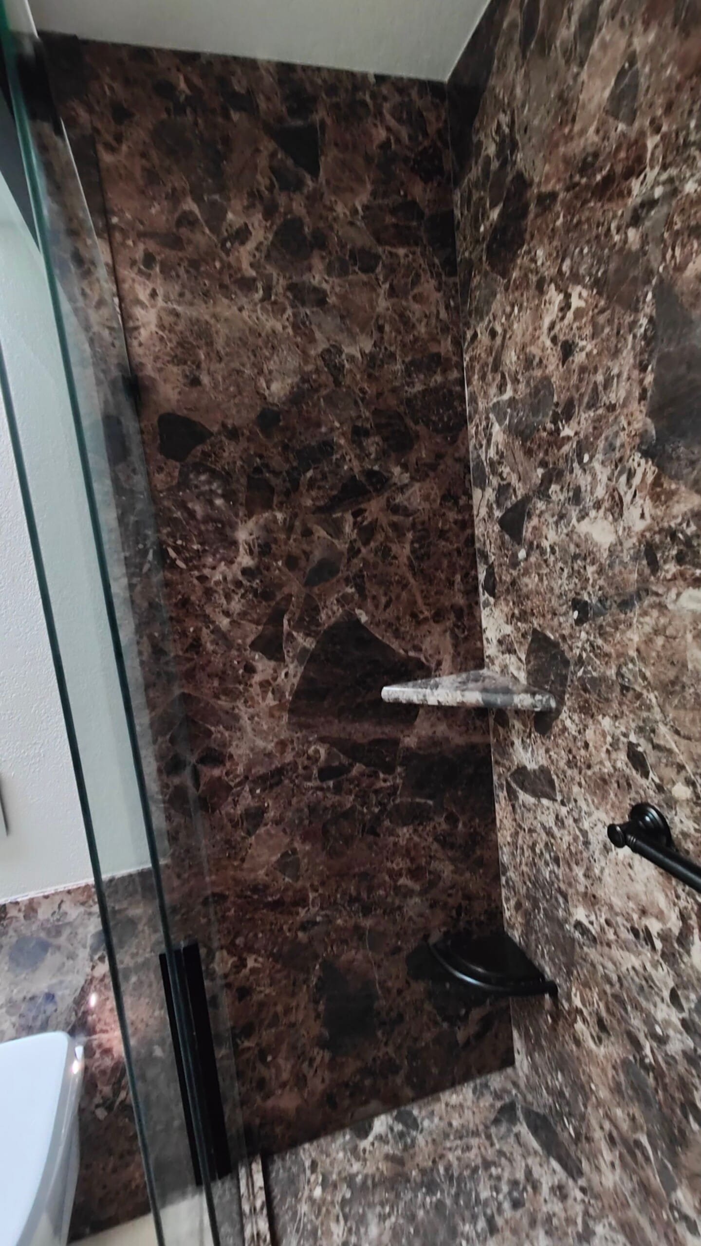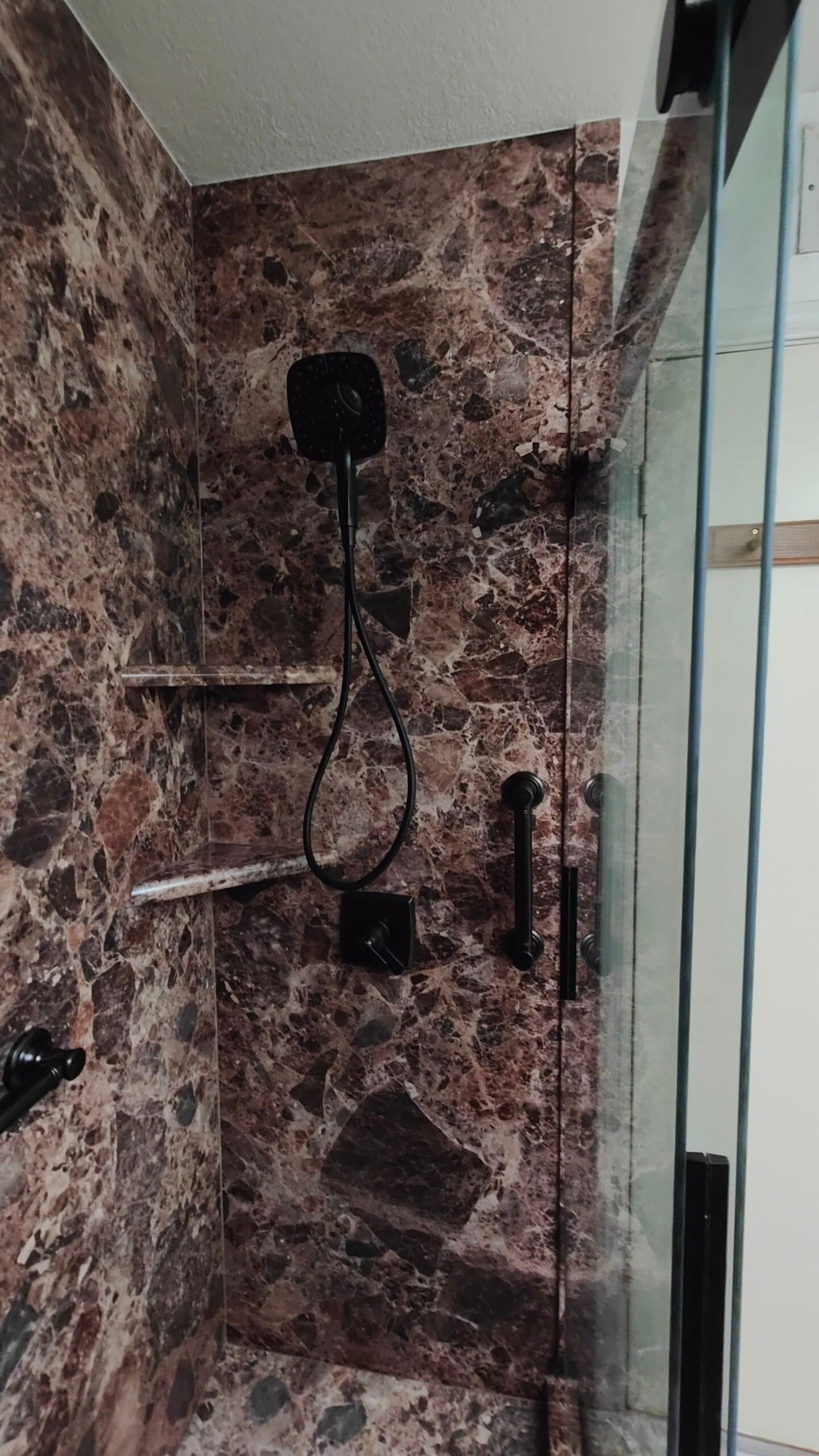 Representative Tabitha Lambert presented the Smart Choice package, featuring grout-free composite panels with antimicrobial protection and scratch resistance. Originally described as chrome, the final installation used matte black hardware across the fixtures and grab bars. Although a pony wall was discussed, full-height glass was used instead, paired with a built-in corner bench and dual corner shelves for storage. Tabitha clarified that one-piece low-cost units would not fit the layout, reinforcing the value of the custom panel system.