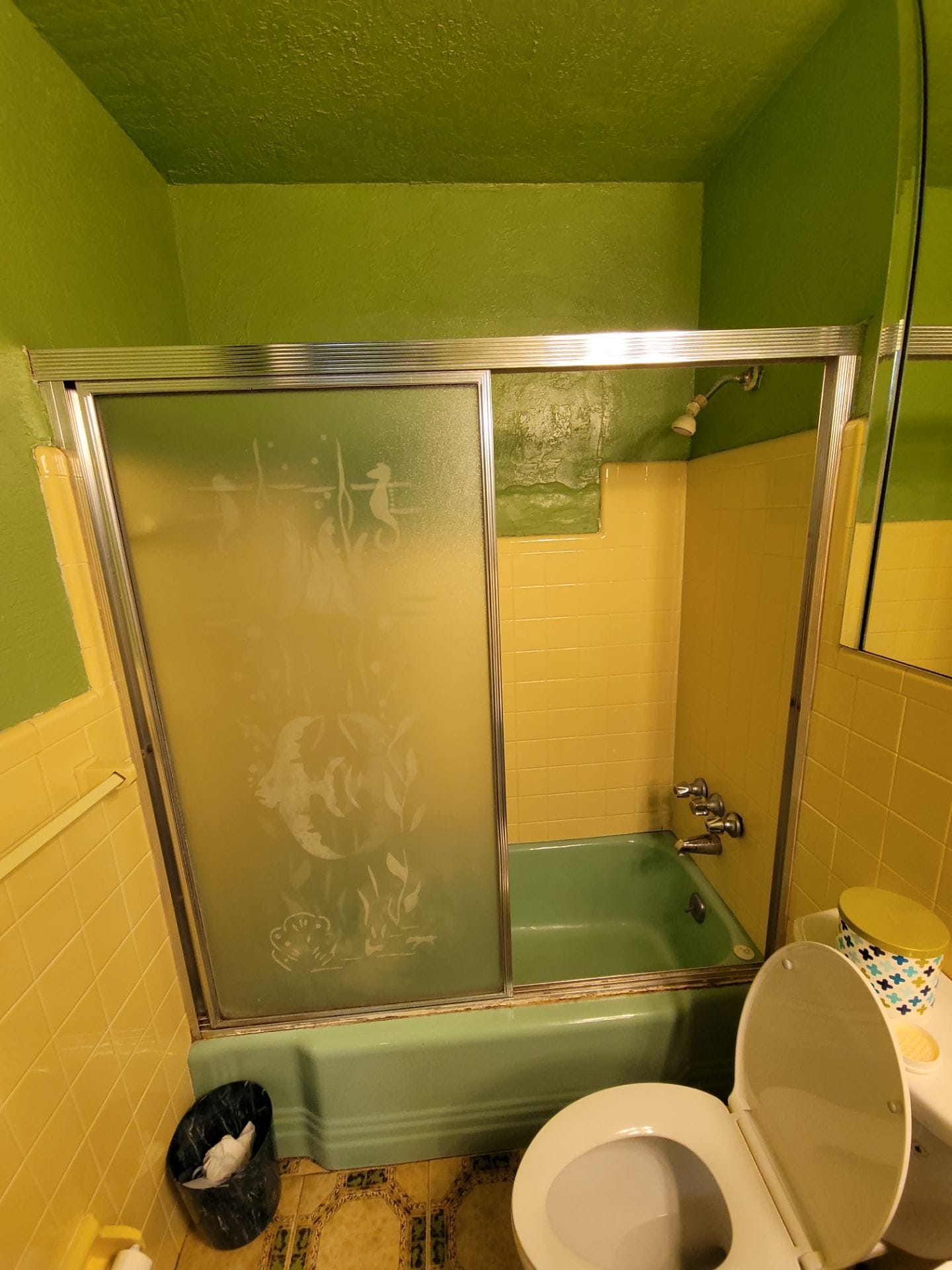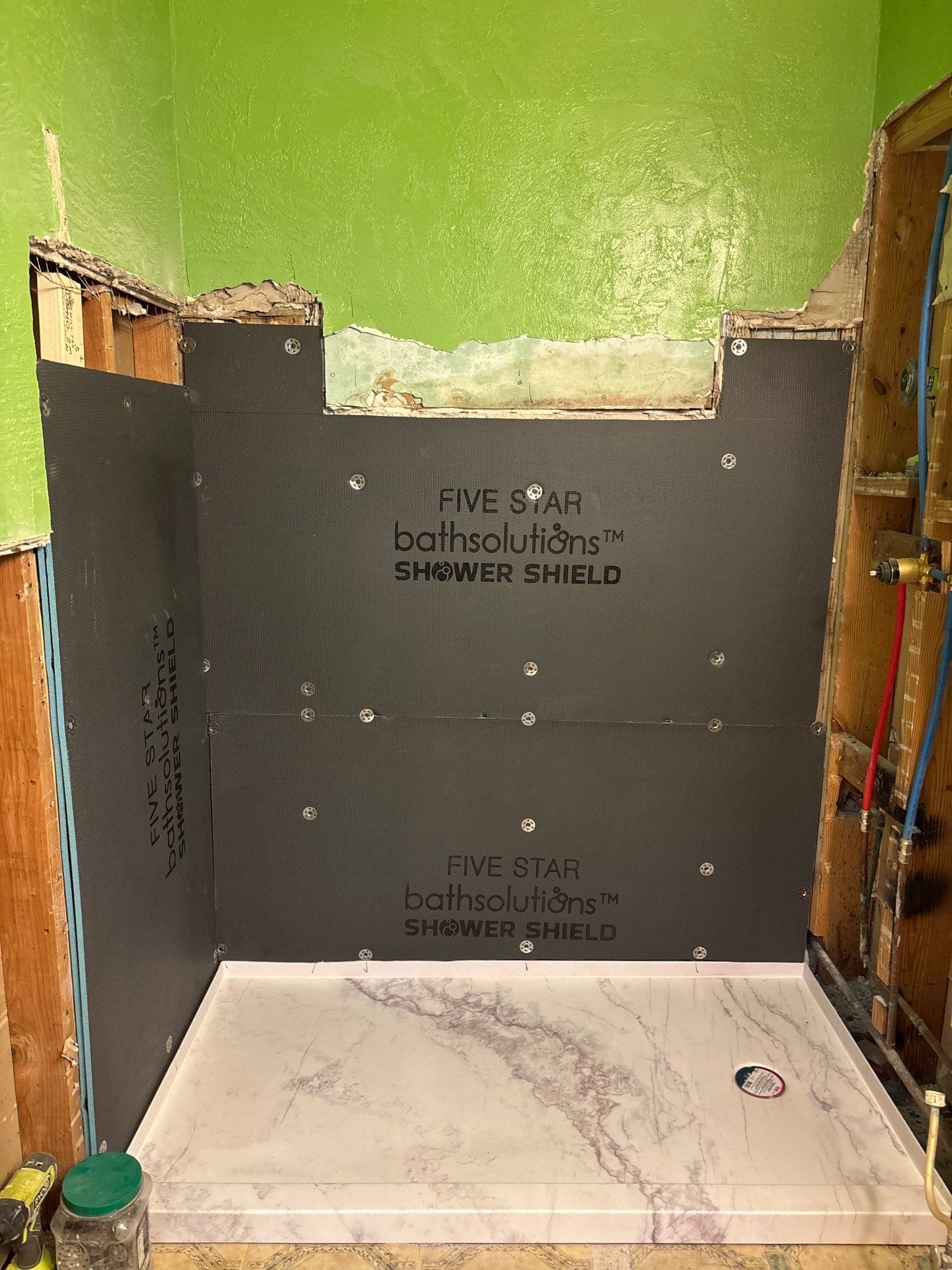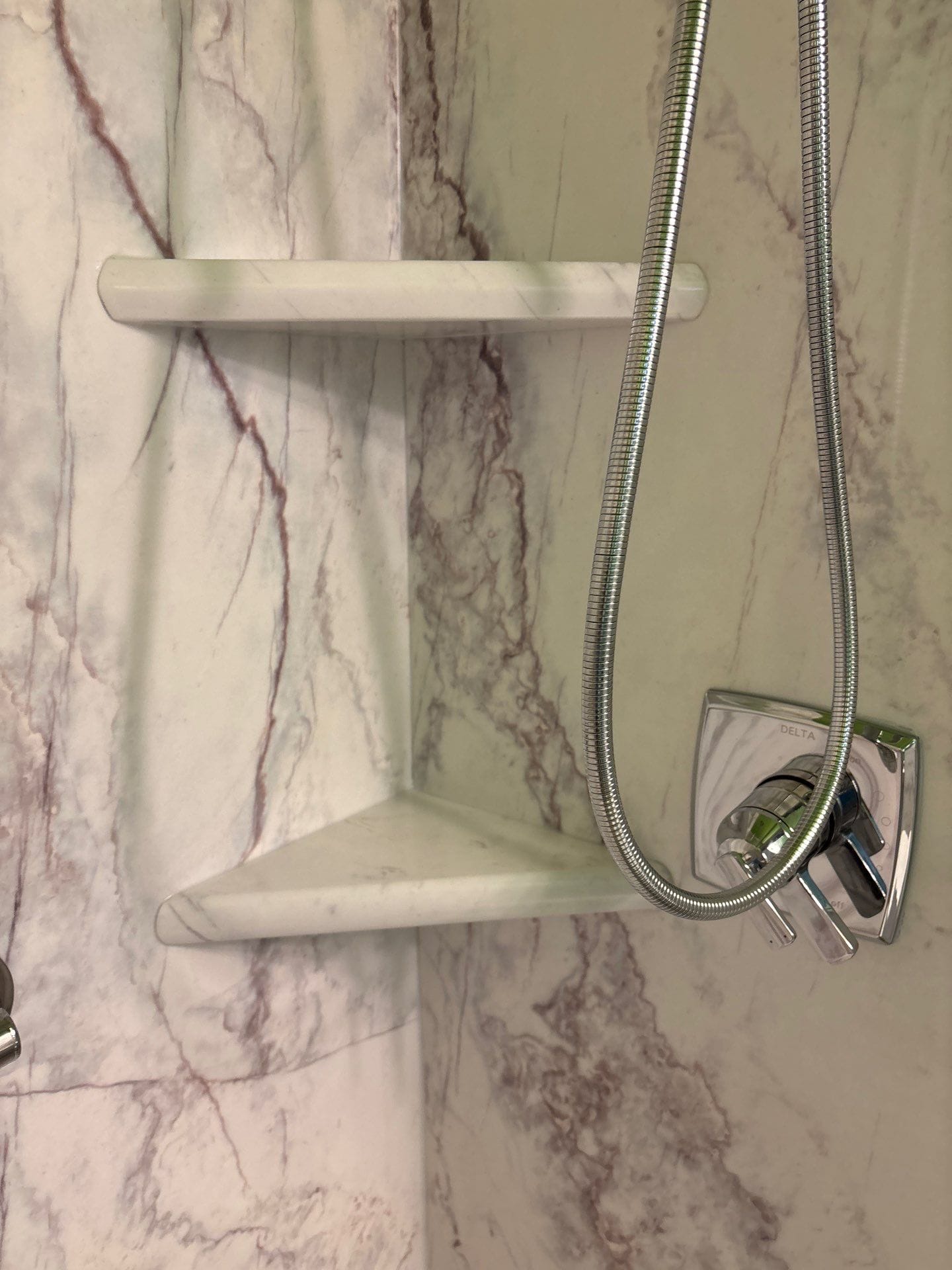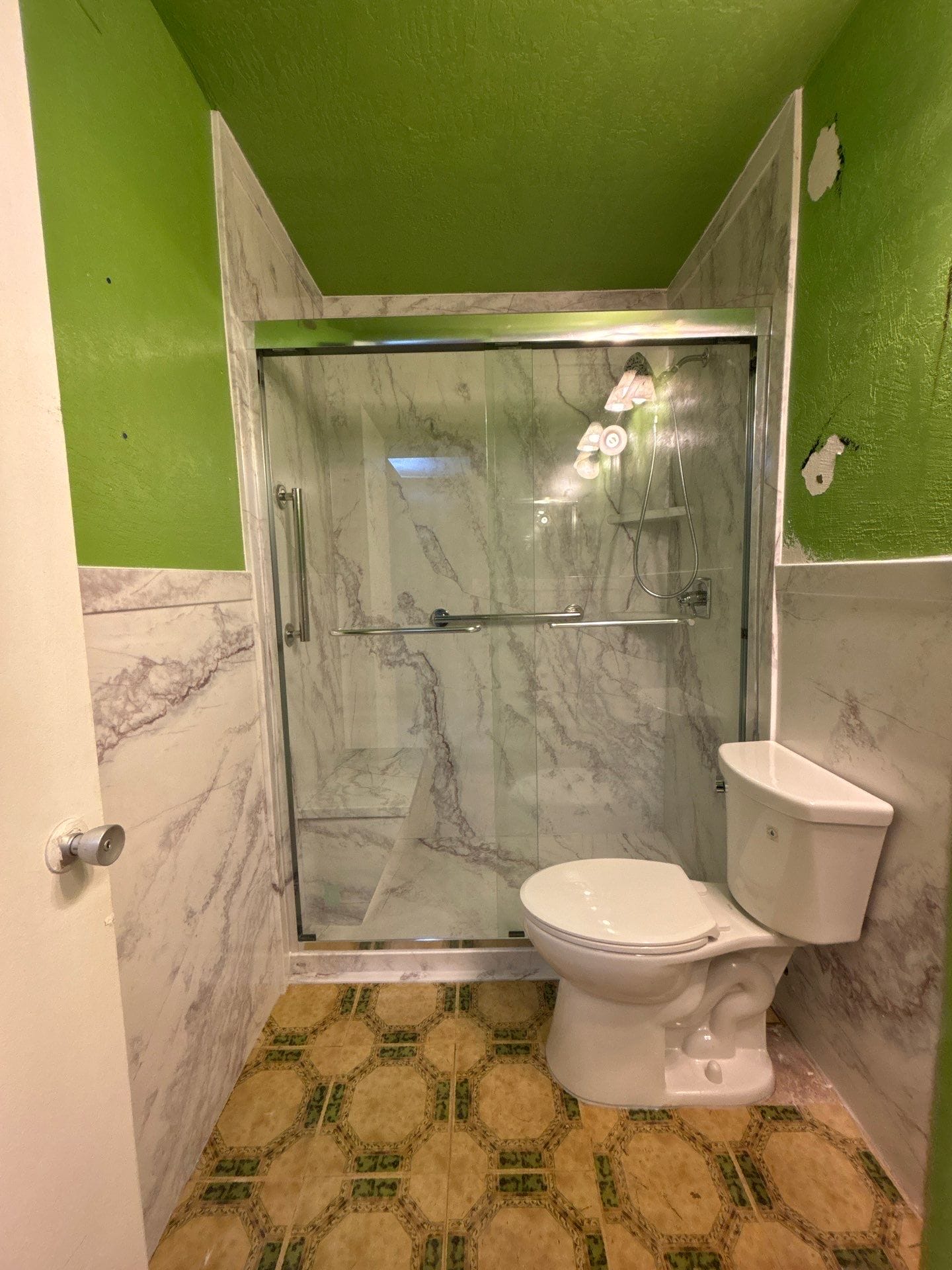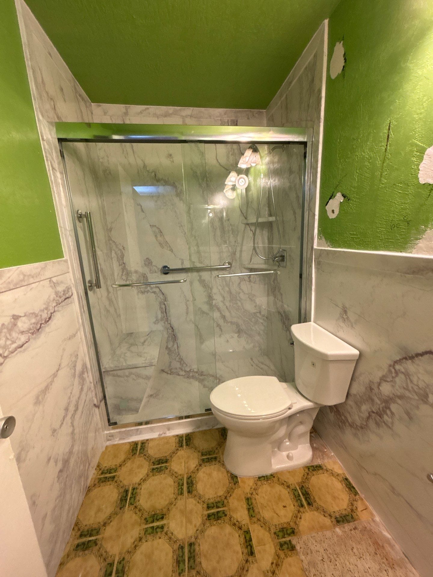 Installation was completed in two days. The crew removed the original tub and wall tile, performed necessary repairs, and installed a thermal-insulated base followed by the composite panels and accessories. A built-in bench was included for seated use, along with a horizontal grab bar on the wall and two corner shelves. A frameless sliding bypass glass door with stainless-steel hardware was added to improve accessibility and visual clarity. The original flooring and toilet were retained, and the entire worksite was cleared of debris without the use of exterior dumpsters.