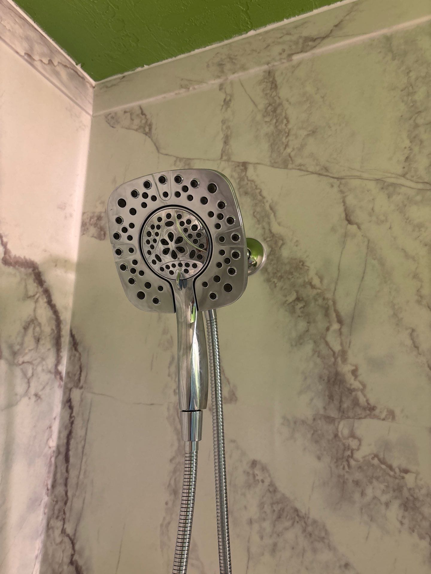 The company introduced a six-layer composite system with antimicrobial properties and a scratch-resistant surface. This grout-free solution eliminates mold concerns while maintaining a clean marble appearance. The panels were installed over a waterproof DensShield backer with quad-lock corners for watertight performance. The Calacatta White finish was selected to brighten the space and complement the green wall color, while chrome fixtures—including a handheld showerhead, trim, and shelving—were chosen for durability and style consistency.