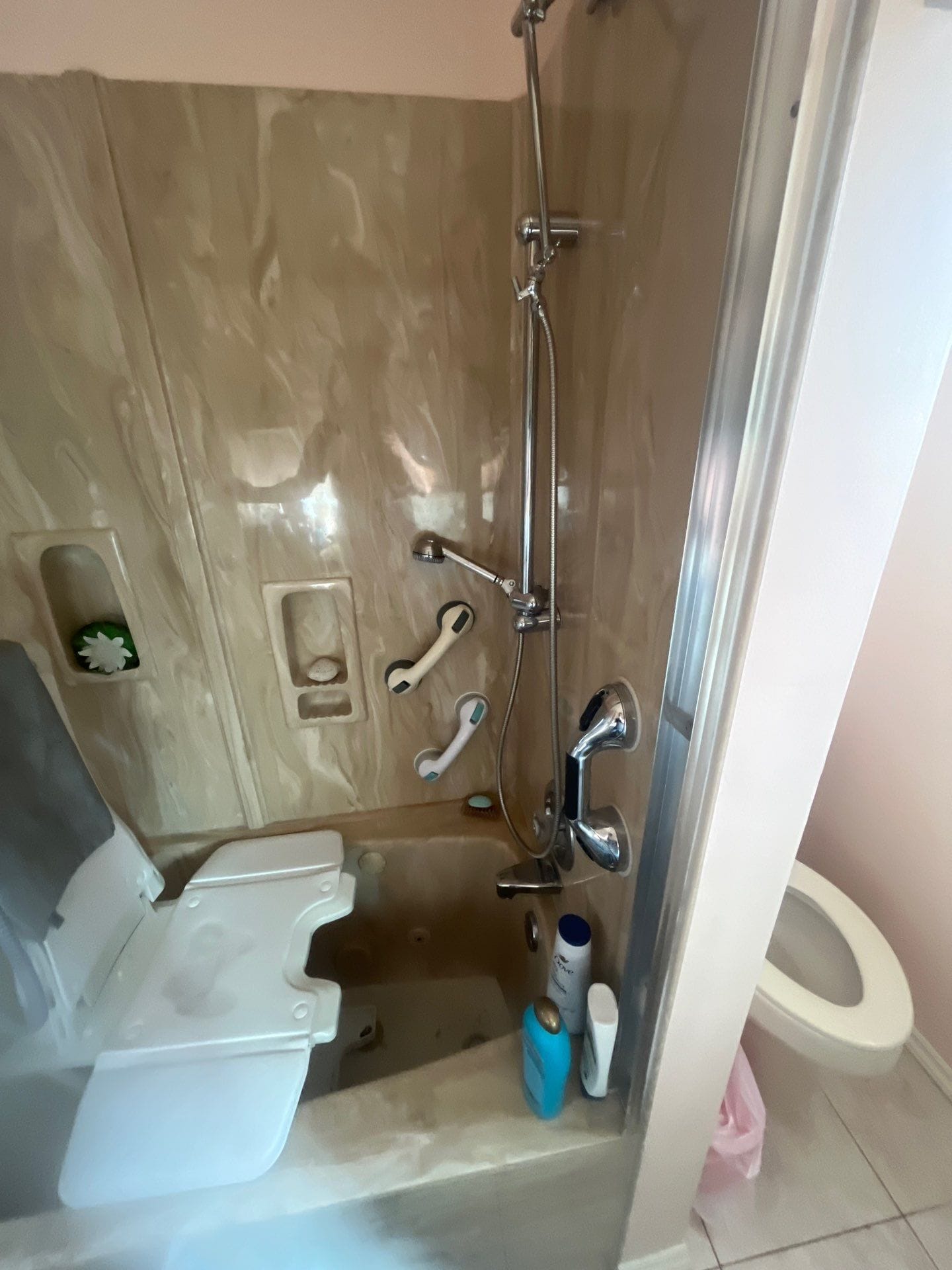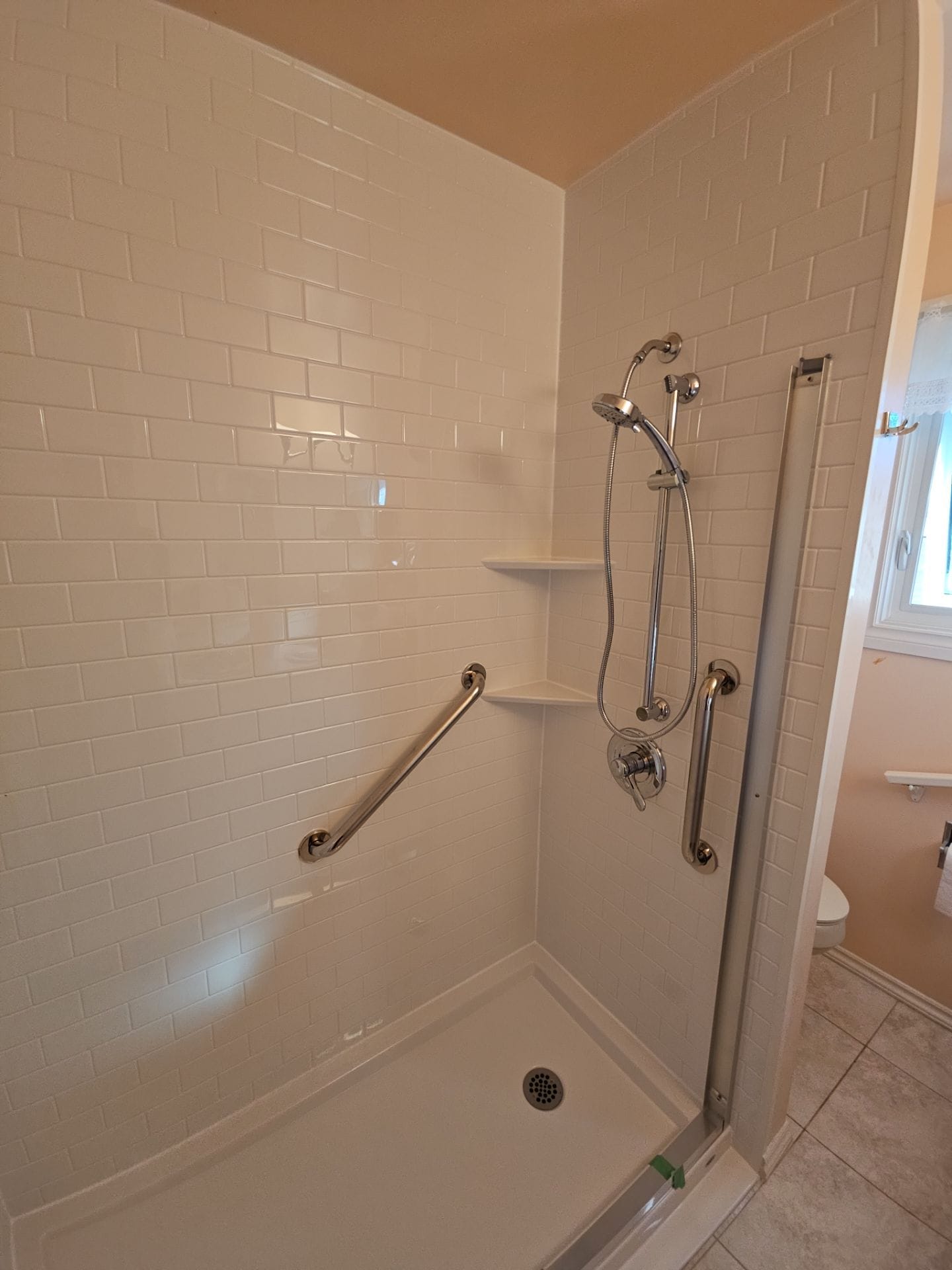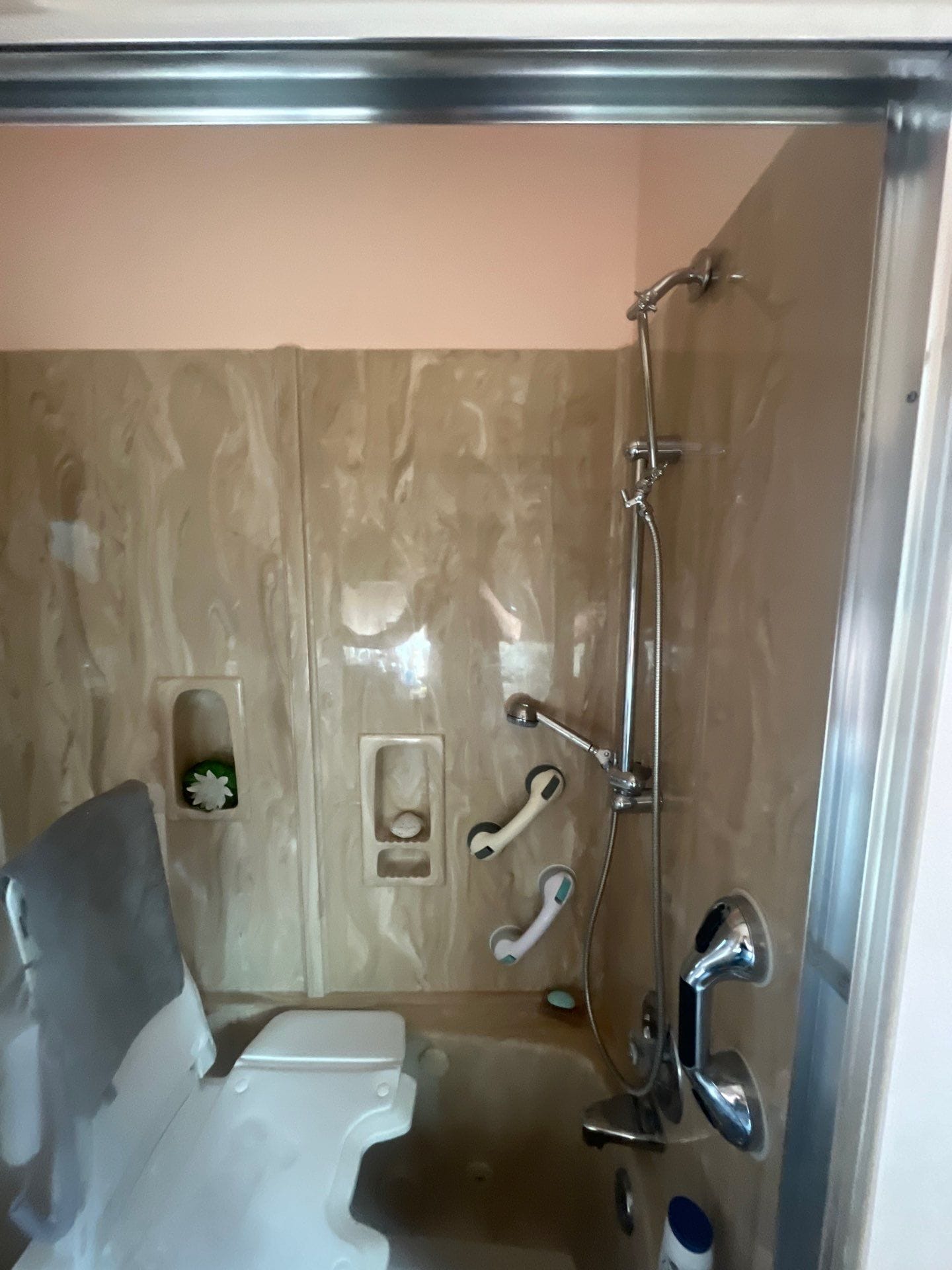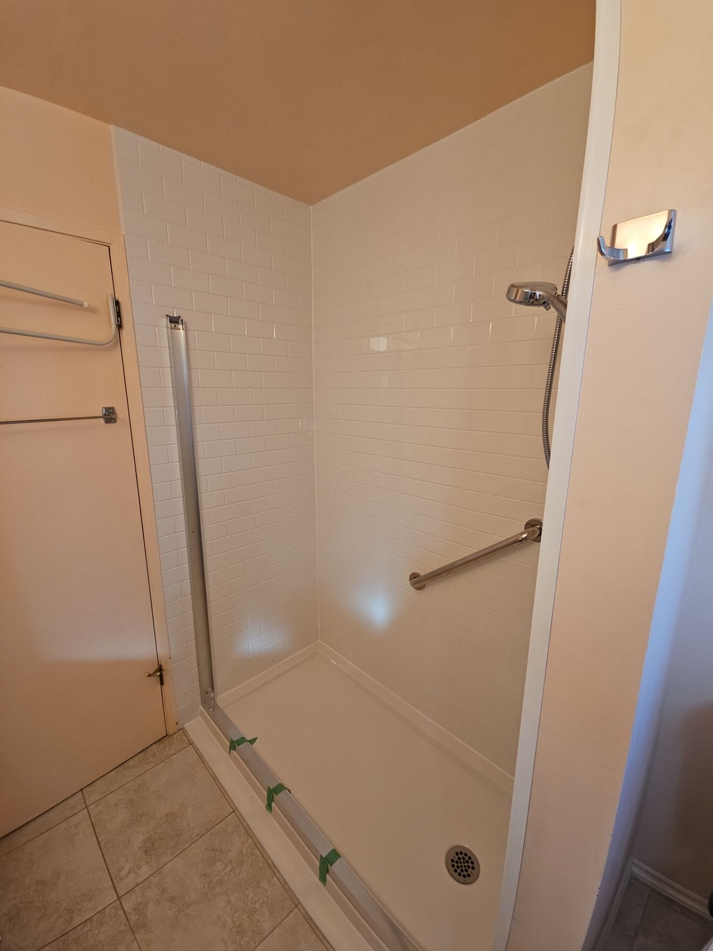 Installation involved full removal of the original tub and wall system down to the studs and subfloor with inspection for moisture damage. New PEX plumbing, cement board waterproofing, and seamless wall panels were installed. Grab bars and all accessories were anchored directly to solid backing. Work was completed over two days. Protective runners were used throughout to safeguard adjacent flooring and walls during demo and installation.
