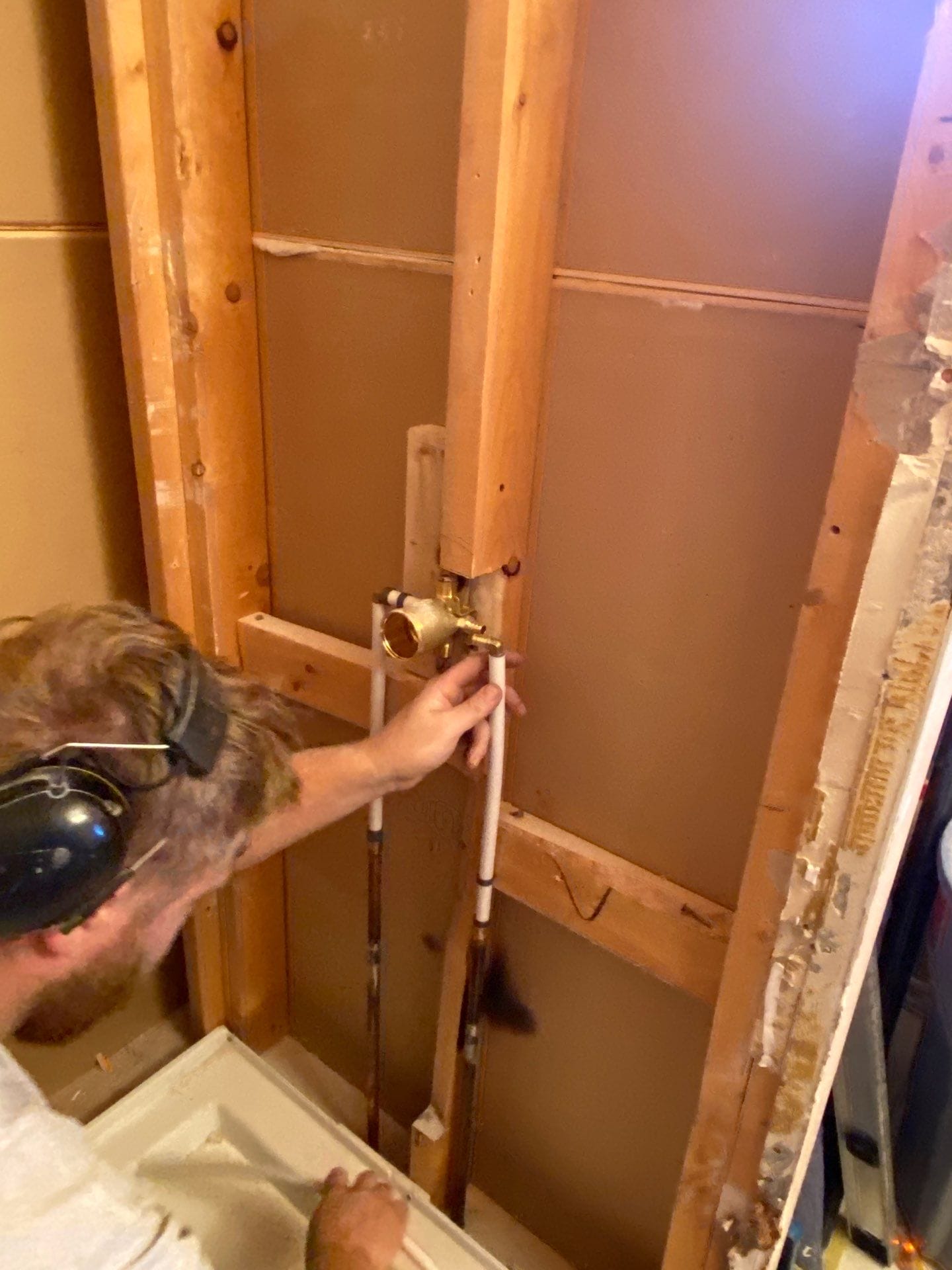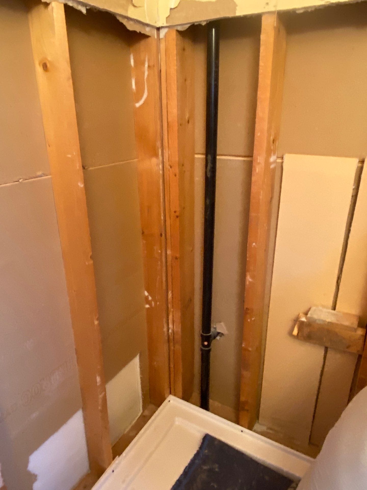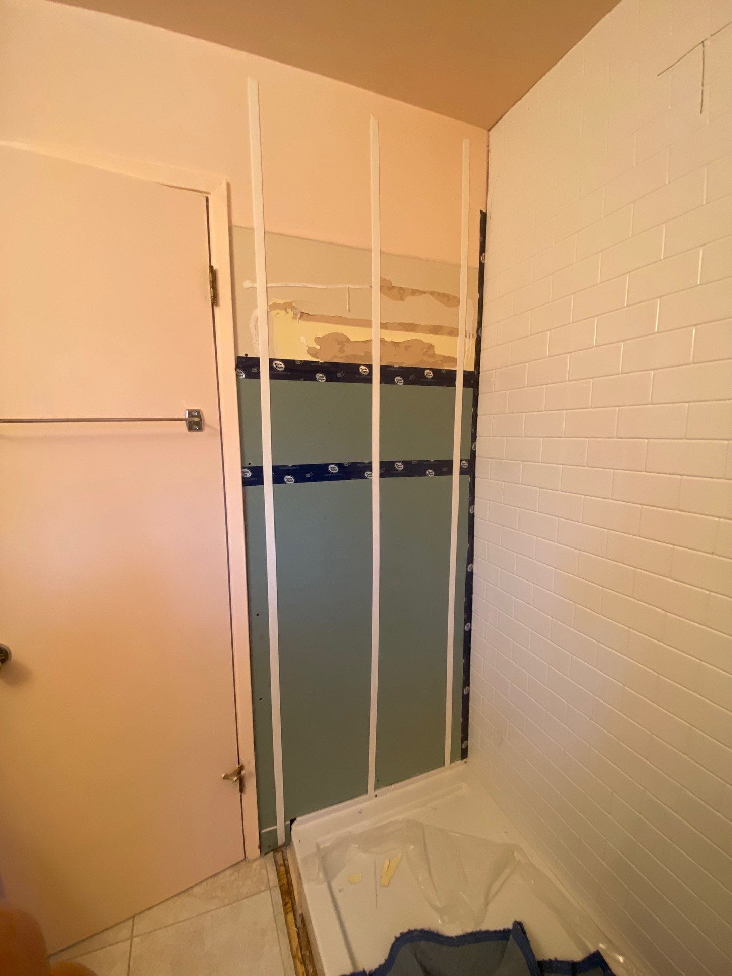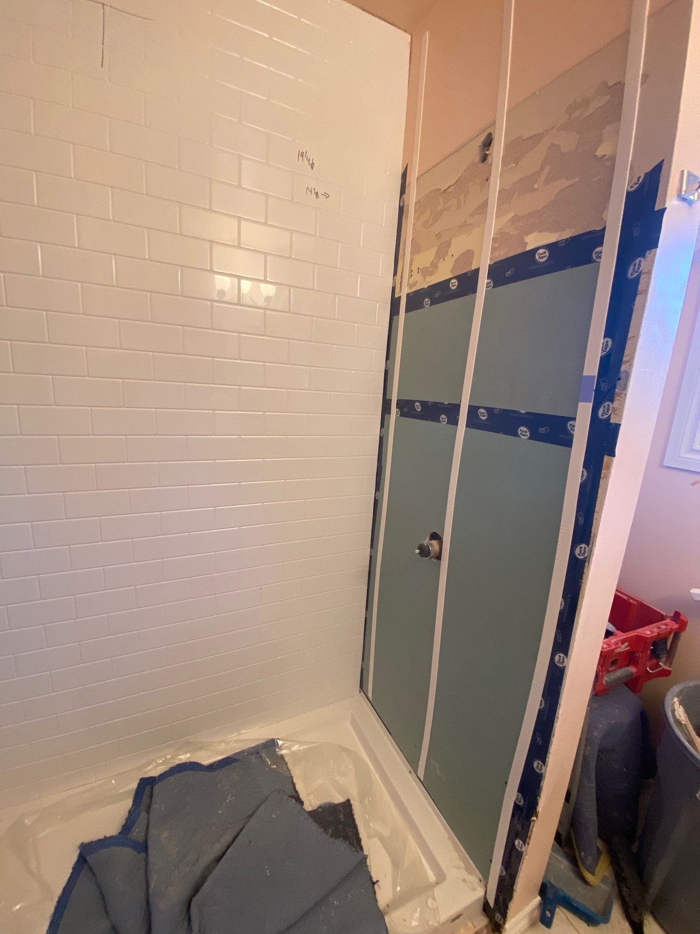 Installation involved full removal of the original tub and wall system down to the studs and subfloor with inspection for moisture damage. New PEX plumbing, cement board waterproofing, and seamless wall panels were installed. Grab bars and all accessories were anchored directly to solid backing. Work was completed over two days. Protective runners were used throughout to safeguard adjacent flooring and walls during demo and installation.
