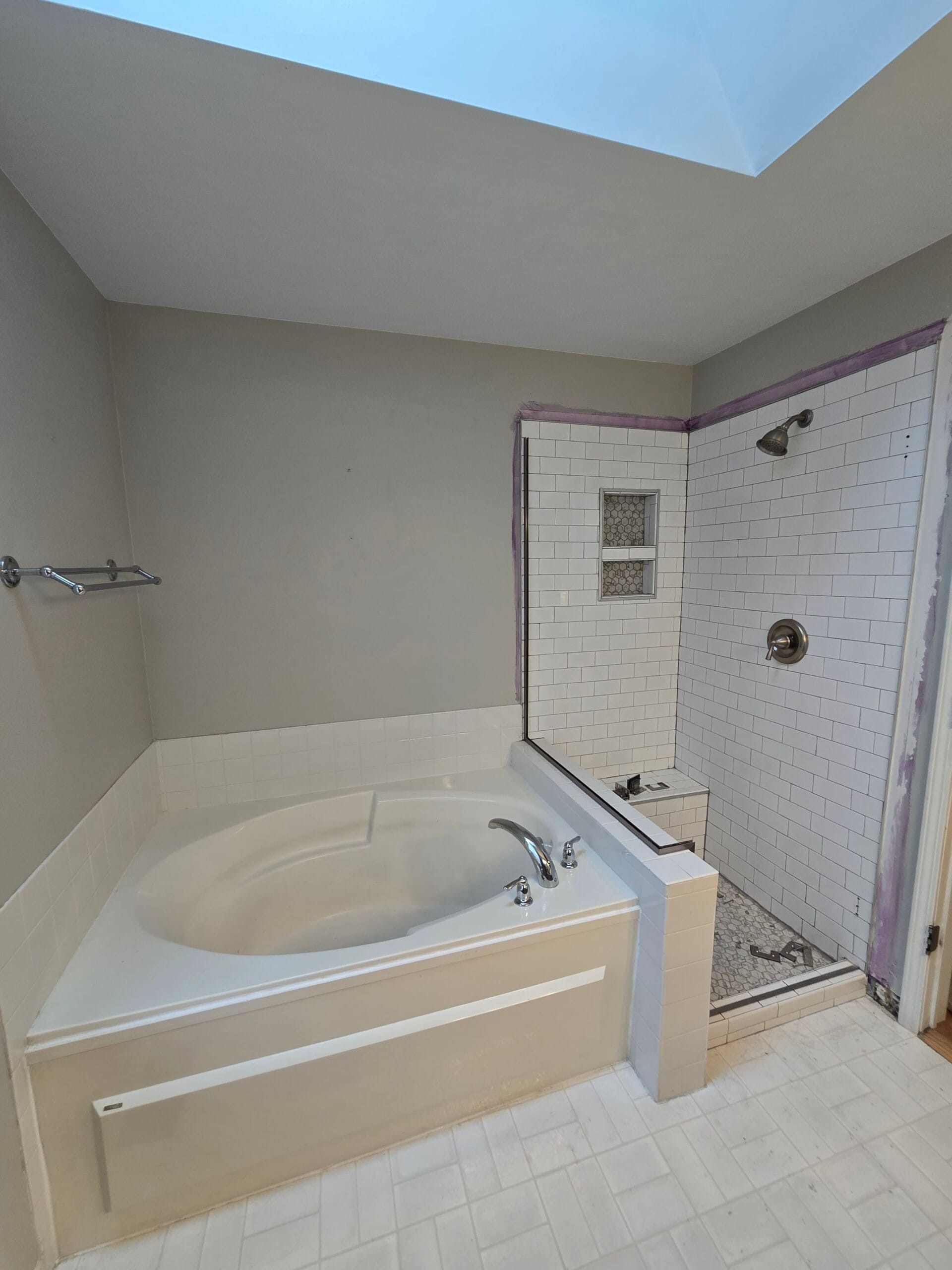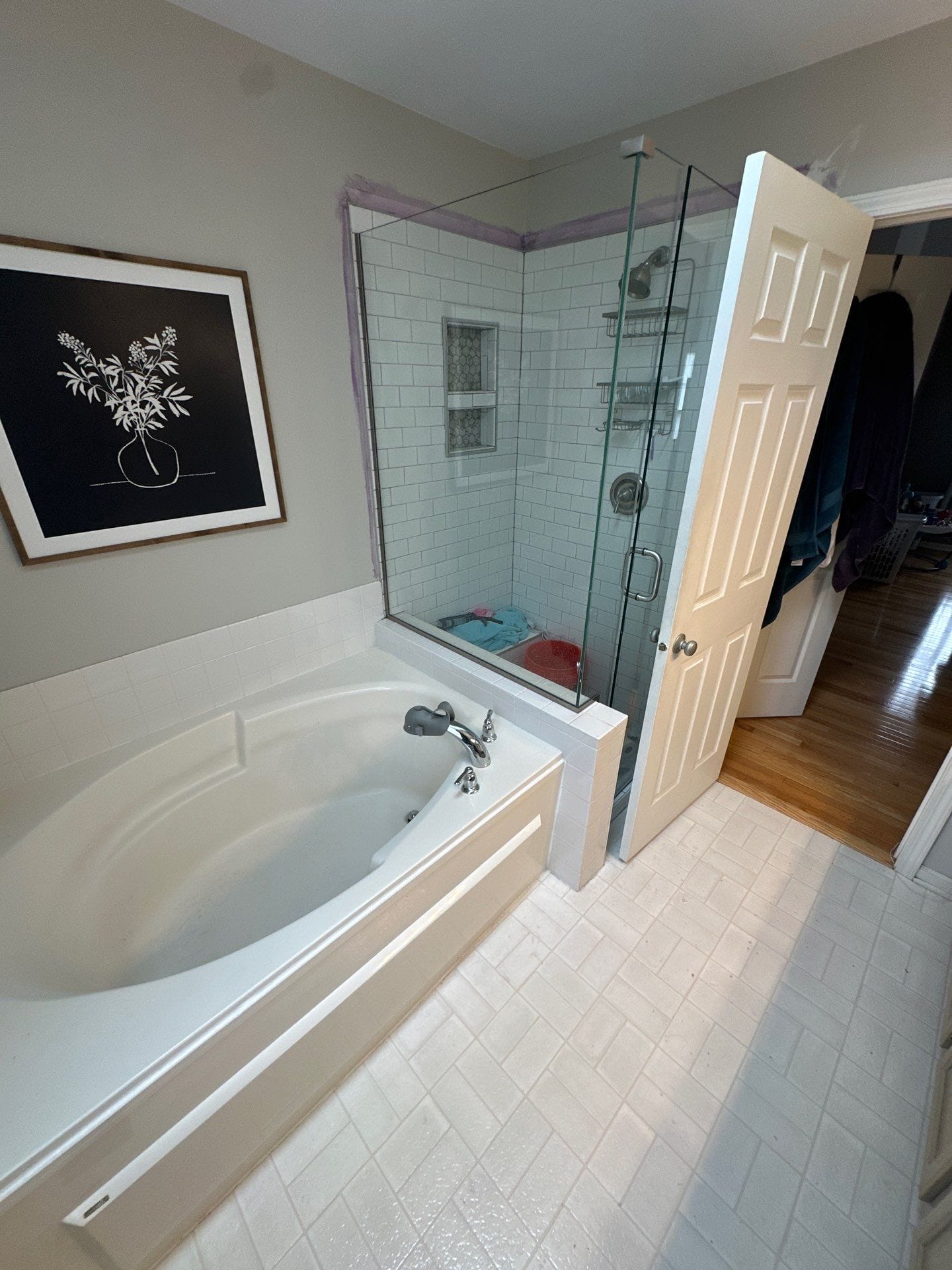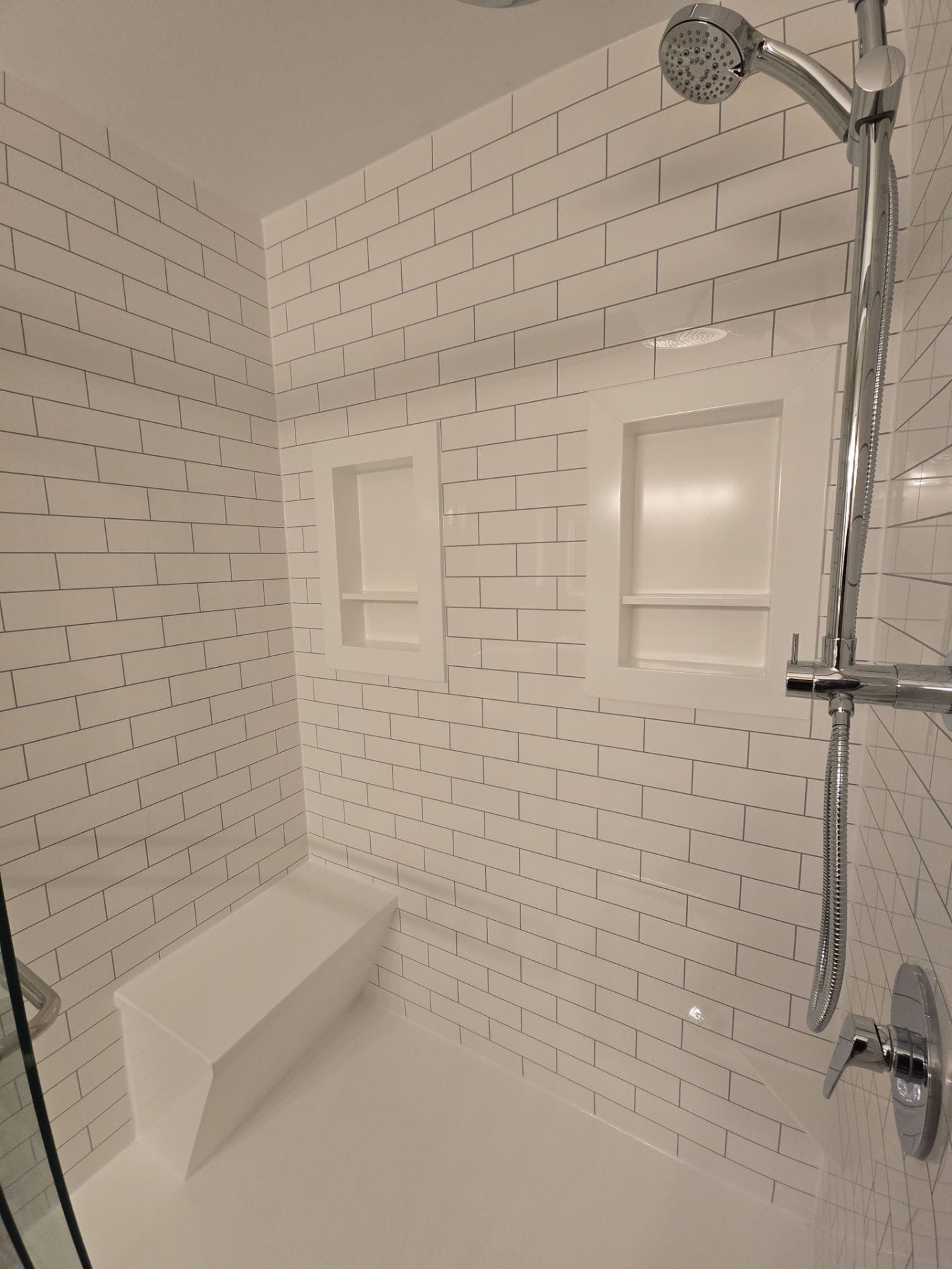 Matthew detailed a step-by-step installation overview, beginning with full demolition and subfloor prep, followed by code-compliant plumbing adjustments and moisture barrier installation. Reinforcement was added for the angled grab bar and bench, with final hardware including a built-in bench seat, sliding glass door, and chrome handheld plus overhead shower combo. Final touches included dual recessed wall niches for personalized storage. A protective floor runner was used throughout the project, and wall placement was confirmed on-site prior to sealing with antimicrobial silicone. The process ensured that another bathroom remained functional during the installation.