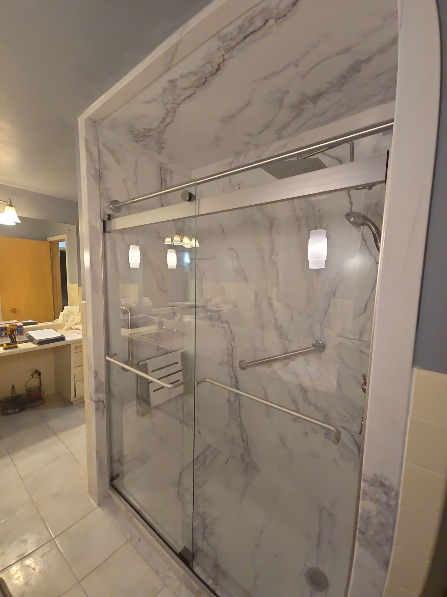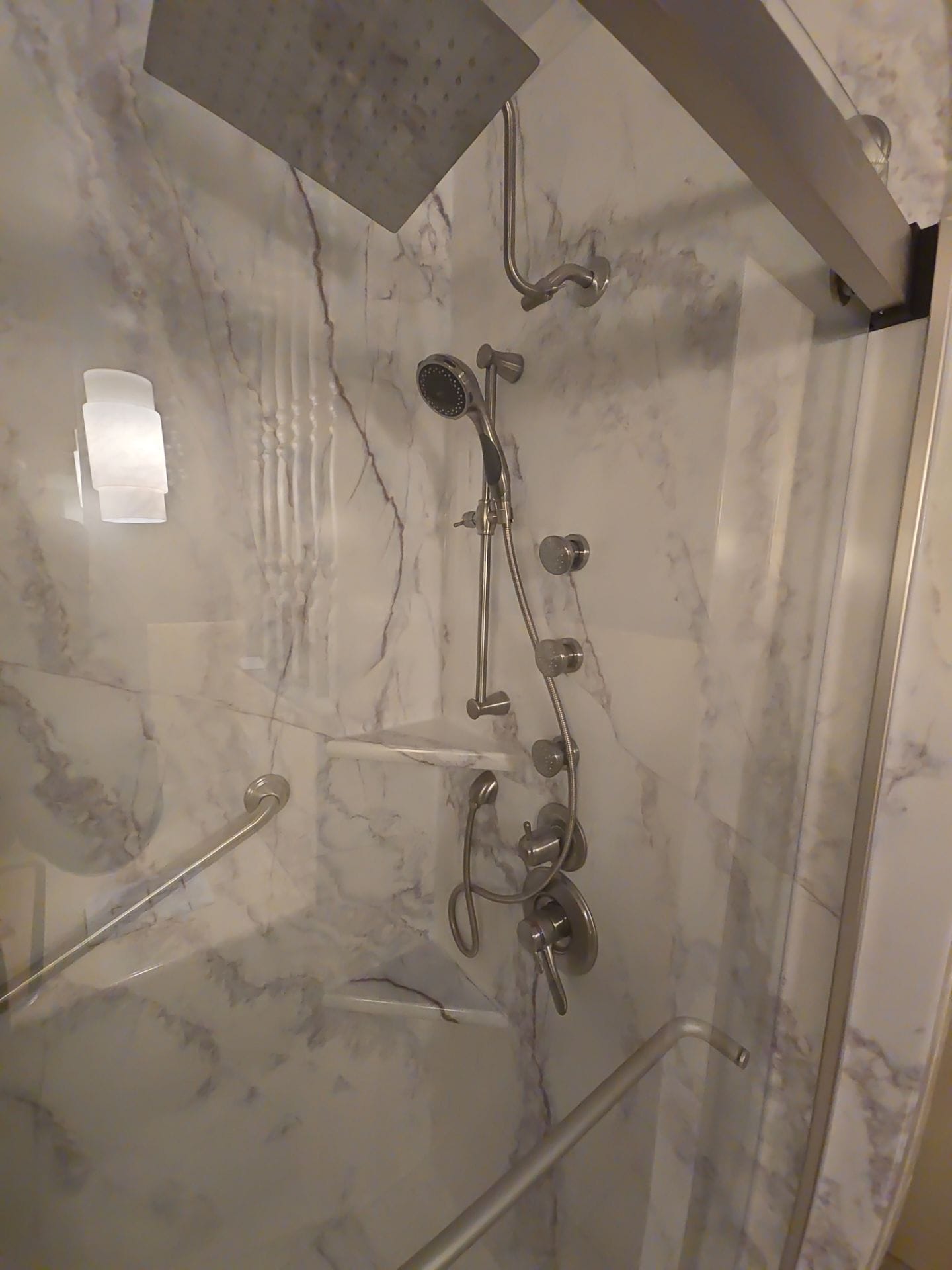 The Five Star Bath Solutions representative presented a grout-free wall panel system designed for durability and simplified maintenance. The selected design incorporated Botticino cream composite wall panels that provide a light marble appearance while remaining antimicrobial and easy to clean. Brushed nickel fixtures were selected to coordinate with the existing bathroom finishes. The shower design included multiple integrated storage shelves, a folding wall-mounted seat, and a brushed nickel grab bar for additional support. A frameless sliding glass enclosure was installed to create a clean, modern appearance while maintaining visibility and openness within the shower space.