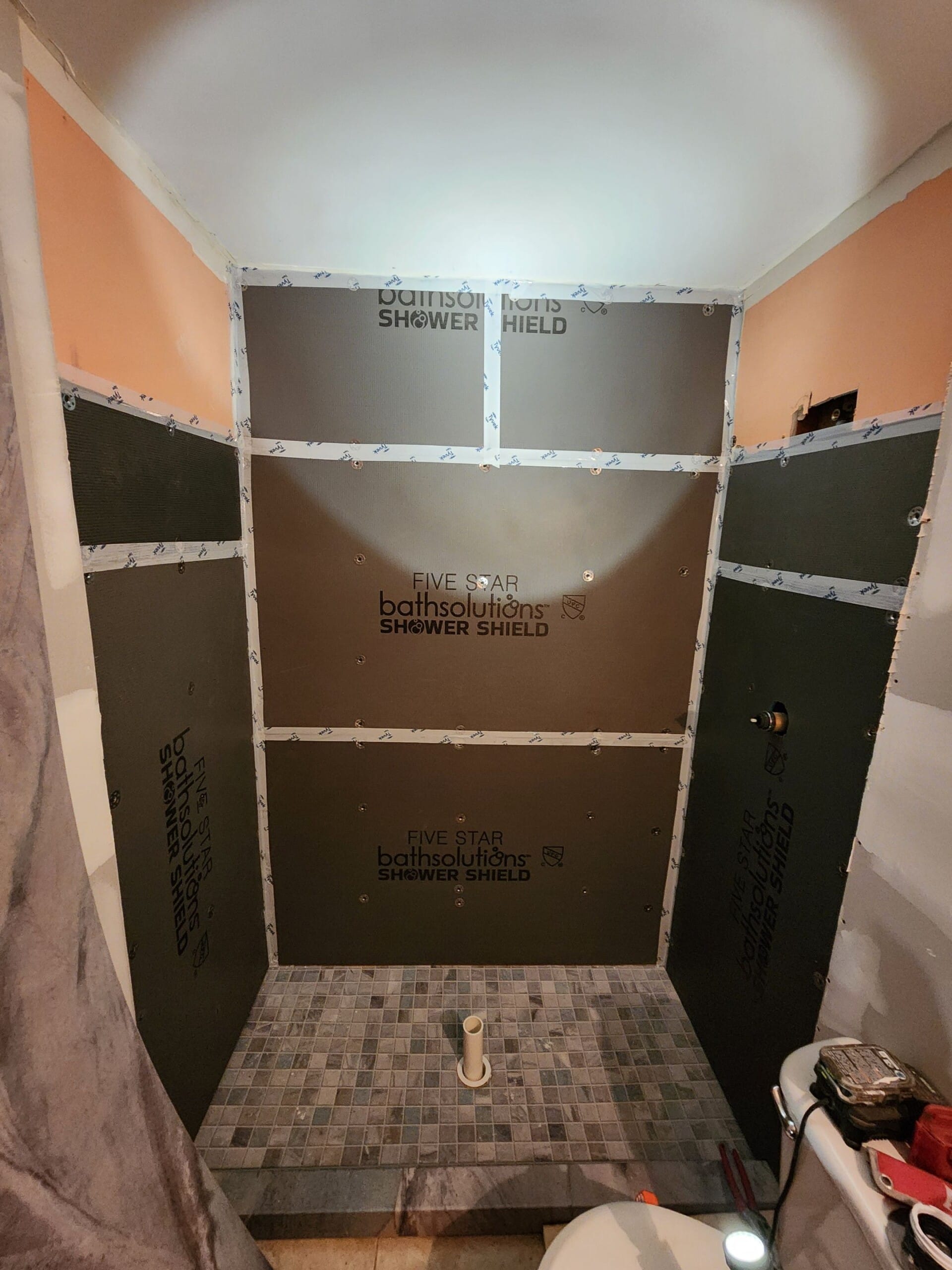 The Five Star Bath Solutions representative presented the Smart Choice composite wall system in a high-contrast stone-inspired pattern. These panels are engineered to resist mold and mildew while offering a natural stone appearance without the upkeep. Brushed nickel Delta fixtures were selected, and a framed glass sliding door was chosen to maintain a simple, functional design. The representative emphasized the company’s history of A+ BBB accreditation and explained that all installers are fully trained and vetted employees rather than subcontractors.