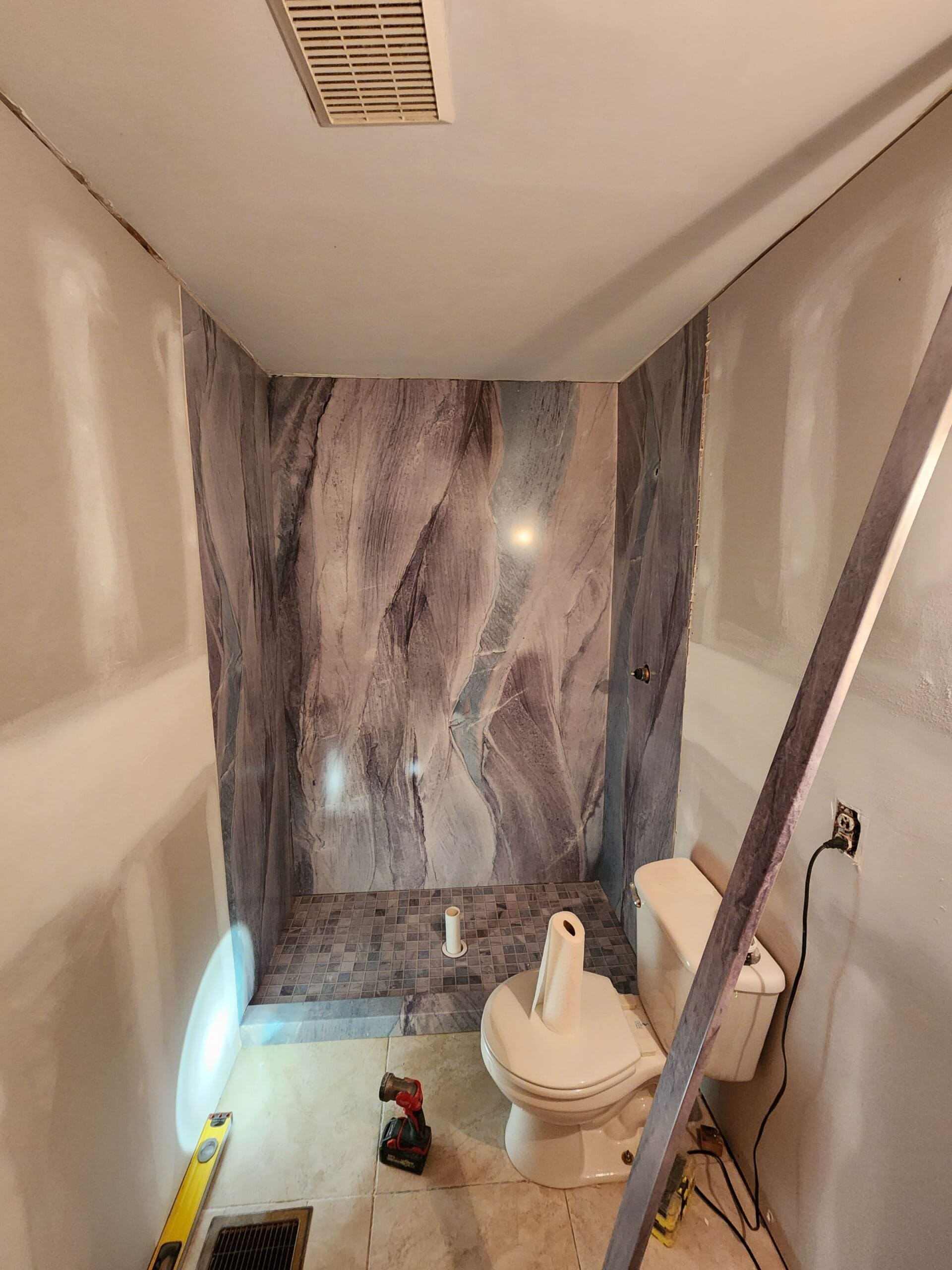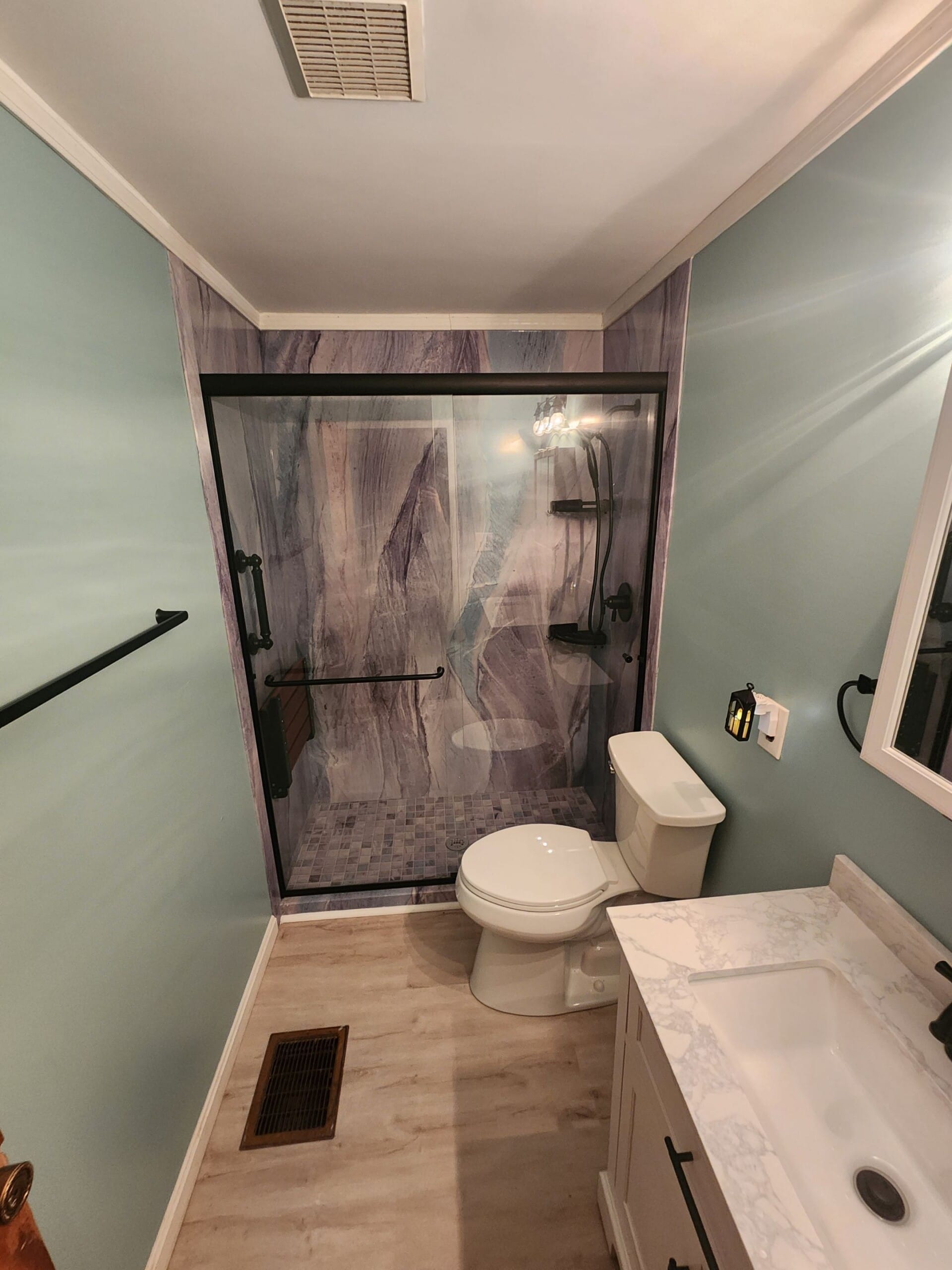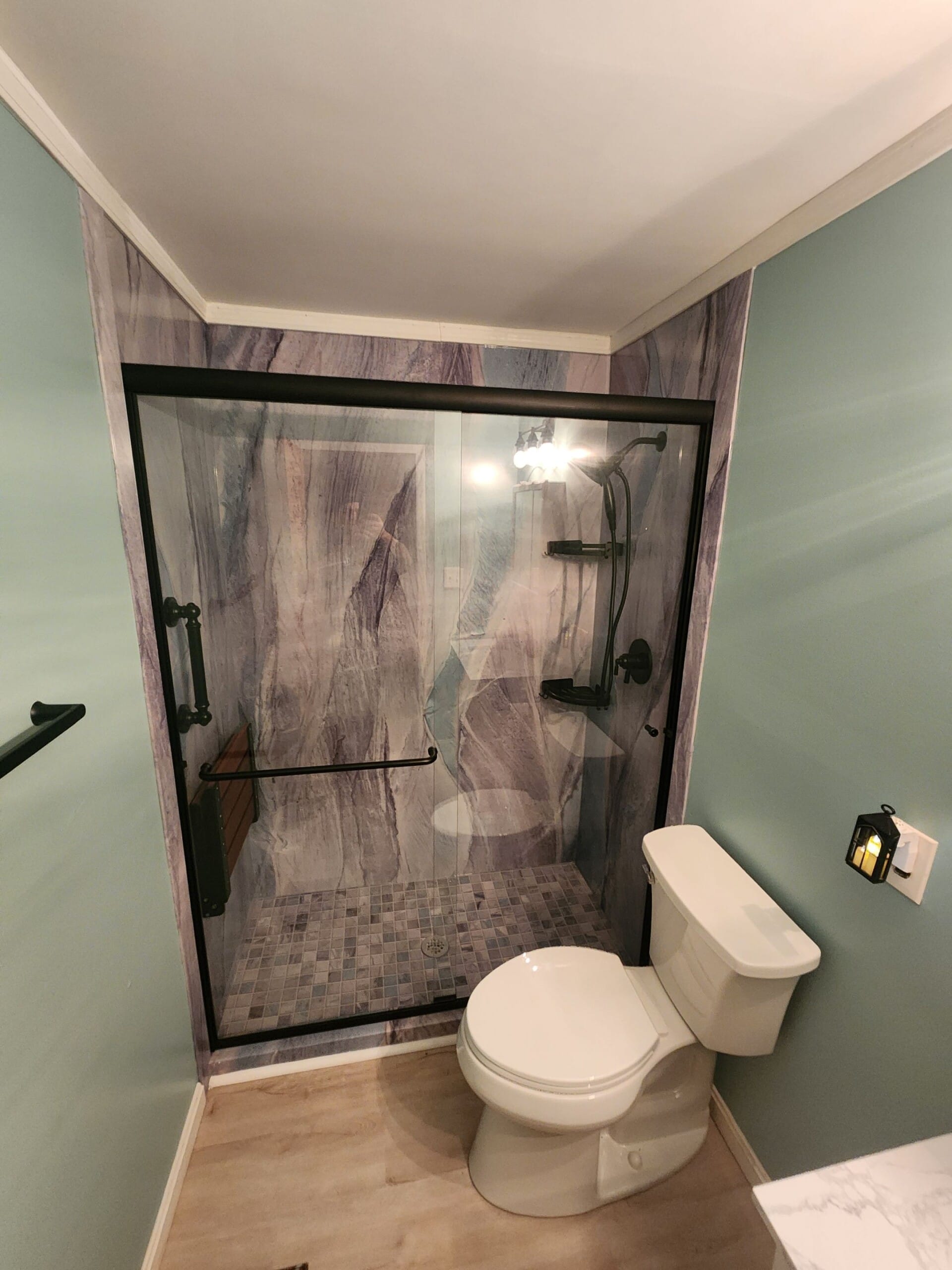 Installation followed a two-day schedule, beginning with the removal of the existing fiberglass tub and surround down to the studs. Damaged areas were repaired at no additional cost, and a new waterproof, thermal-insulated shower base was installed to support long-term durability. Smart Choice wall panels were placed with reinforced backing for grab bars and shelving, while a fold-down bench was added to support seated use. Finishing touches included antimicrobial silicone sealing, a new matte-black framed sliding glass door, and complete debris removal before final walkthrough.