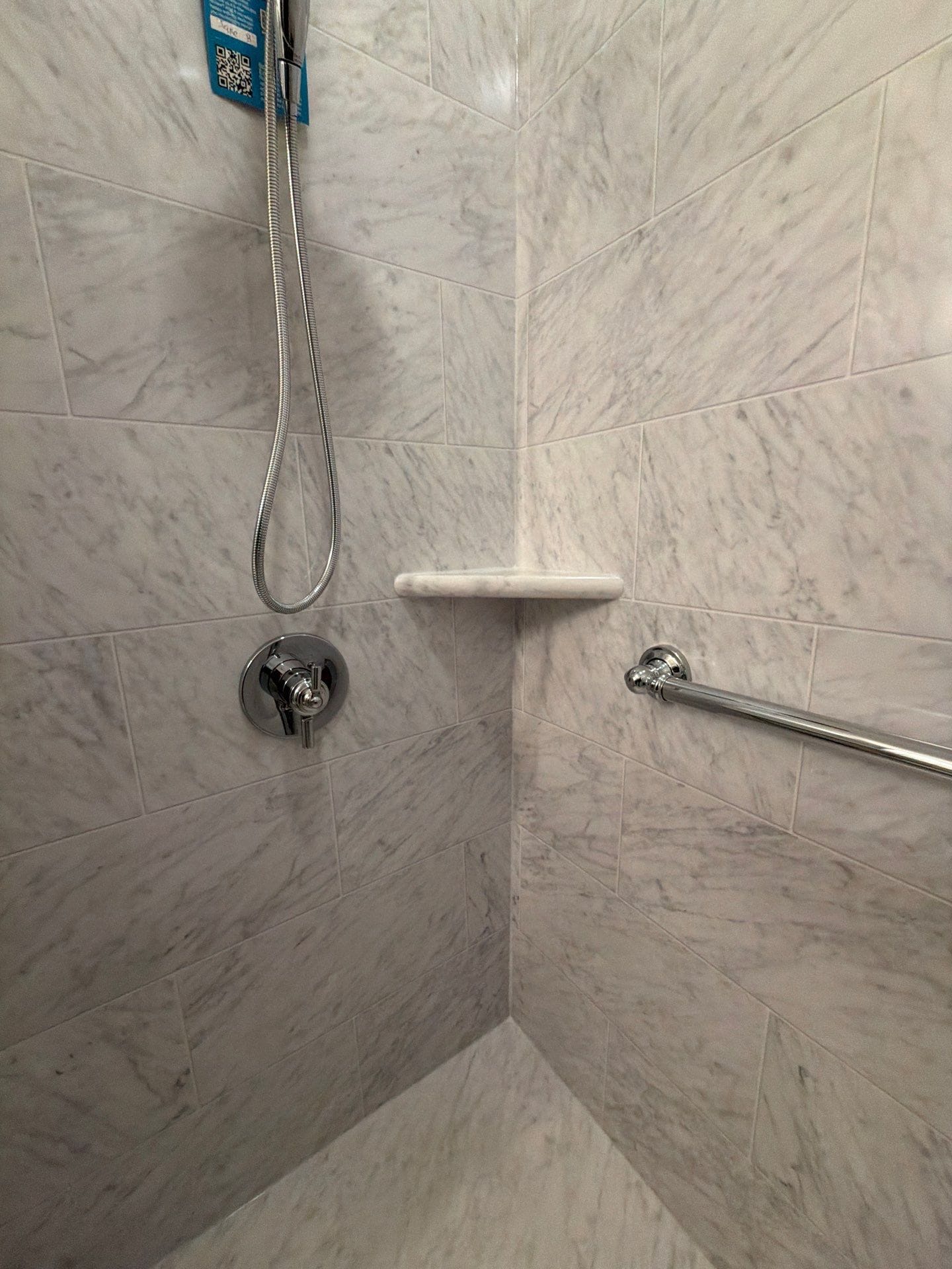 Installation began with removal of the existing shower enclosure, glass doors, and surrounding materials to allow full inspection of the structure and plumbing behind the walls. After preparation of the space, a reinforced low-threshold shower base was installed along with waterproof backer board, new plumbing connections, fixtures, and wall panels. The completed walk-in shower features marble-pattern composite wall panels, integrated corner shelving, horizontal grab bars for stability, a wall-mounted fold-down bench seat, and a handheld shower head. The installation process follows a structured approach that begins with design selections and measurement verification by a project manager before scheduling installation. From project approval to installation typically spans six to eight weeks, and once work begins the installation is generally completed within one to two days.